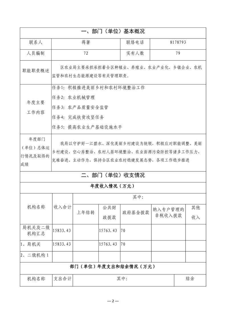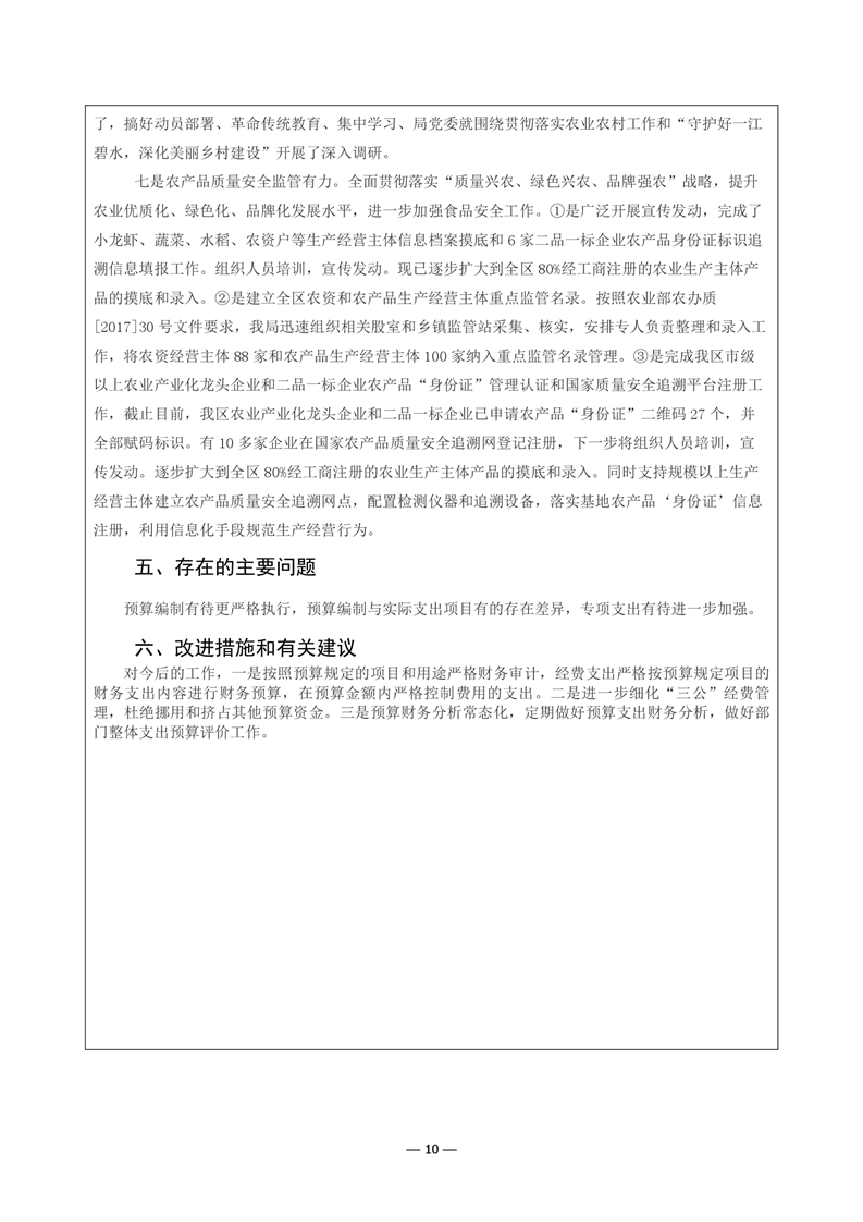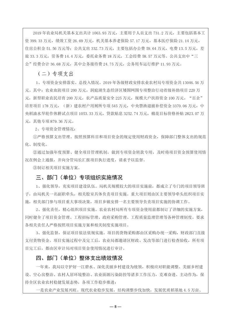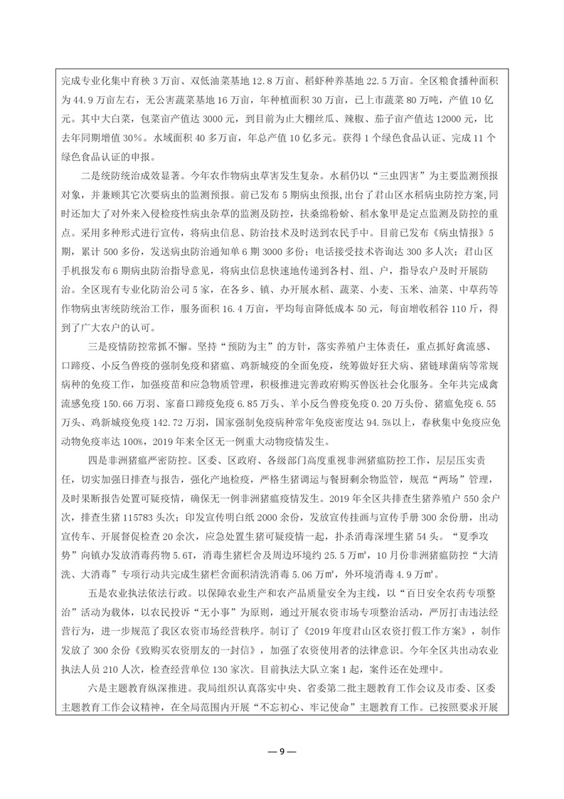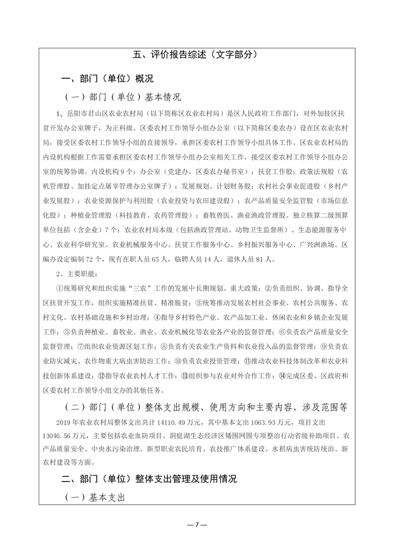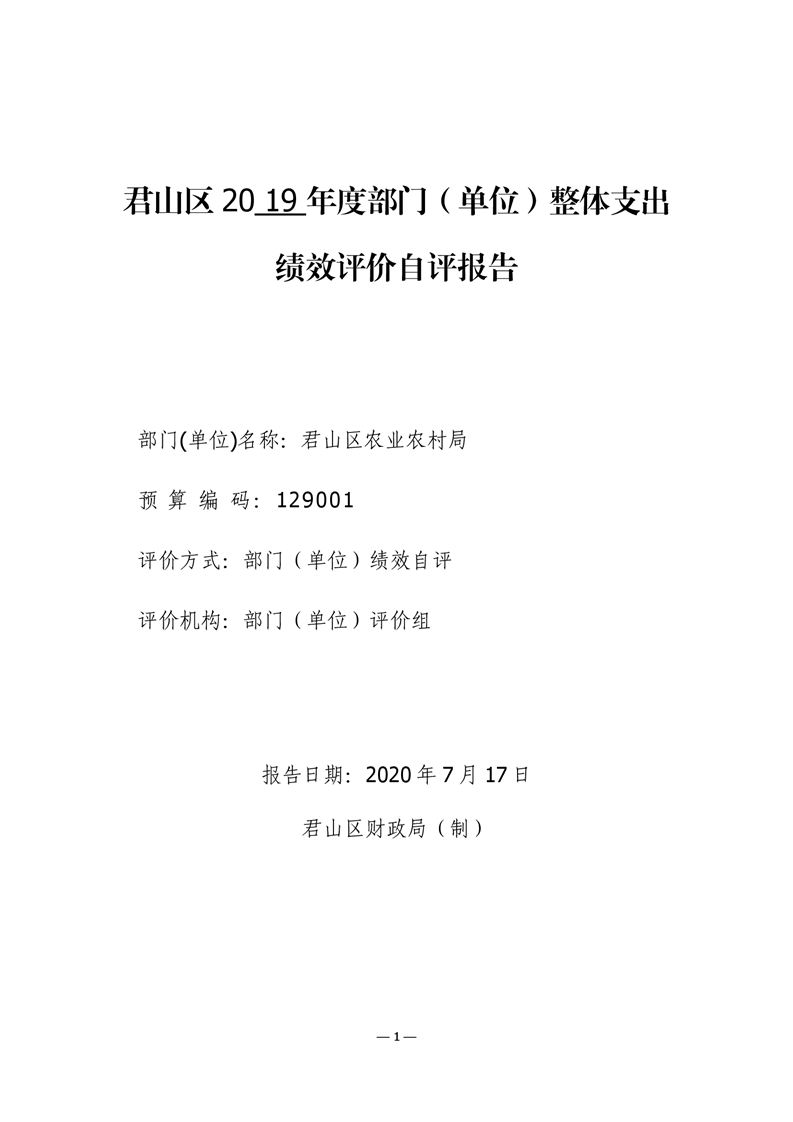 君山区2019年度农业农村局整体支出绩效评价自评报告
