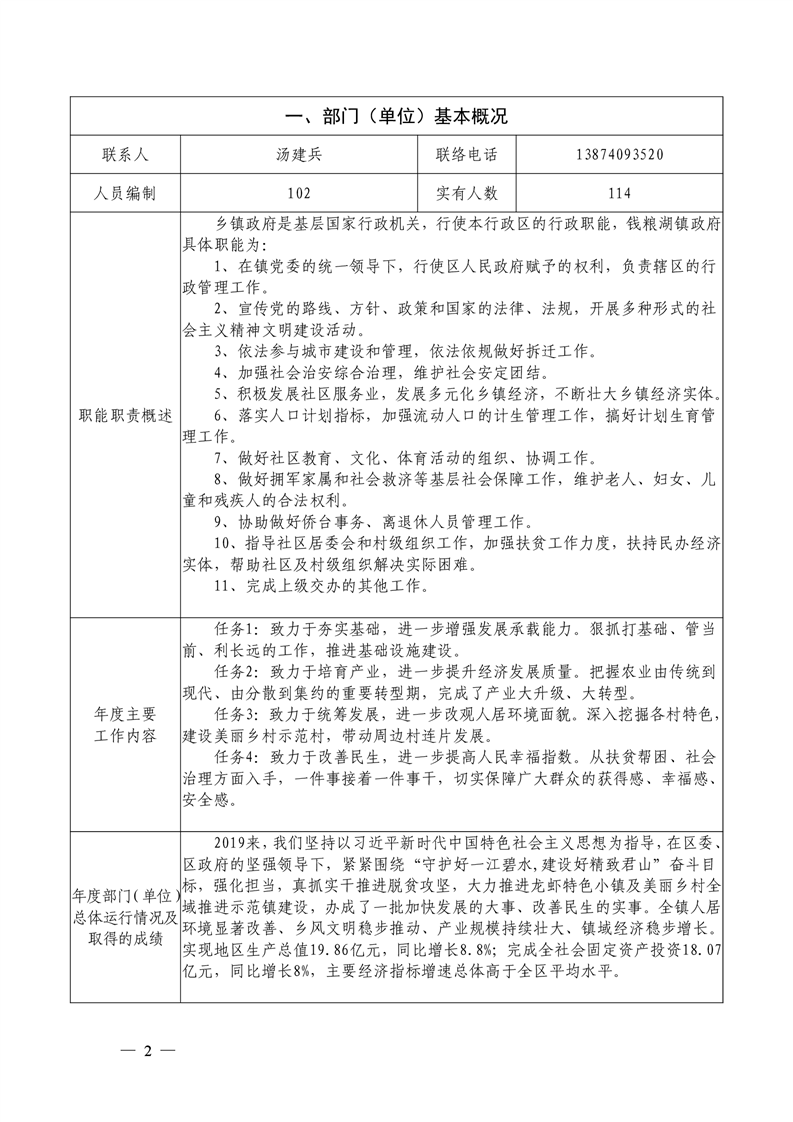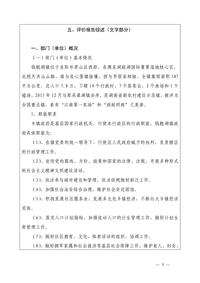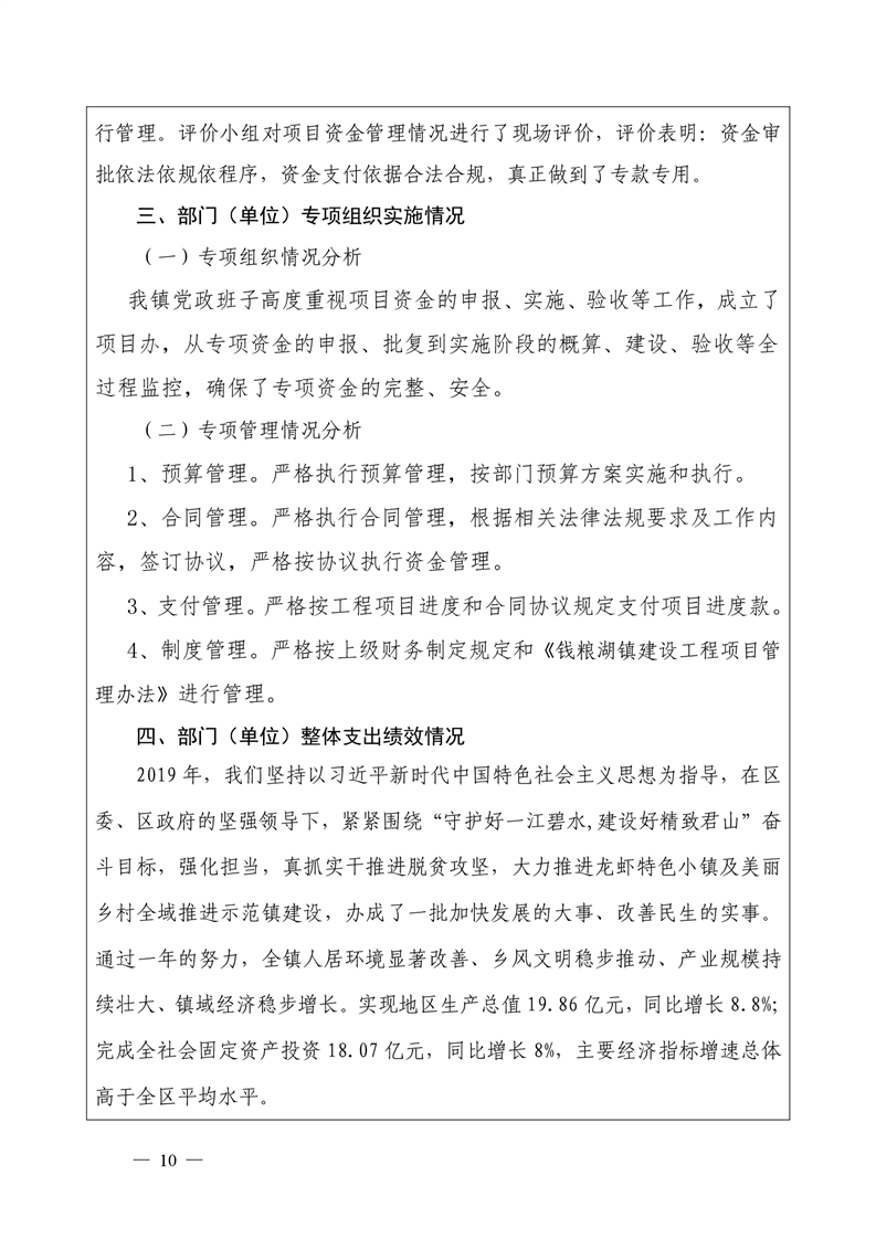 君山区2019年度钱粮湖镇整体支出绩效评价自评报告
