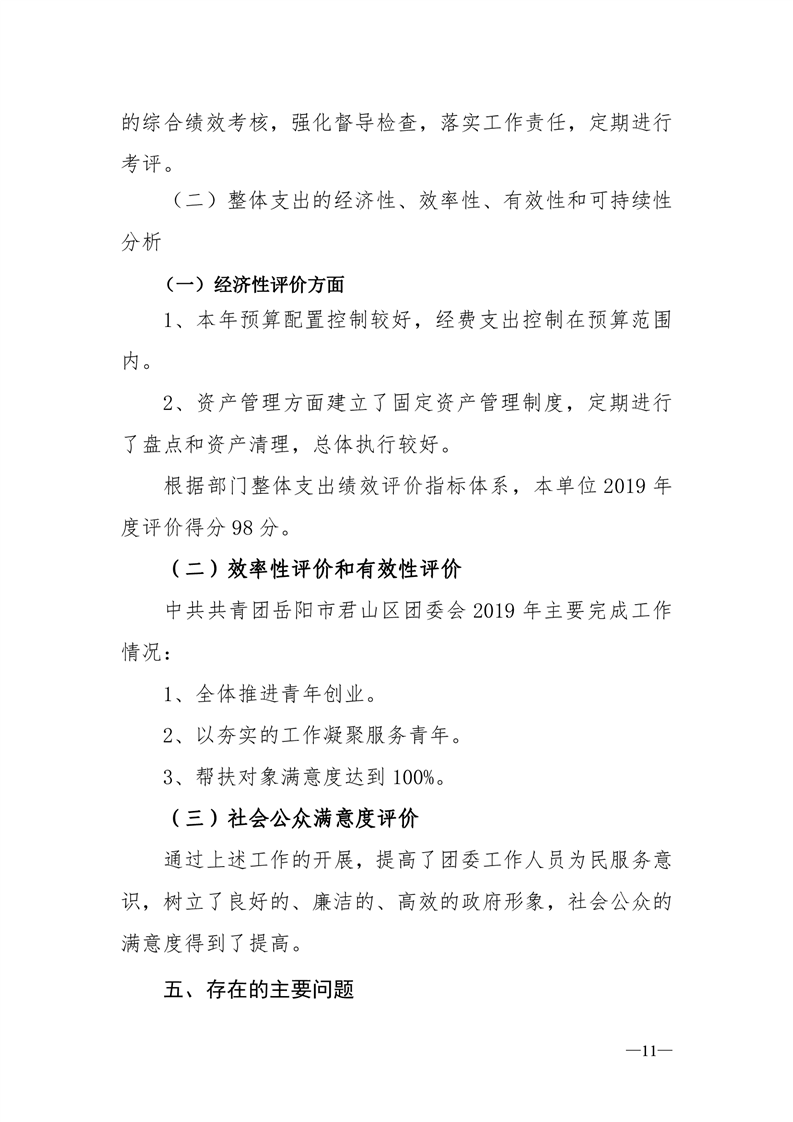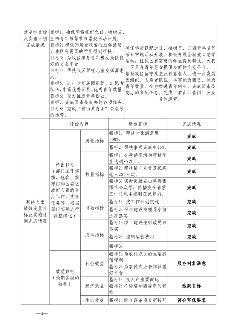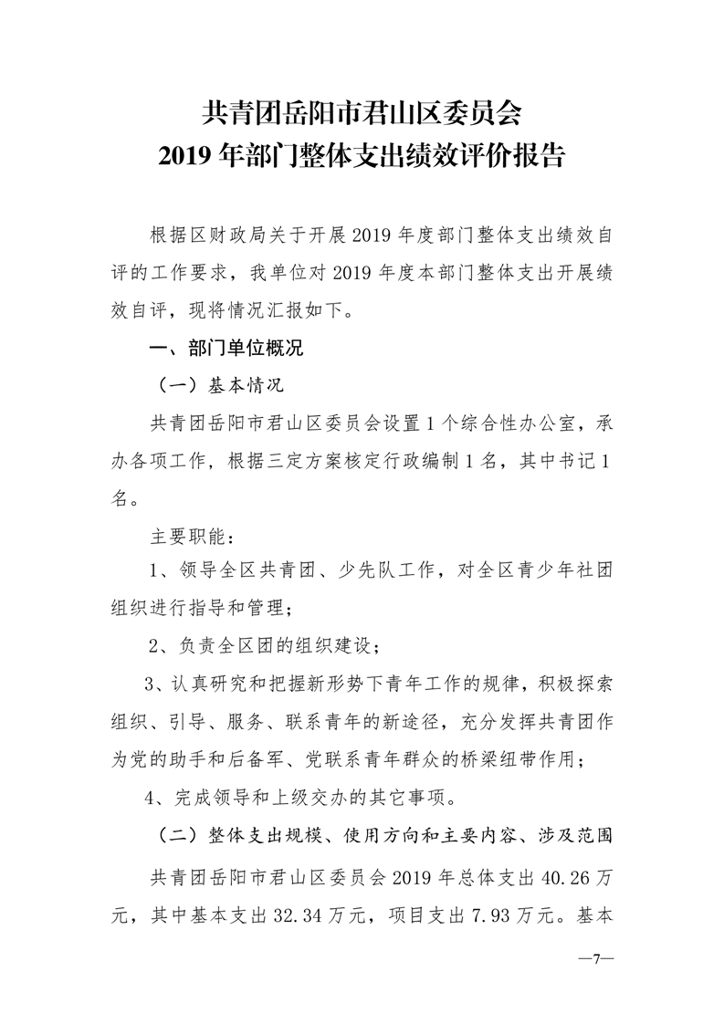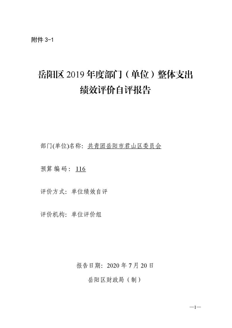 君山区2019年度共青团岳阳市君山区委员会整体支出绩效评价自评报告