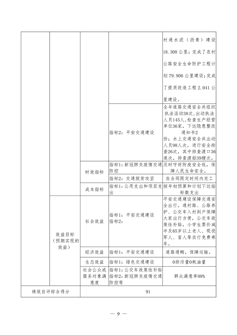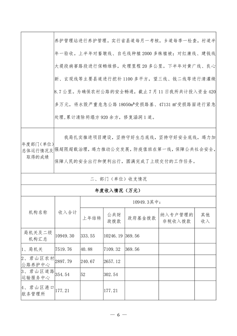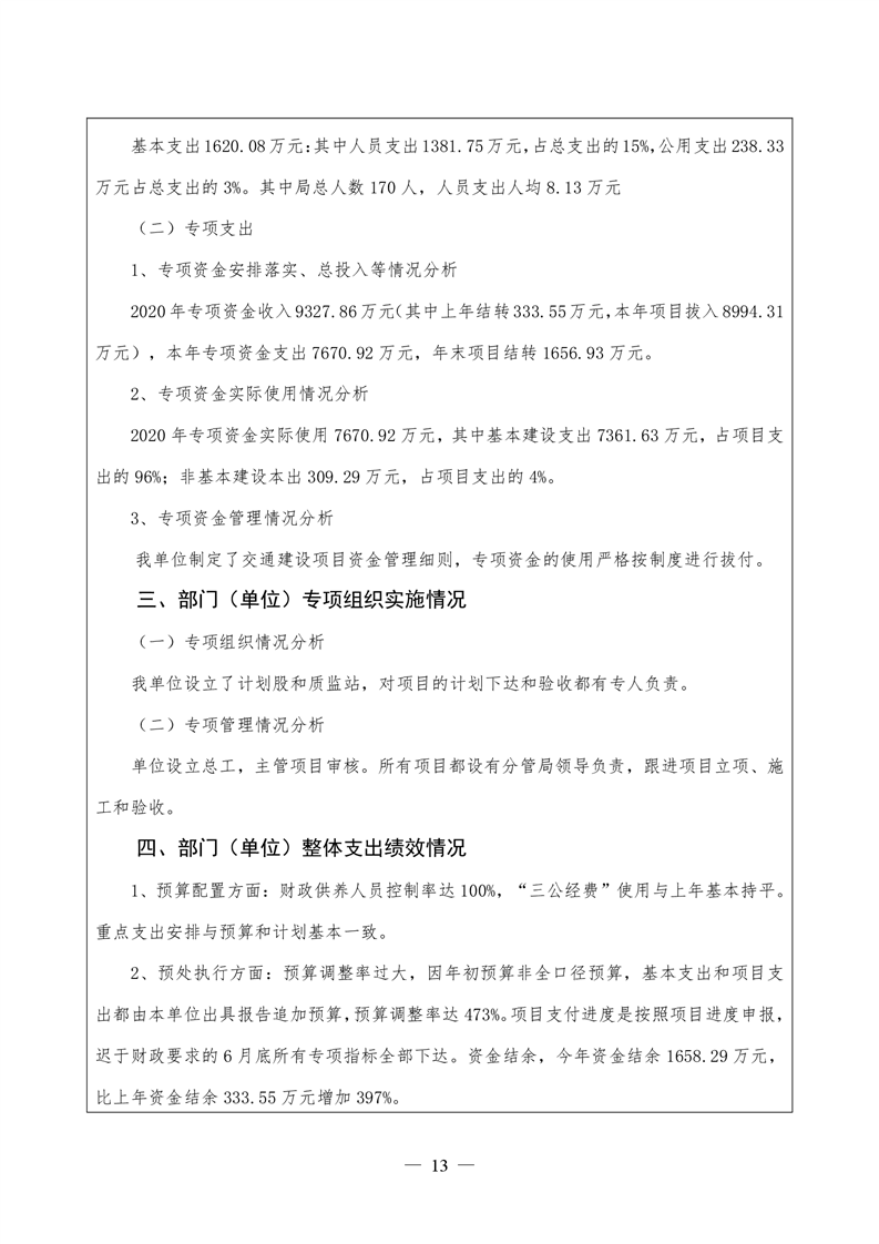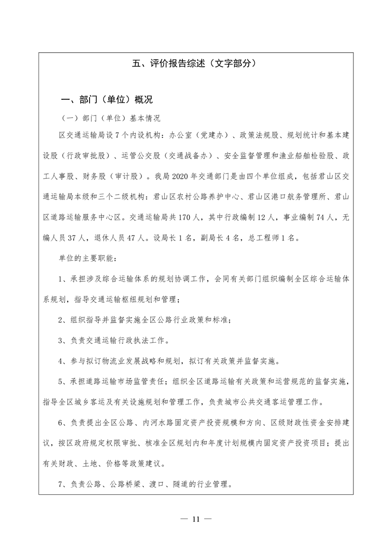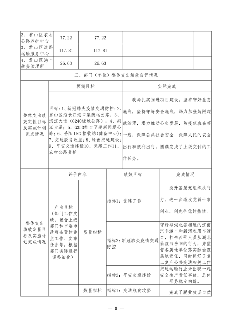 君山区2020年度交通运输局整体支出绩效评价自评报告