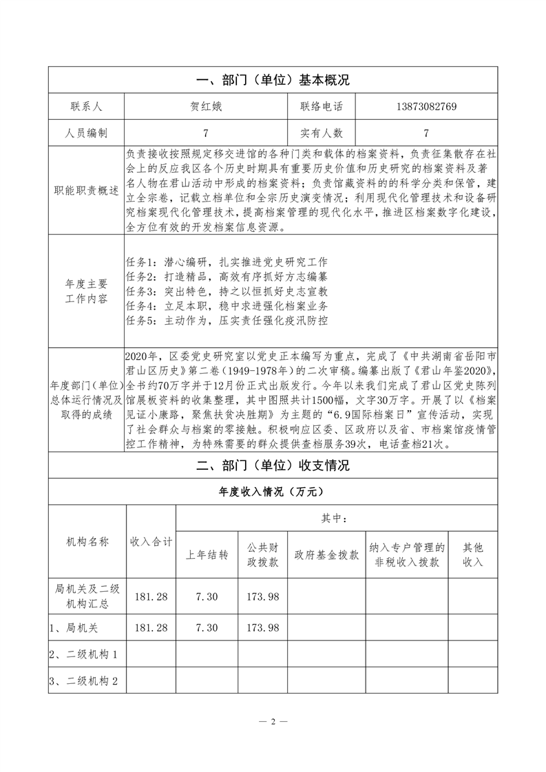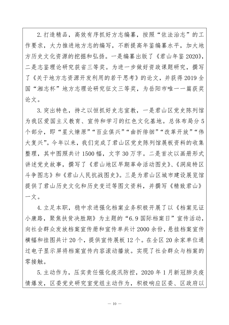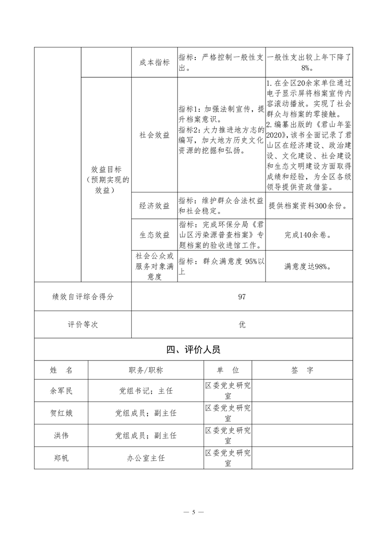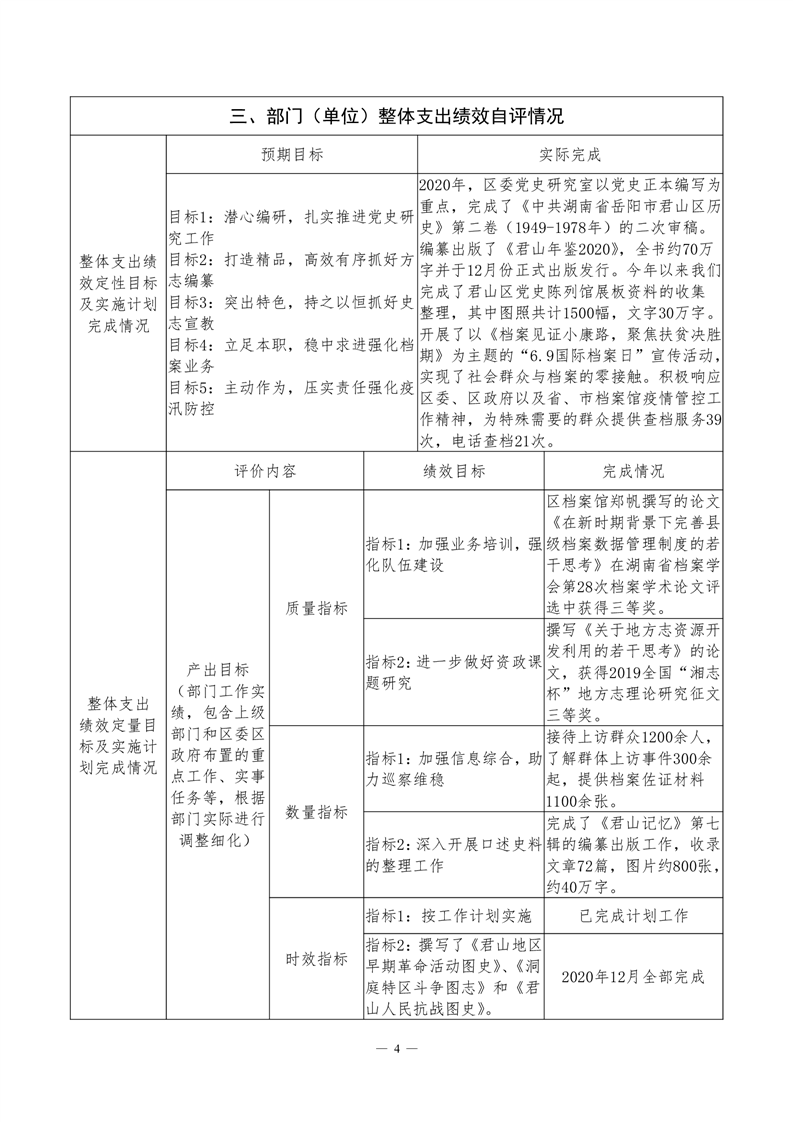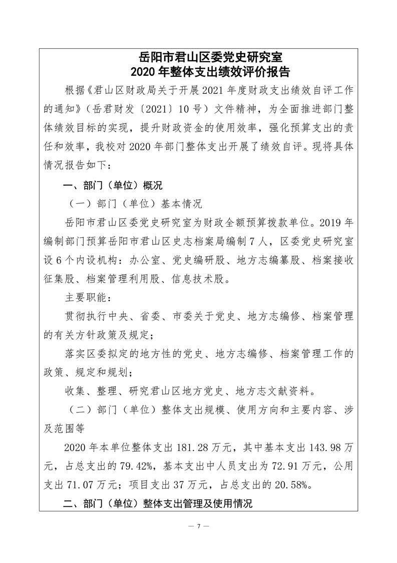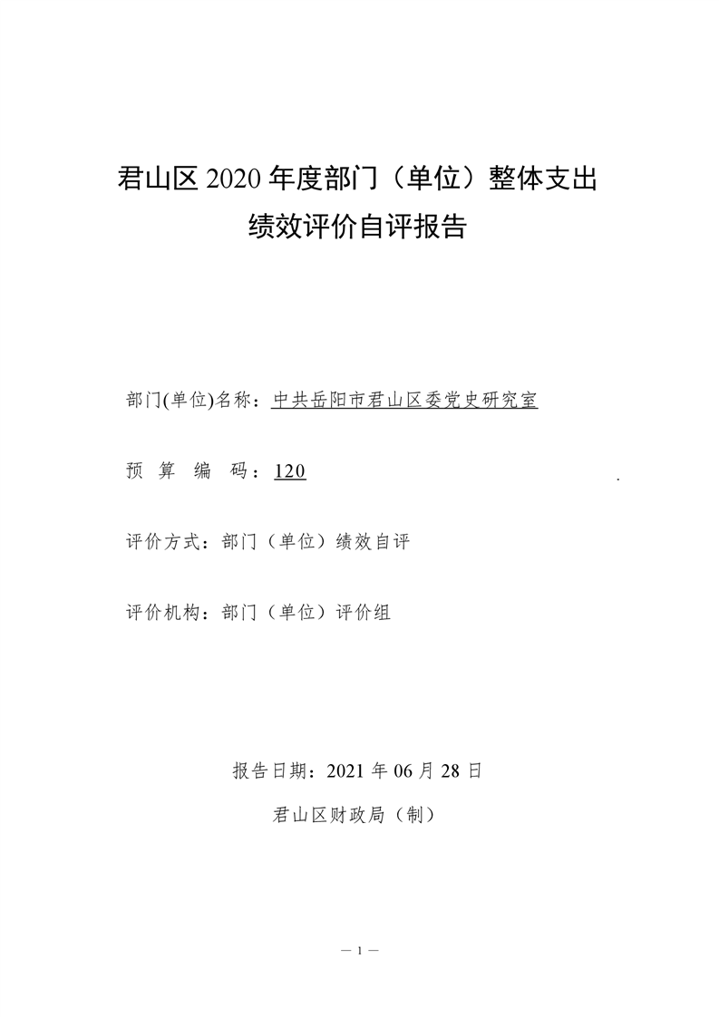 君山区2020年度党史研究室整体支出绩效评价自评报告
