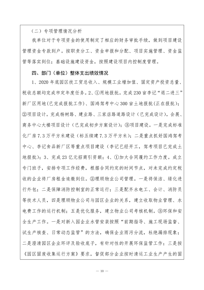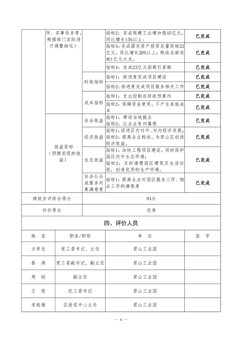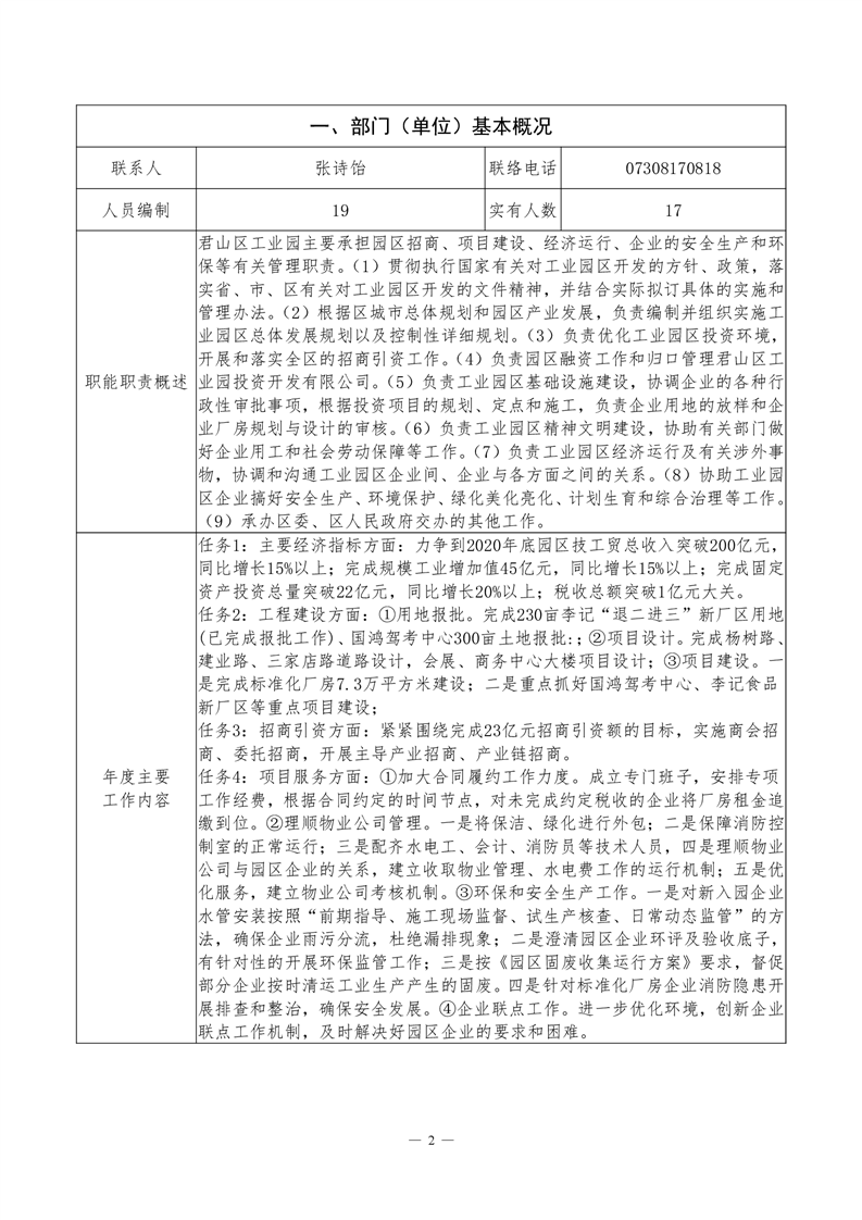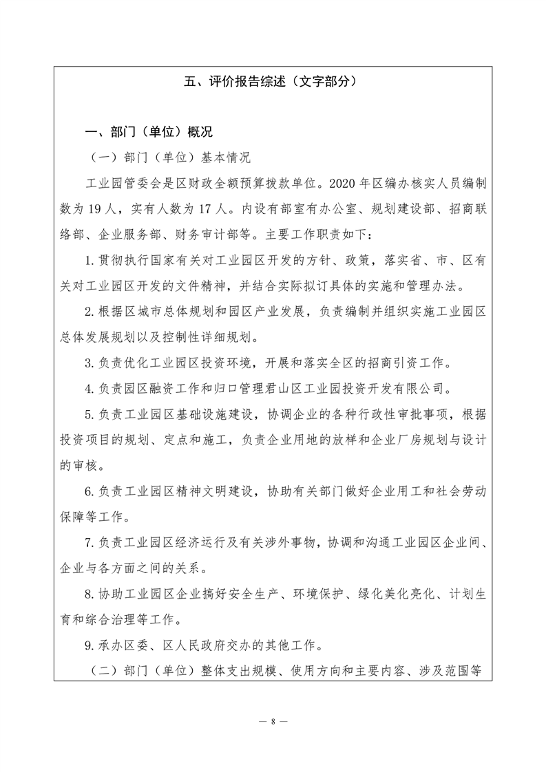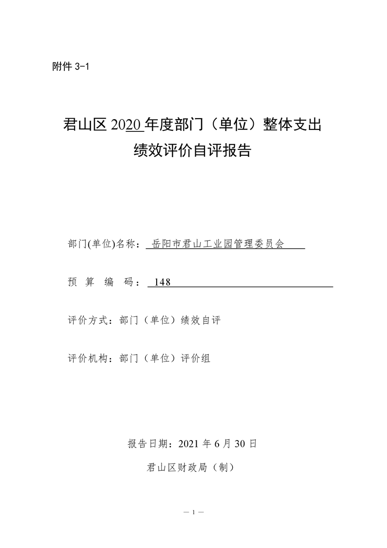 君山区2020年度工业园管委会整体支出绩效评价自评报告