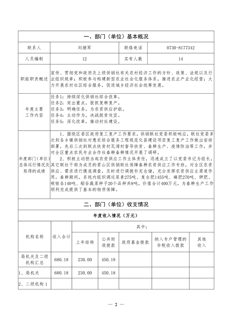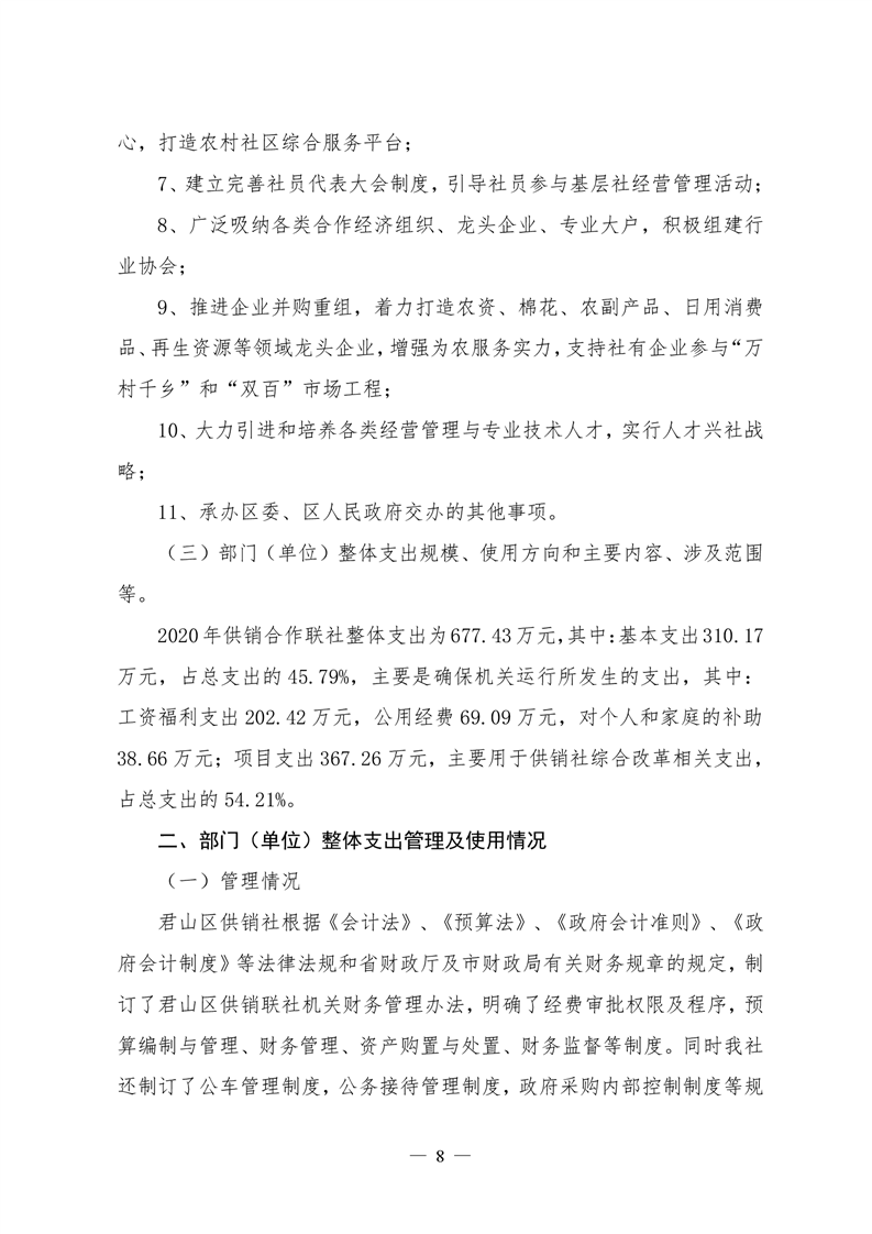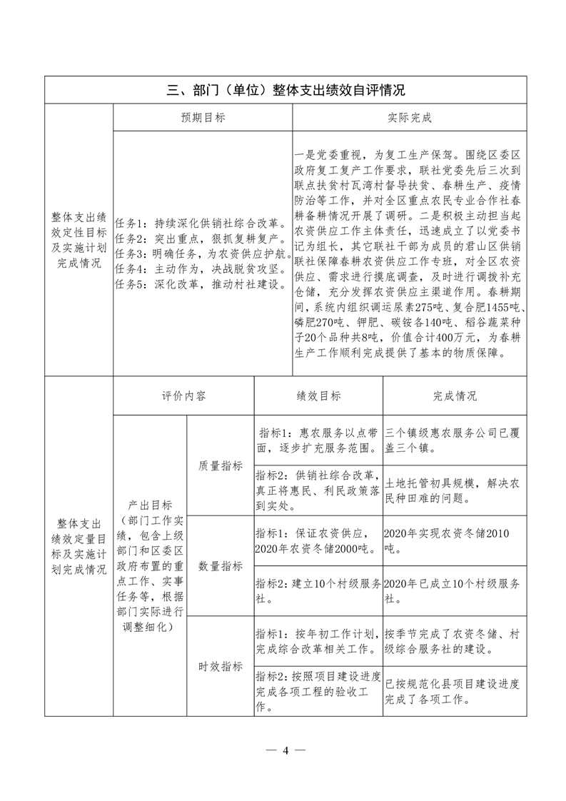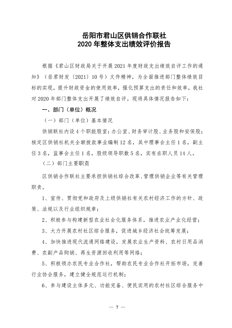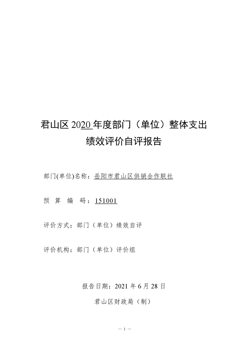 君山区2020年度供销合作联社整体支出绩效评价自评报告