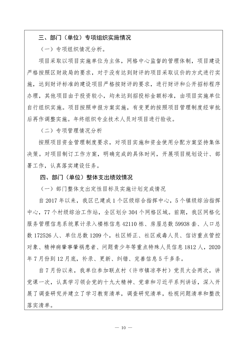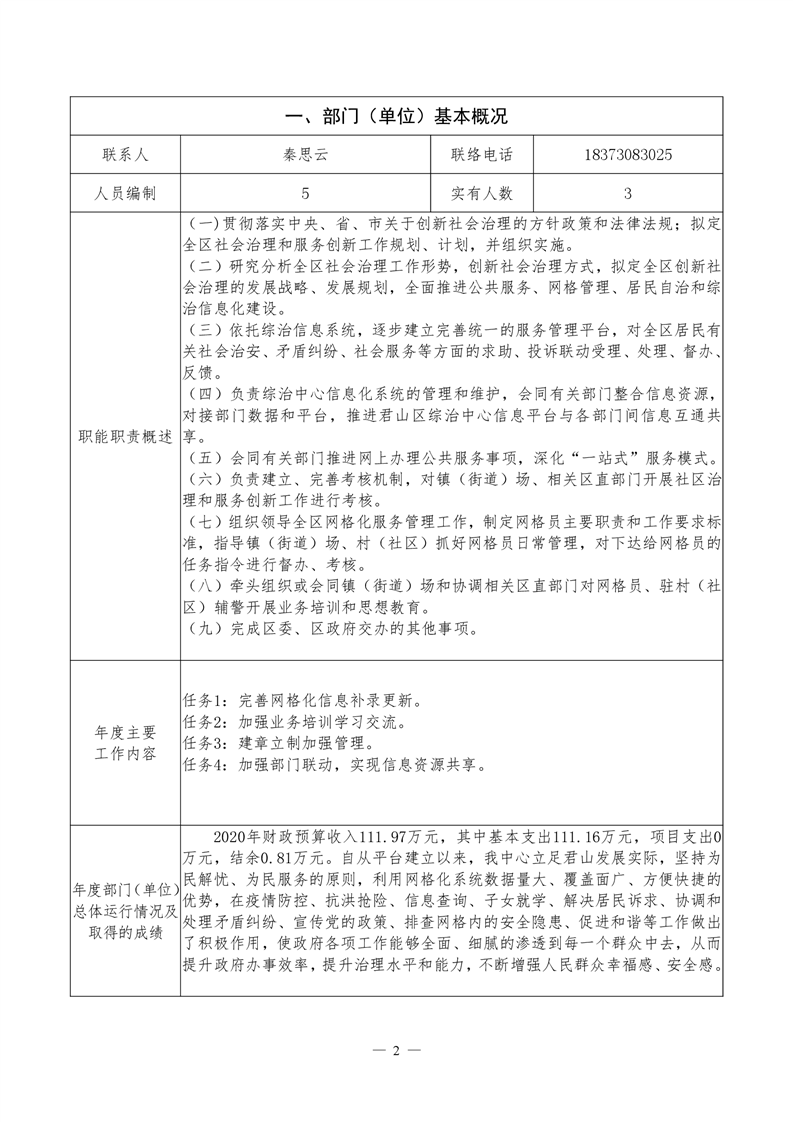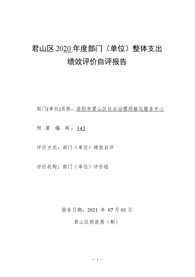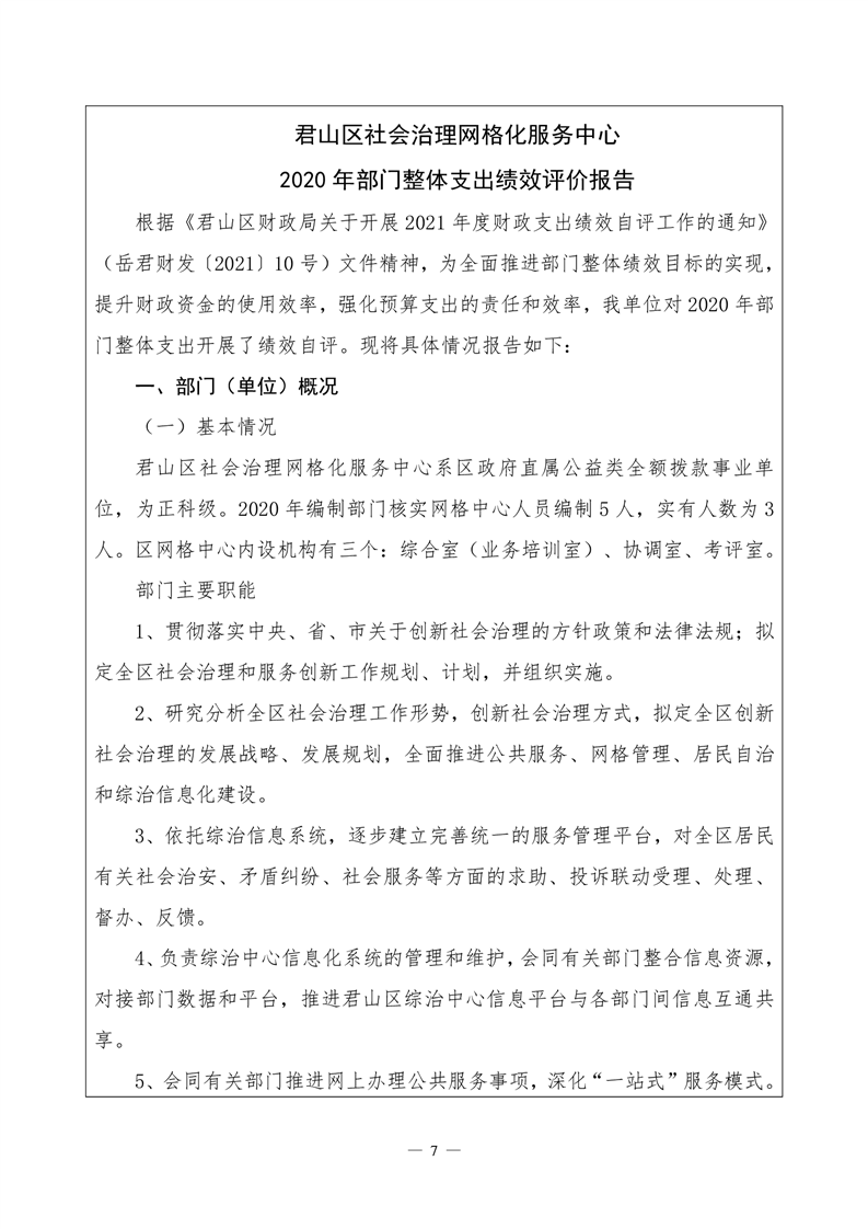 君山区2020年度网格化服务中心整体支出绩效评价自评报告