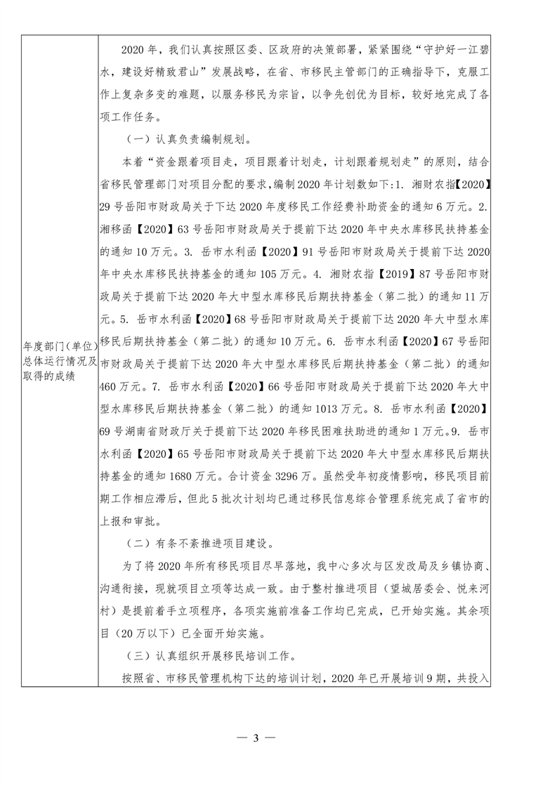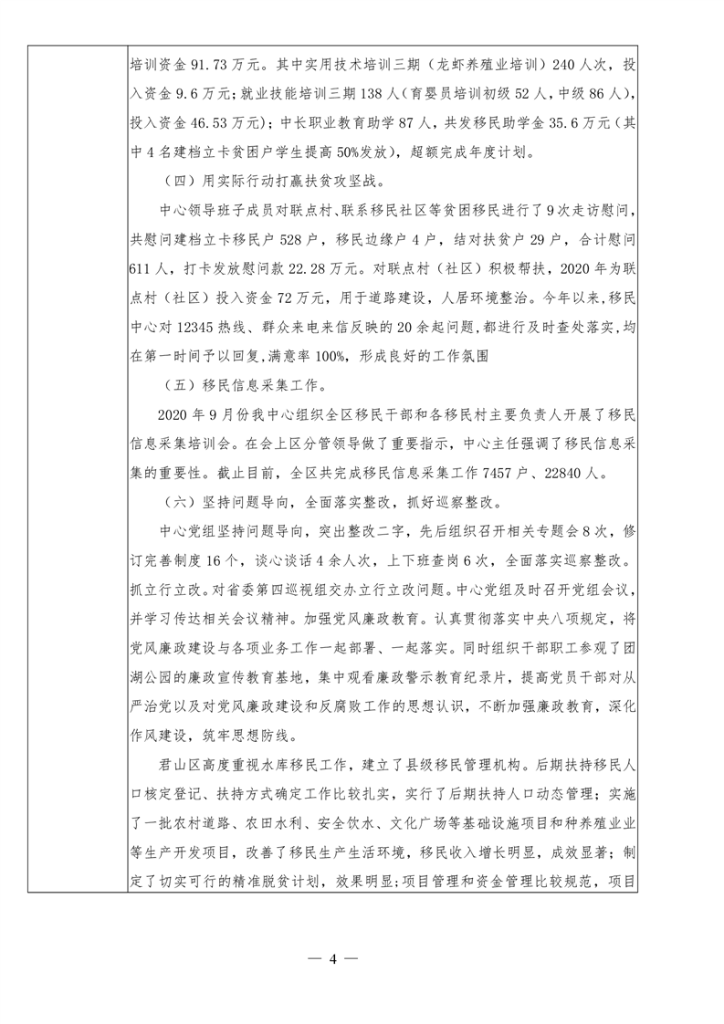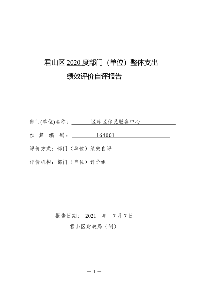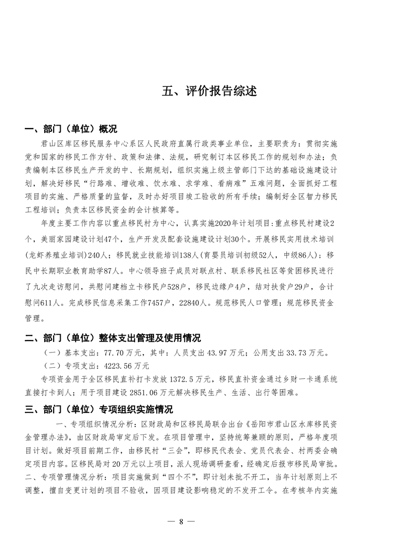 君山区2020年度库区移民服务中心整体支出绩效评价自评报告