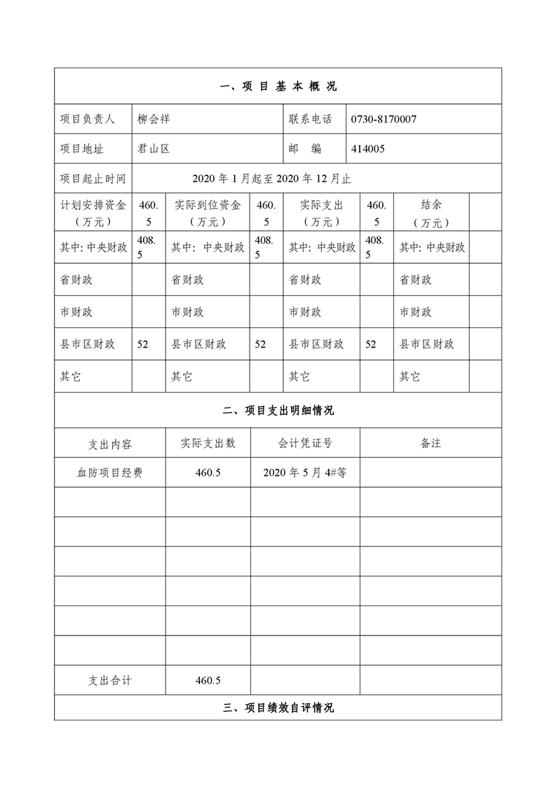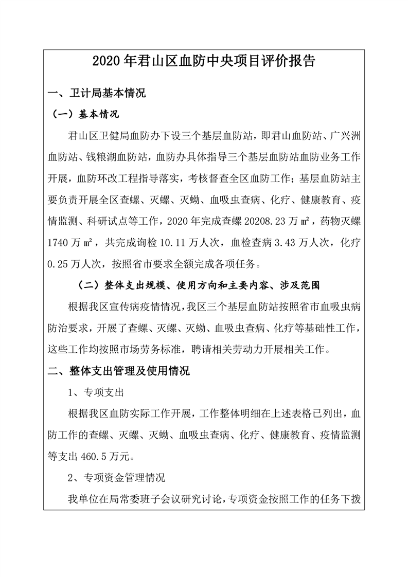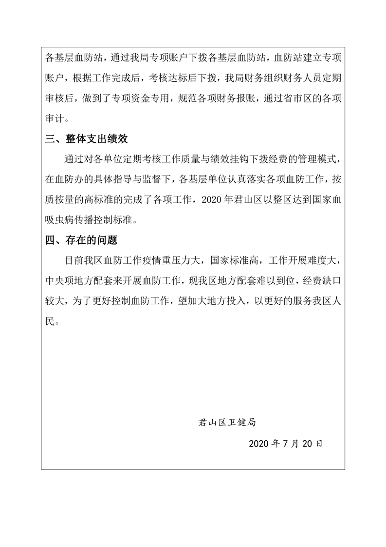 2020年度君山区卫健局血防项目经费支出绩效自评报告