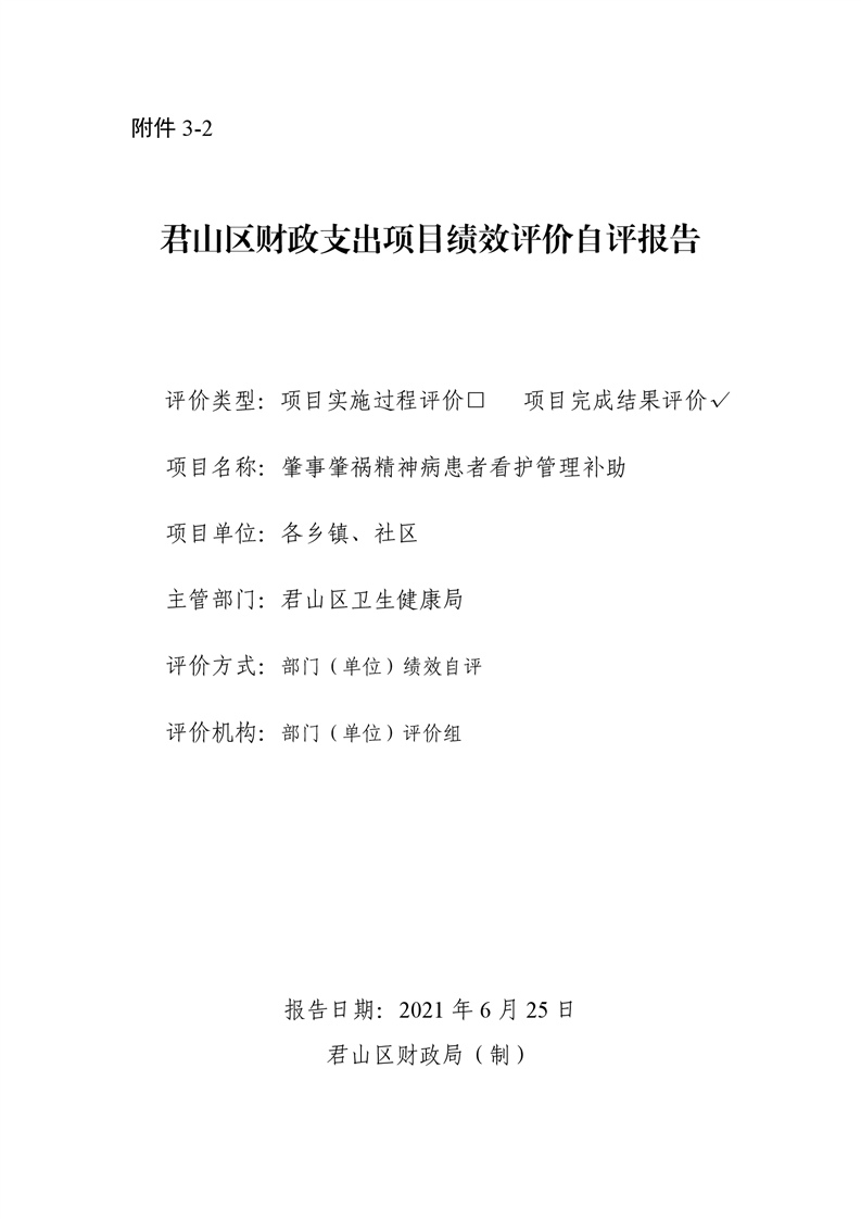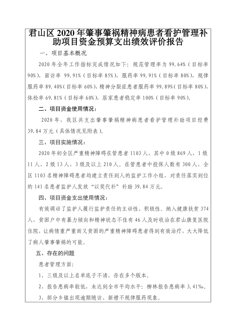 2020年度君山区卫健局肇事肇祸精神病患者看护管理补助项目支出绩效自评报告