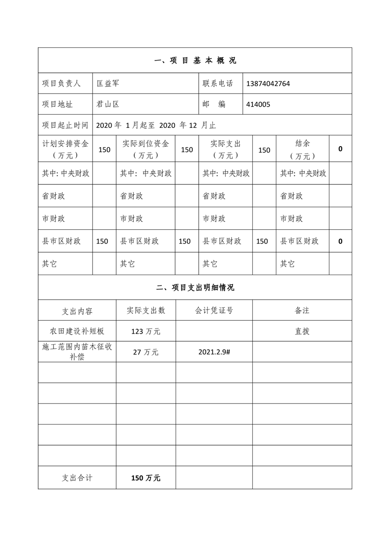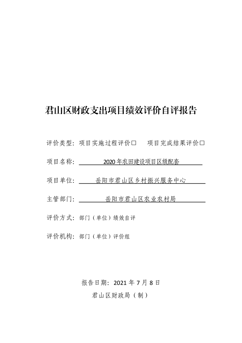 2020年度君山区农业农村局农田建设项目区级配套项目支出绩效自评报告