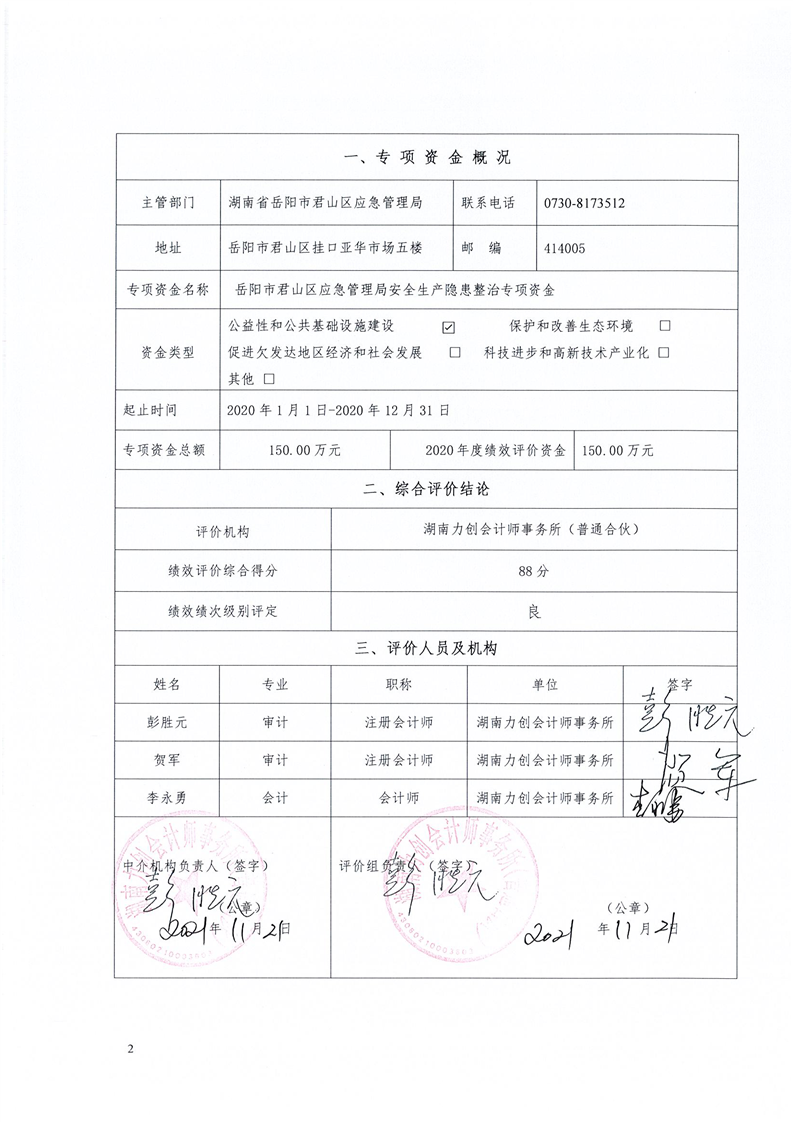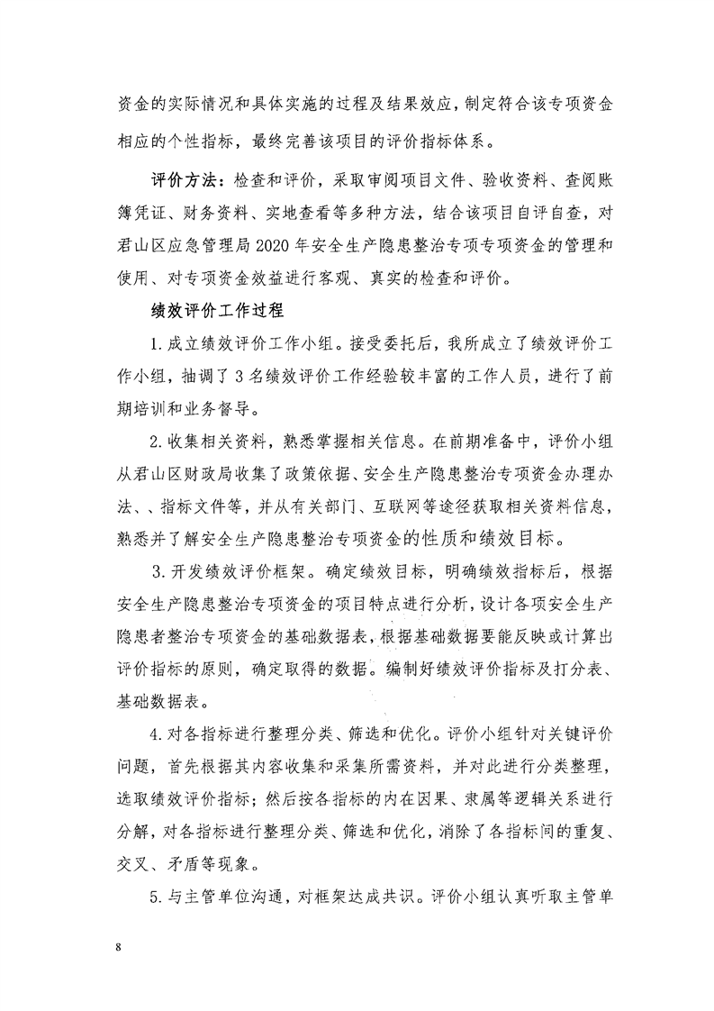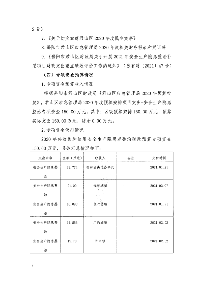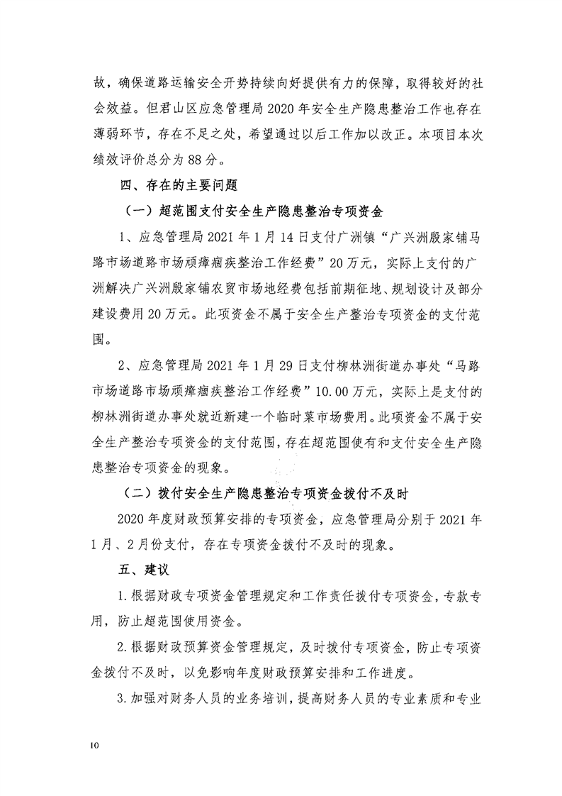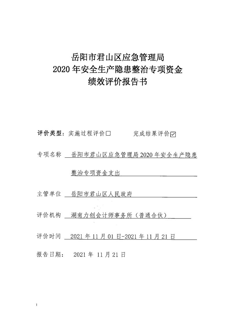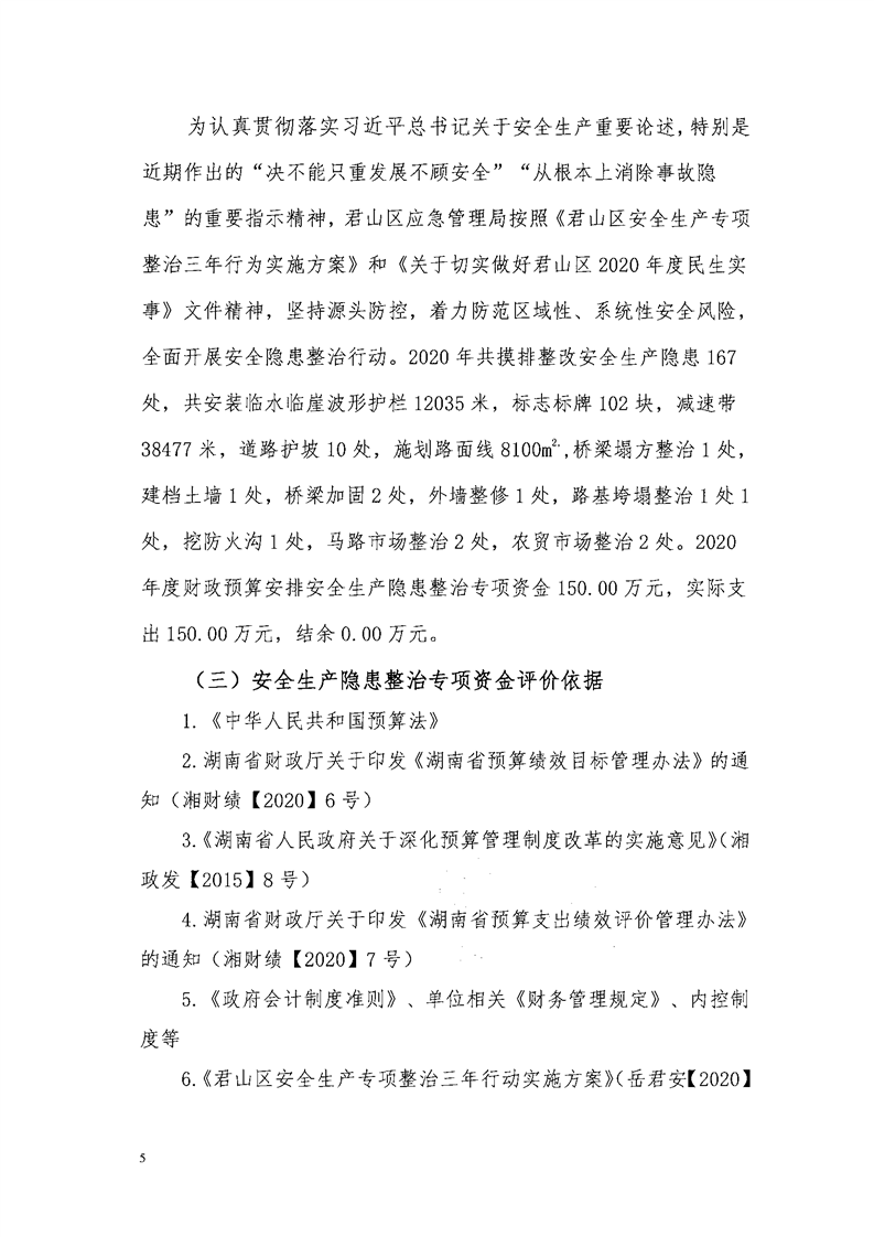 君山区应急管理局2020年安全生产隐患整治专项资金绩效评价报告书