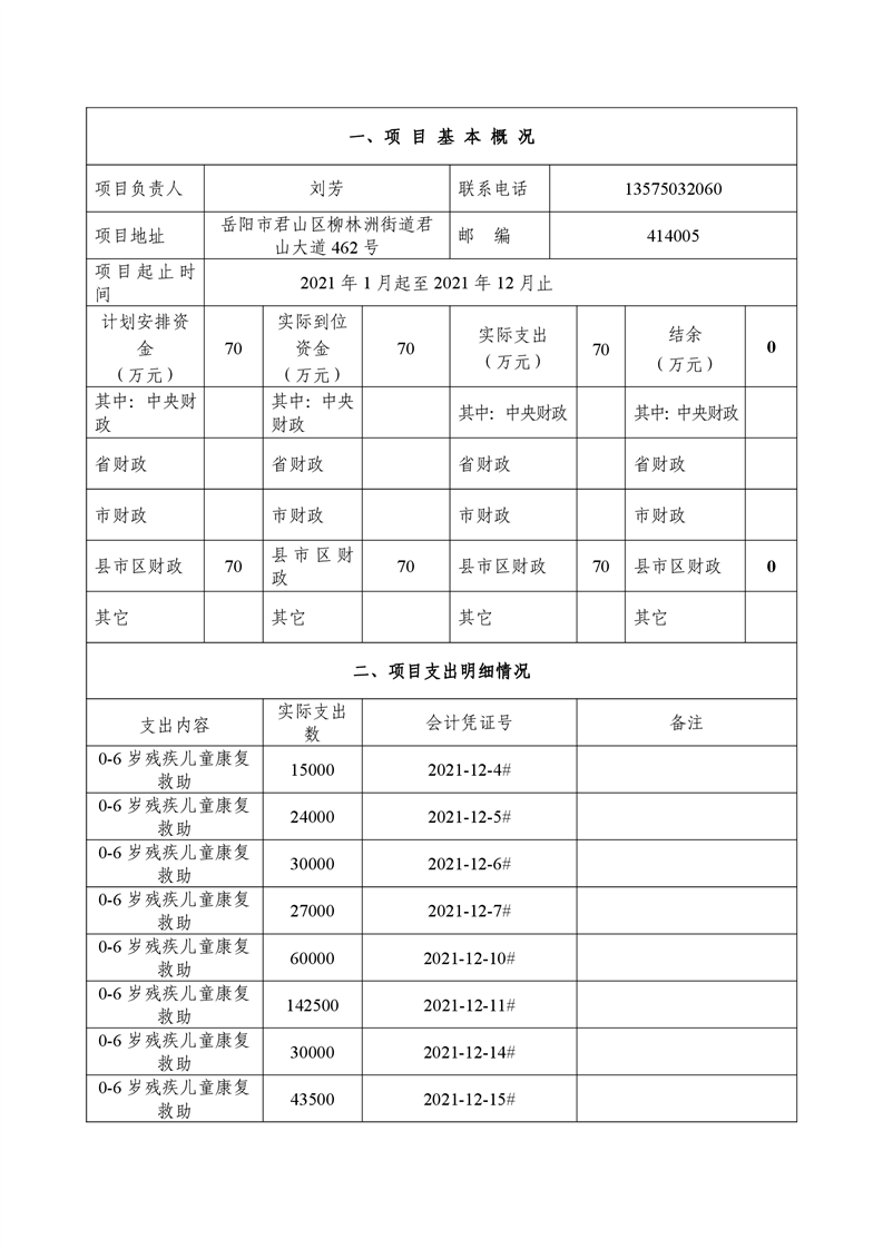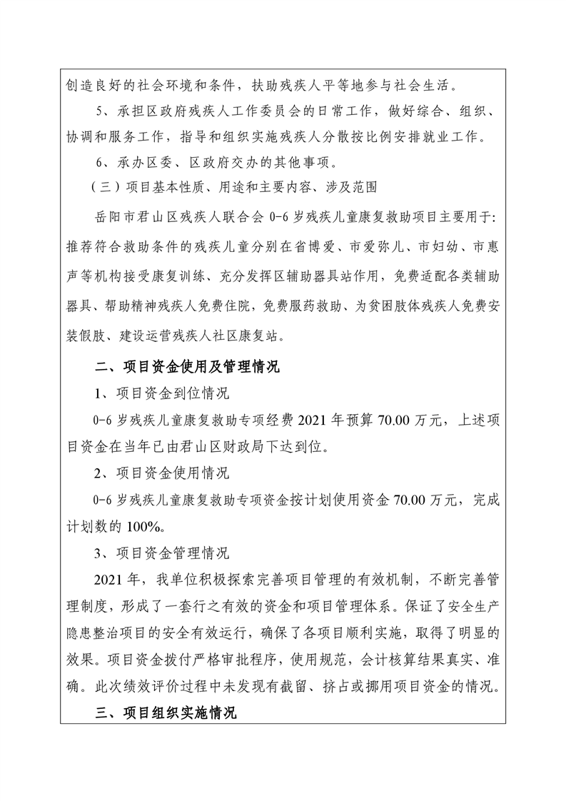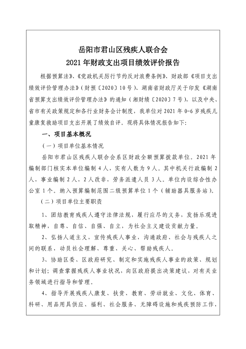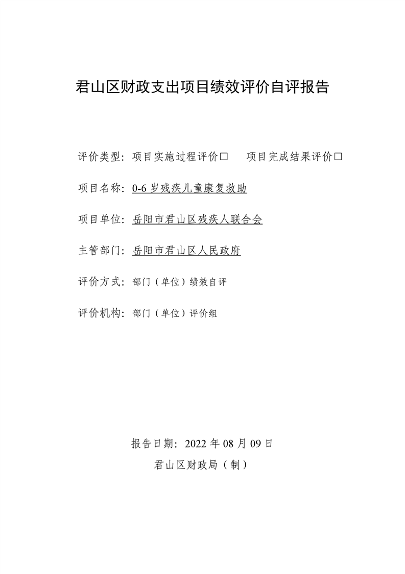 2021年度君山区残联0-6岁残疾儿童康复救助项目绩效自评报告
