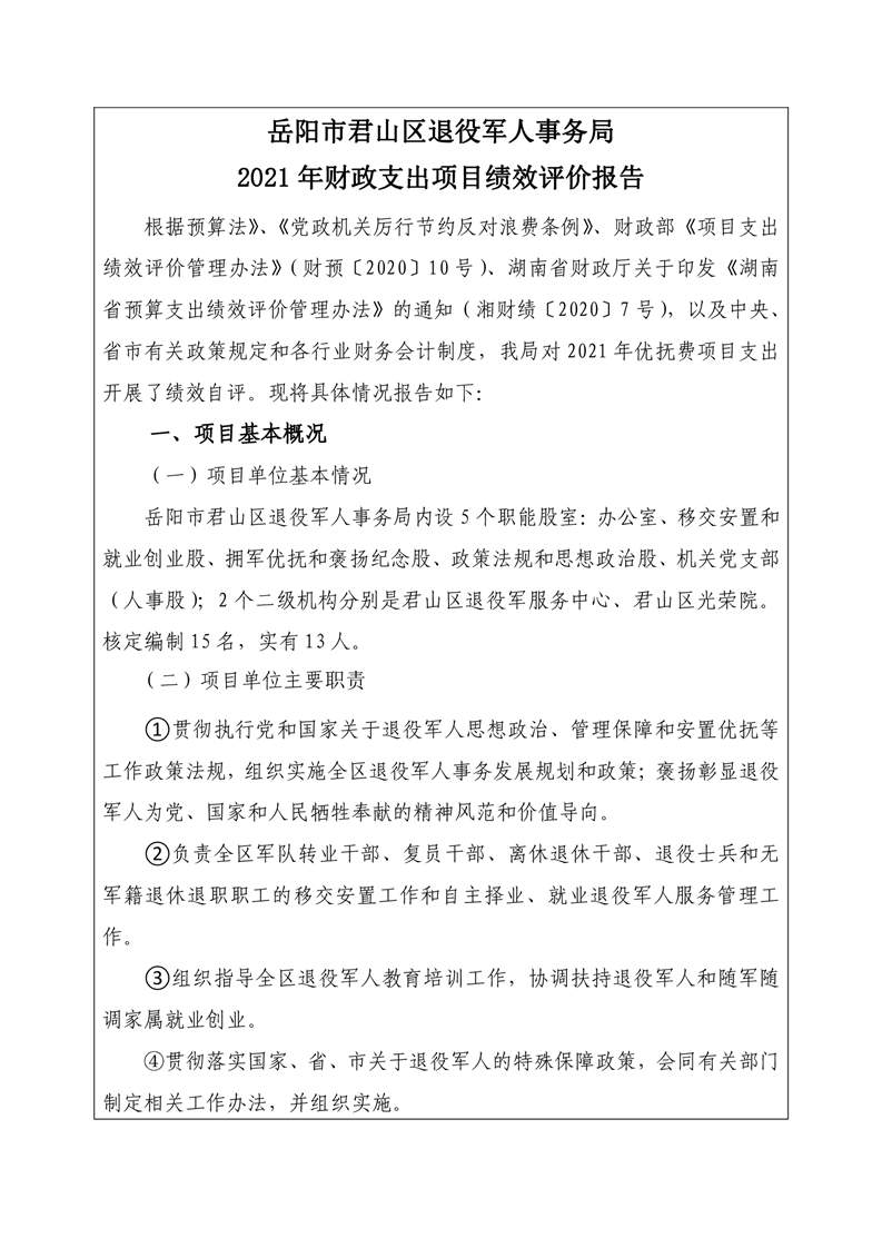 2021年度君山区退役军人事务局优抚费项目绩效评价自评报告