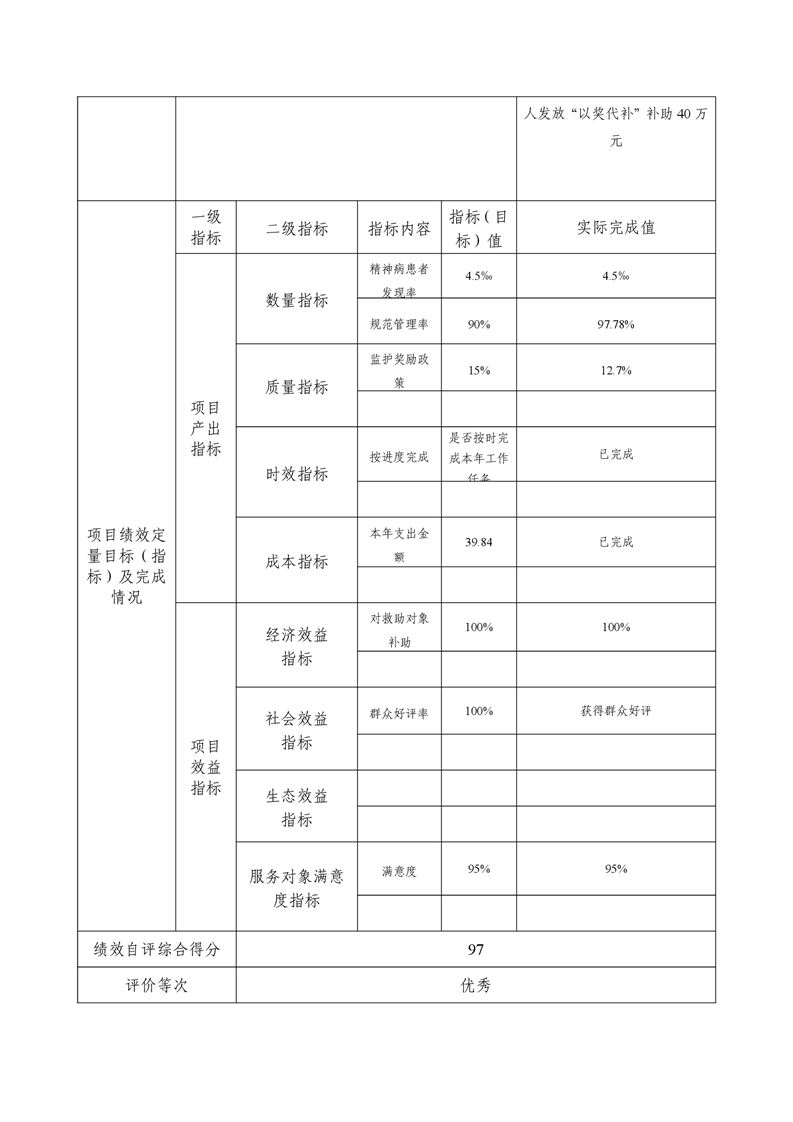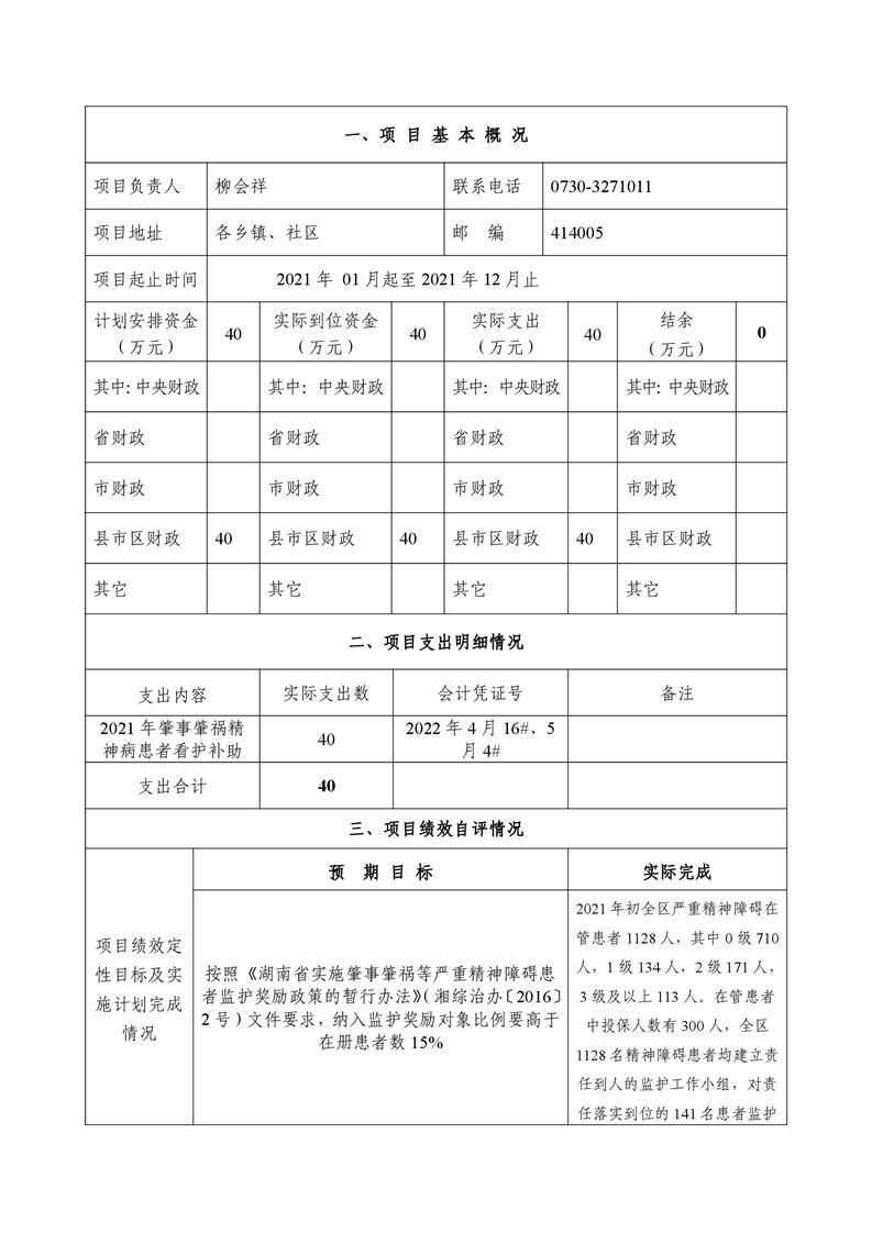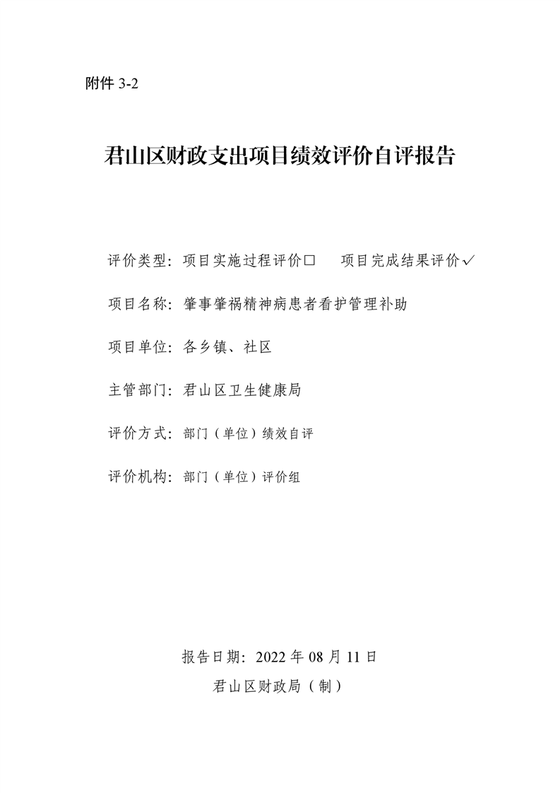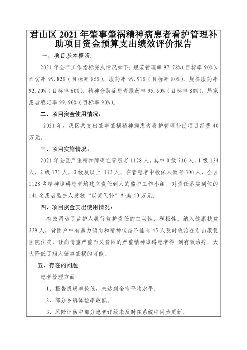 2021年度君山区卫健局肇事肇祸精神病患者看护管理补助项目绩效评价自评报告