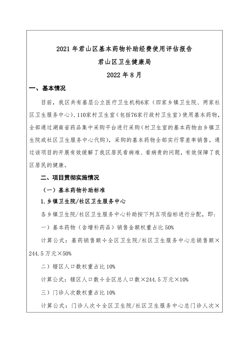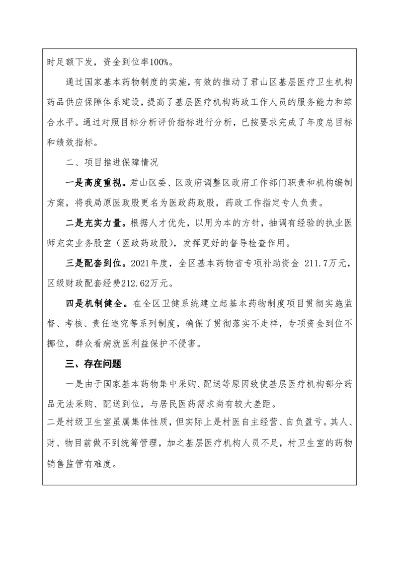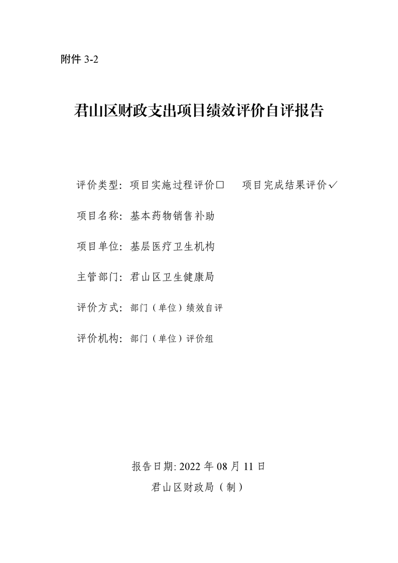 2021年度君山区卫健局基本药物销售补助项目绩效评价自评报告