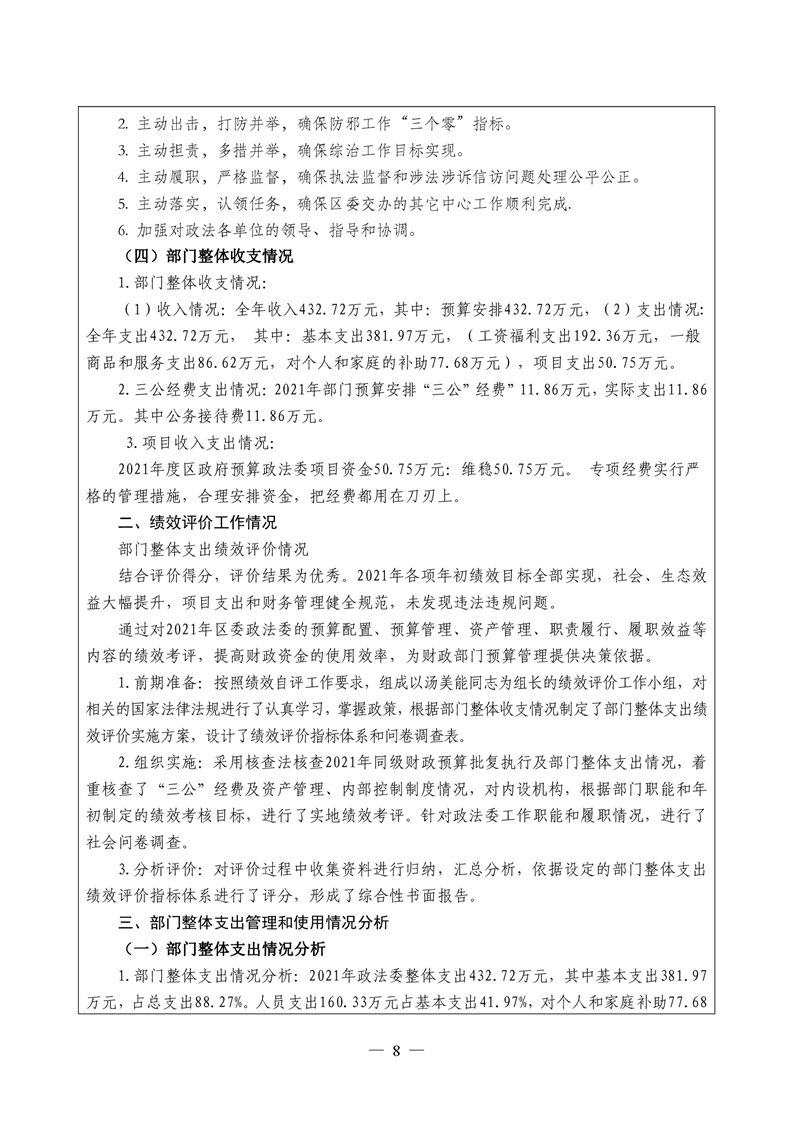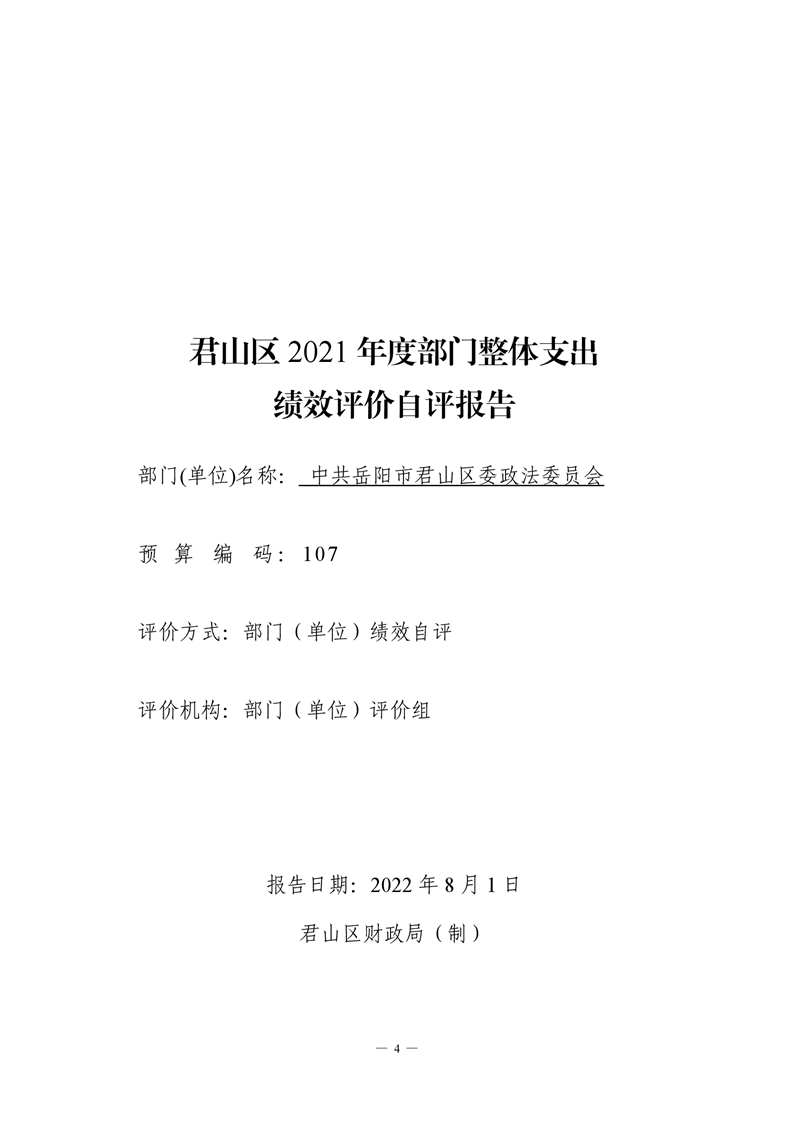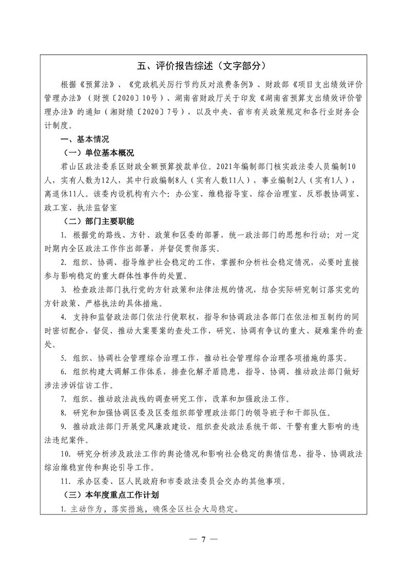 君山区2021年度君山区委政法委员会整体支出绩效评价自评报告