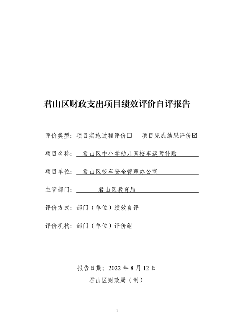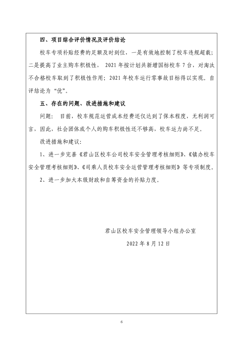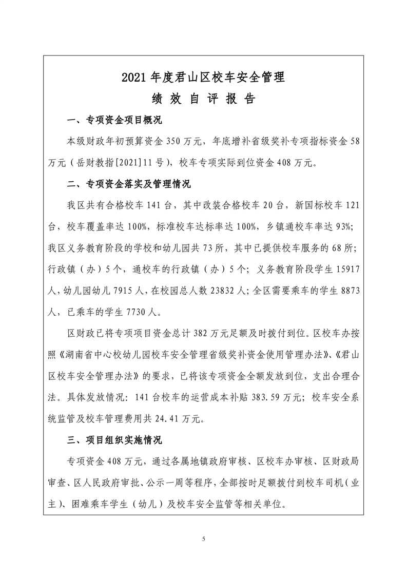 2021年度君山区教育局中小学幼儿园校车运营补贴项目绩效评价自评报告