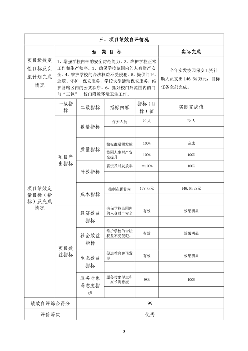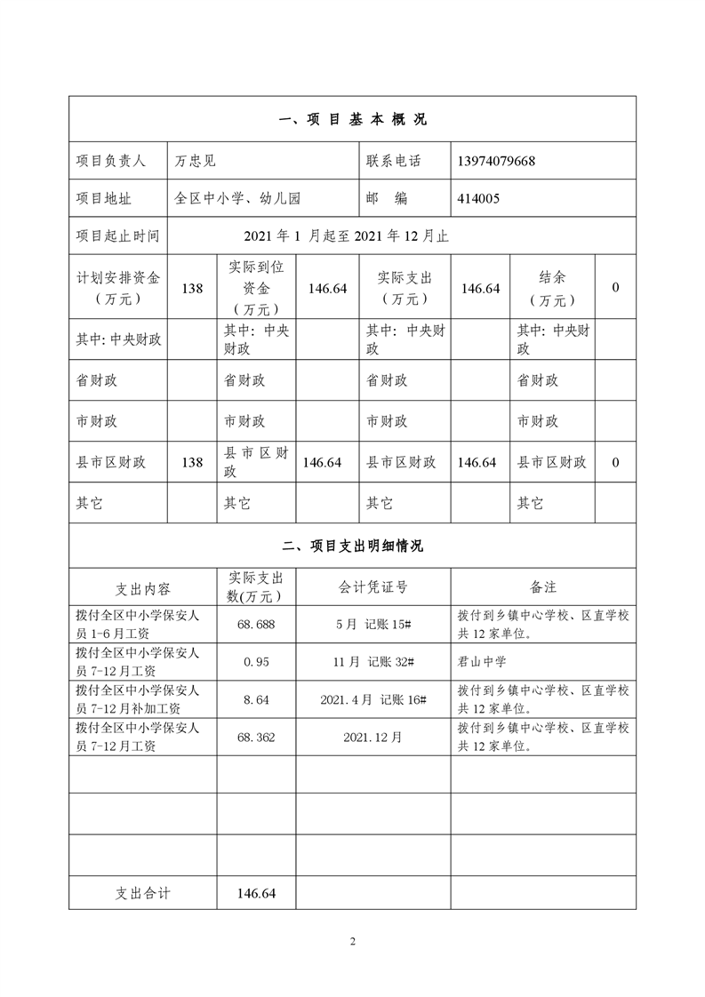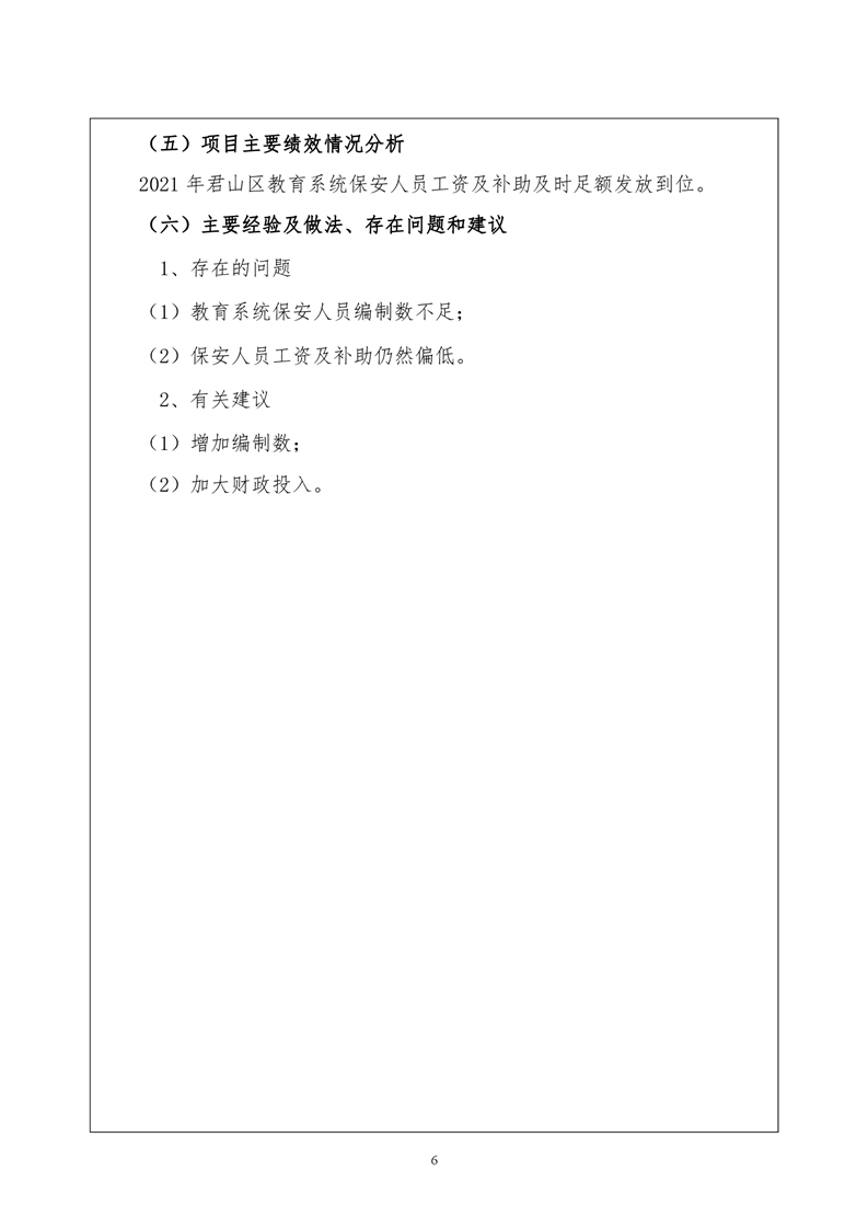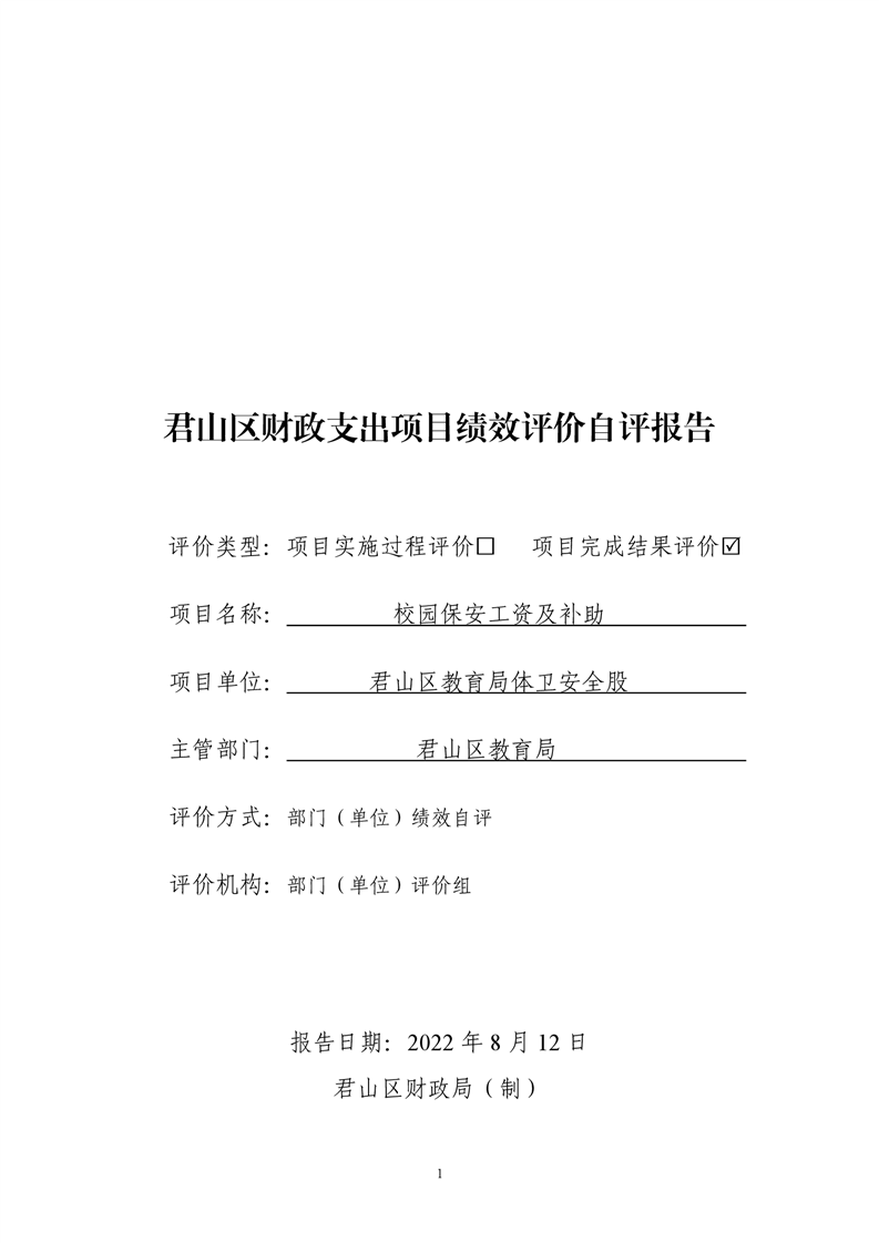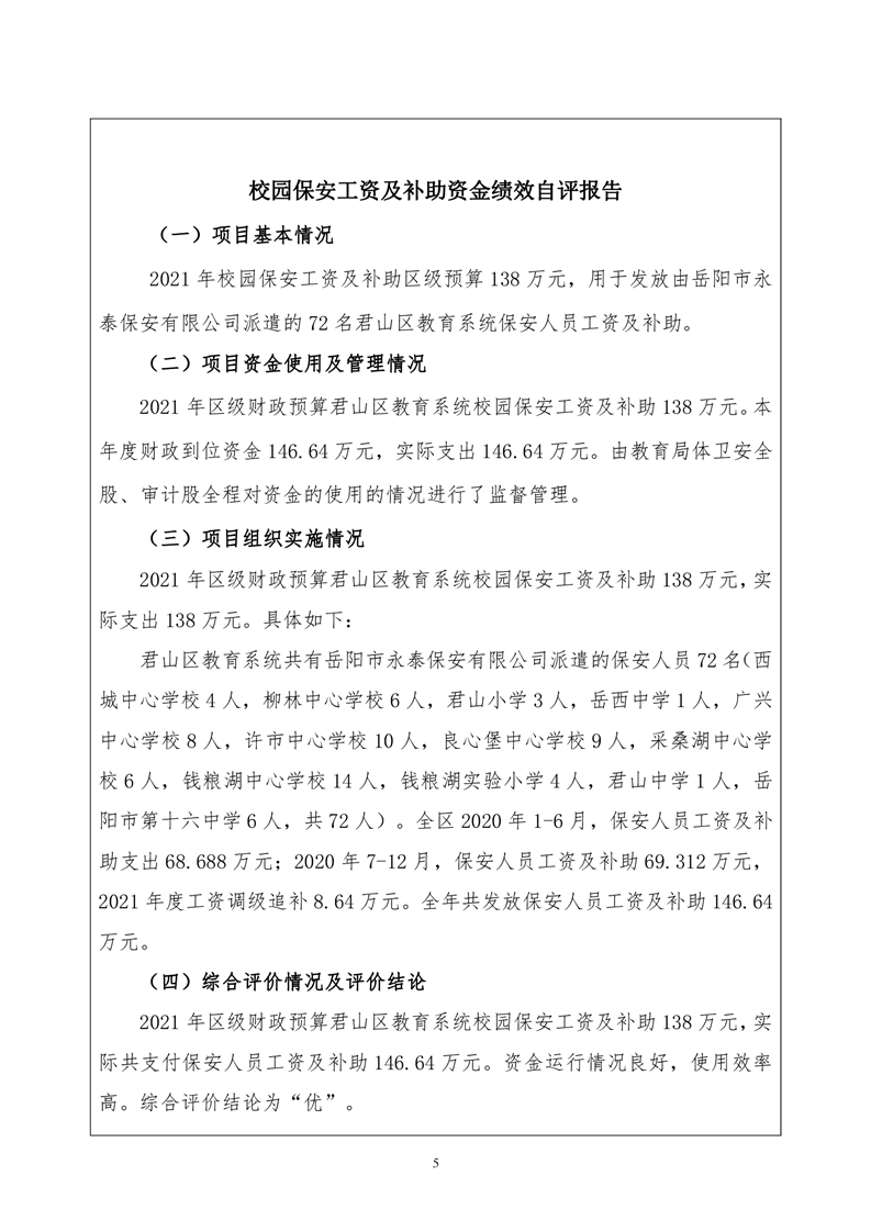 2021年度君山区教育局校园保安工资及补助项目绩效评价自评报告