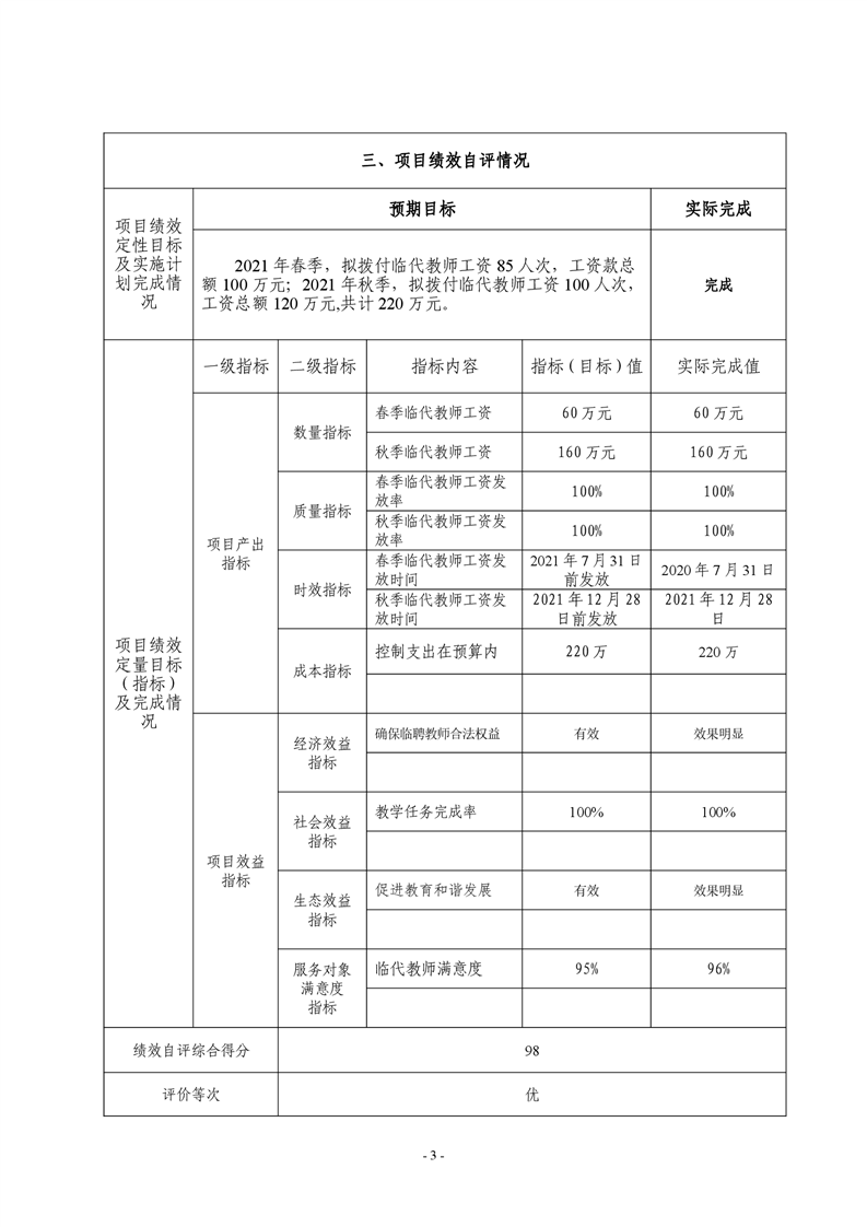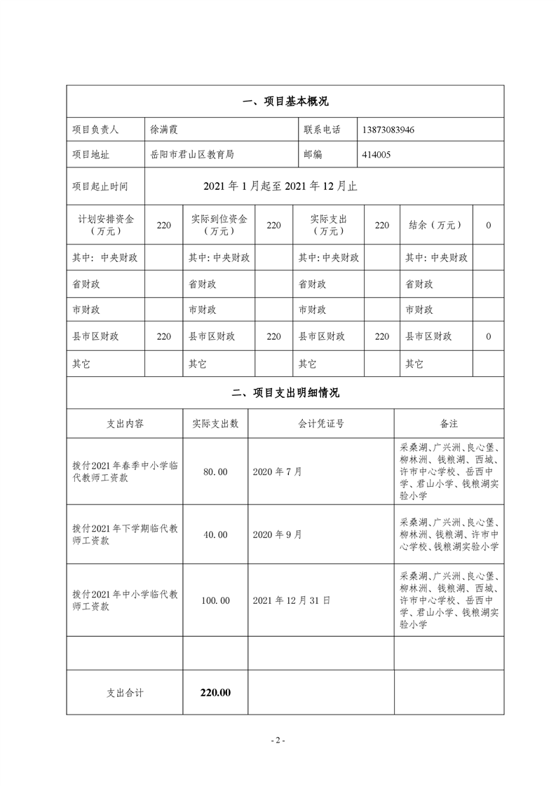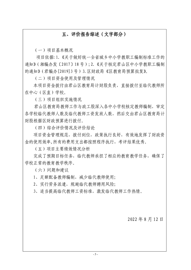 2021年度君山区教育局临聘教师工资及补助项目绩效评价自评报告