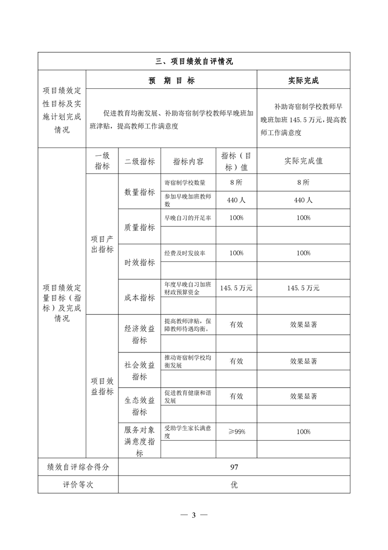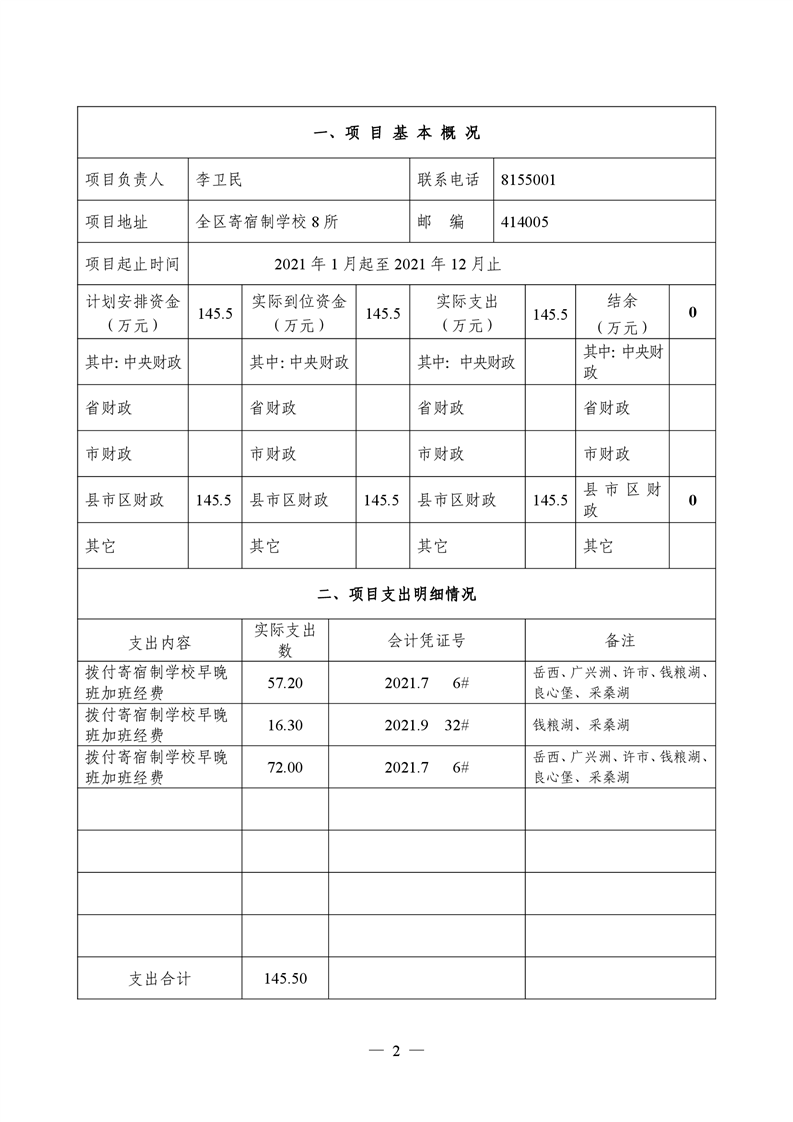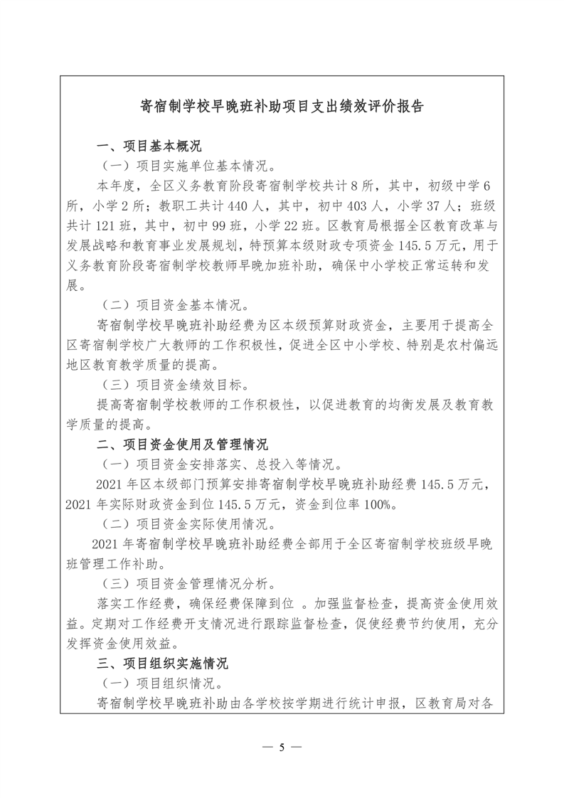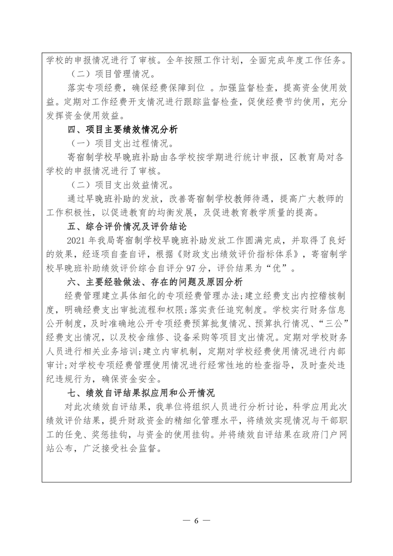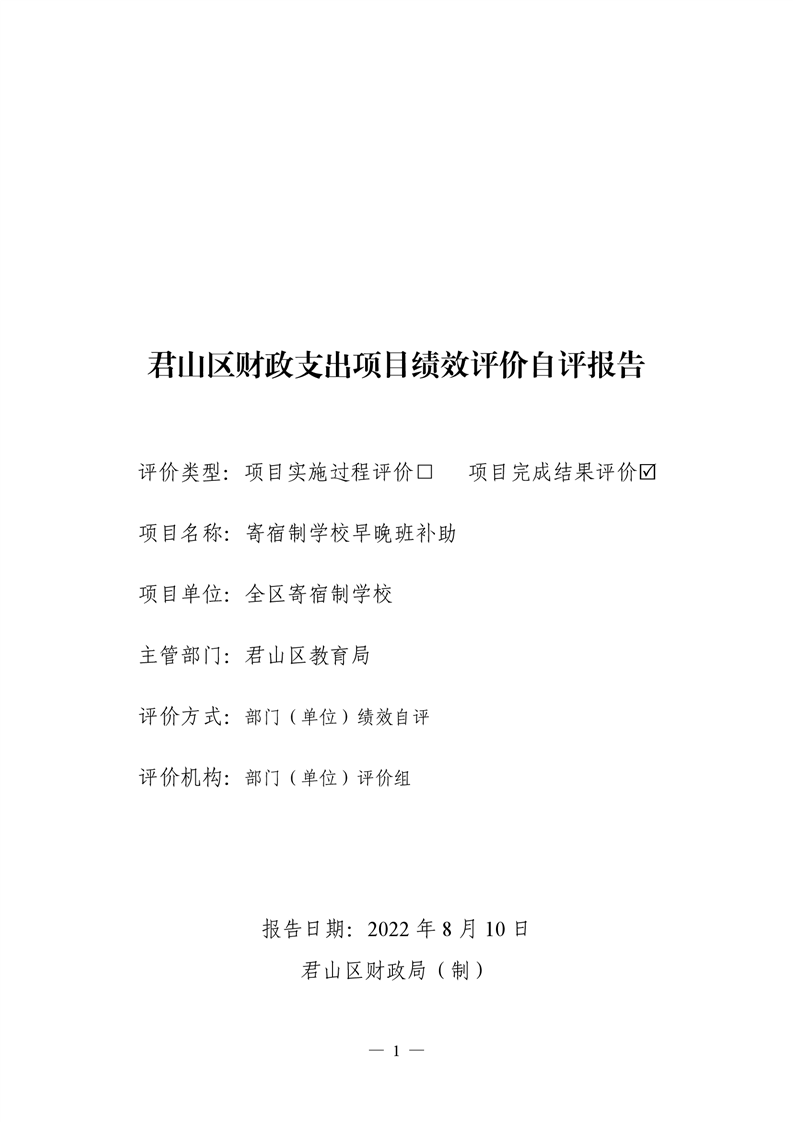 2021年度君山区教育局寄宿制学校早晚班补助项目绩效评价自评报告