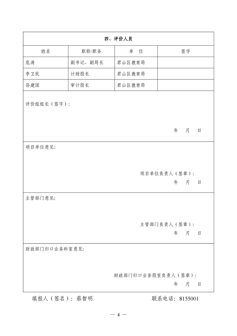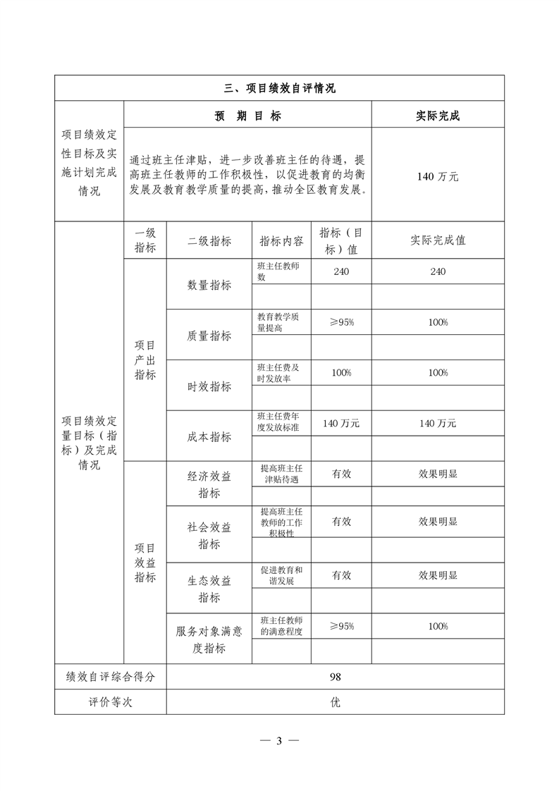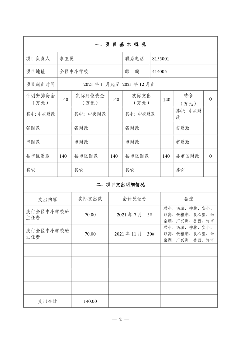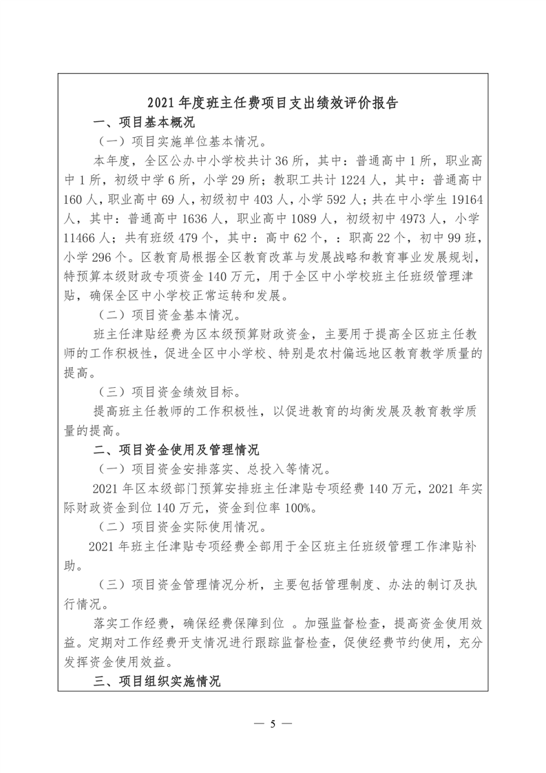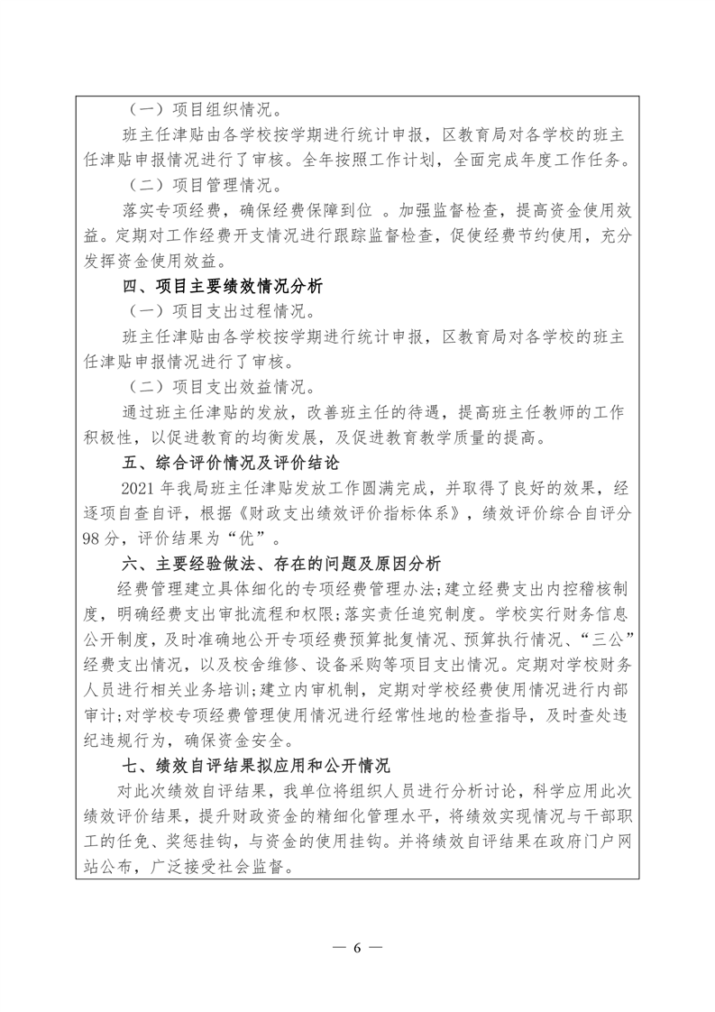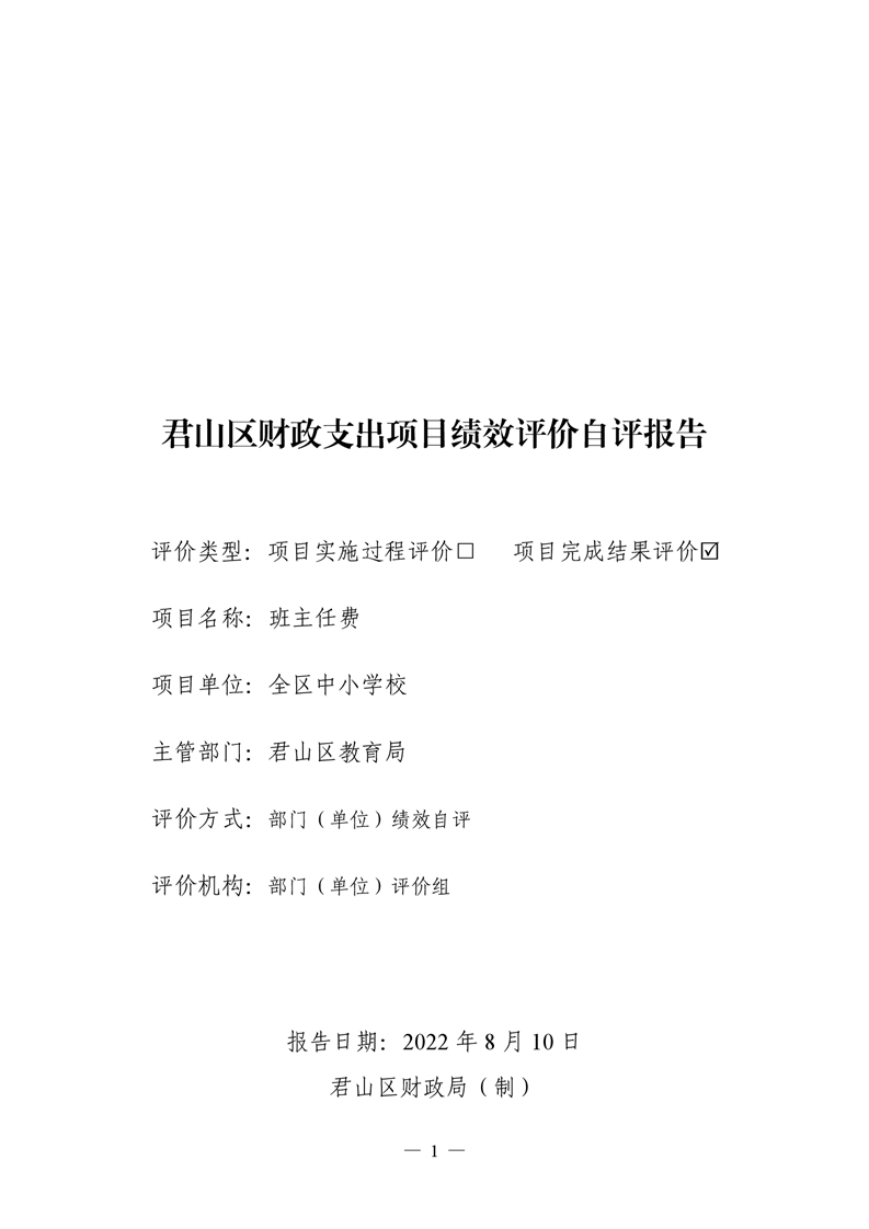 2021年度君山区教育局班主任费项目绩效评价自评报告