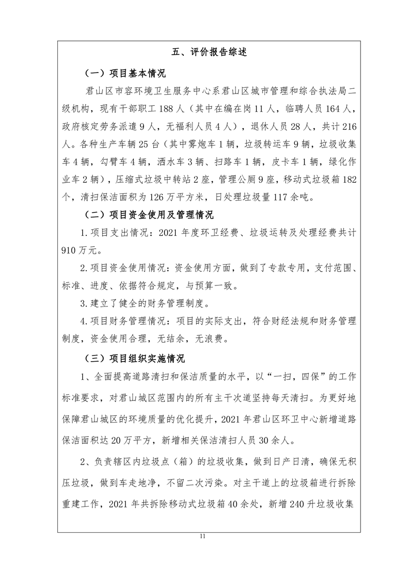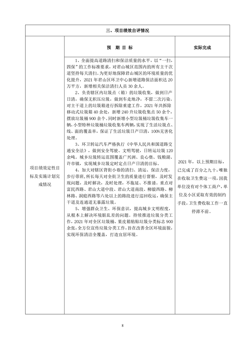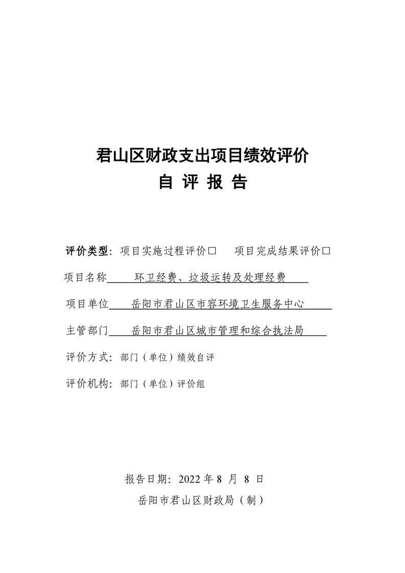 2021年度君山区城管局环卫经费、垃圾运转及处理经费项目绩效评价自评报告