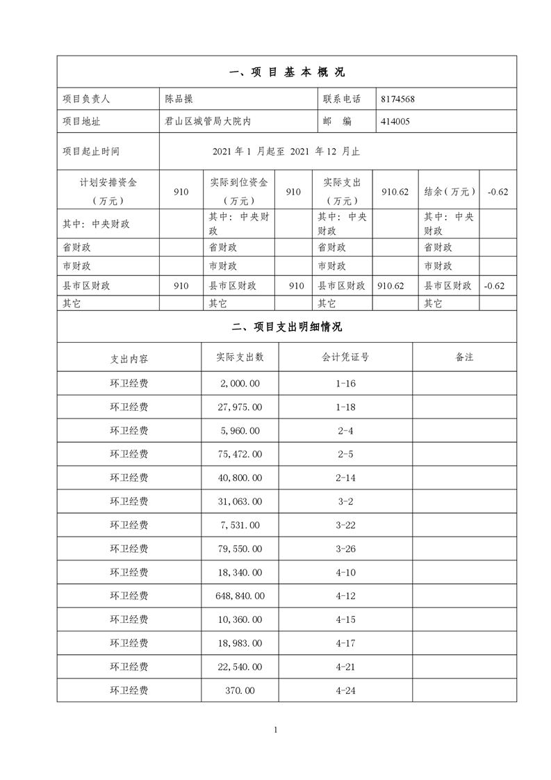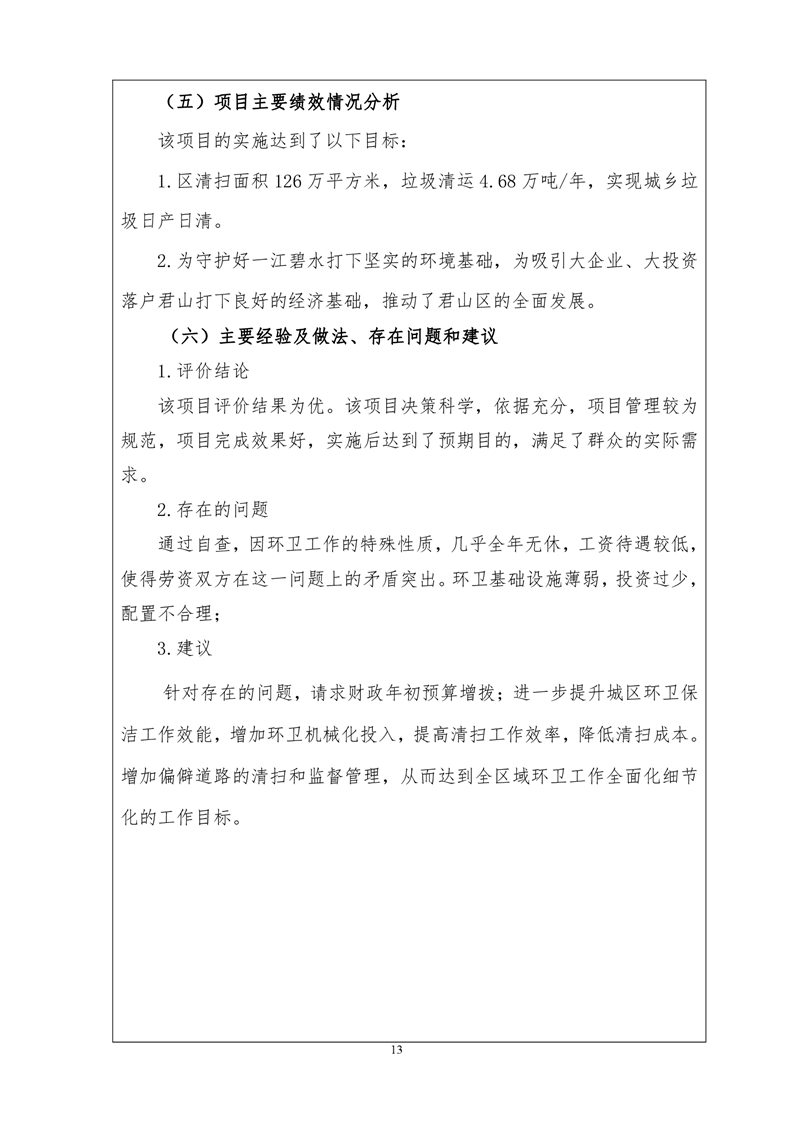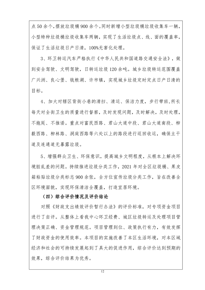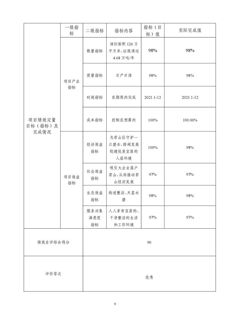 2021年度君山区城管局环卫经费、垃圾运转及处理经费项目绩效评价自评报告