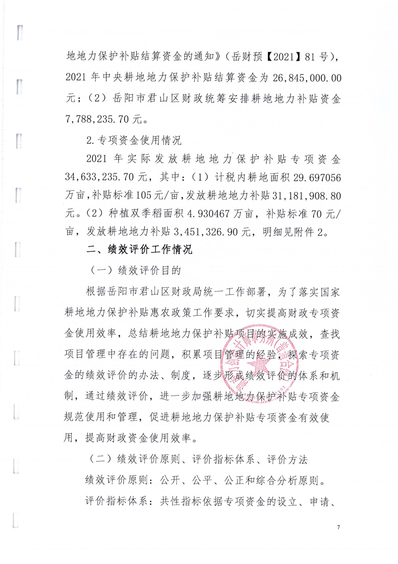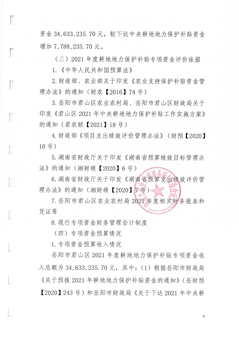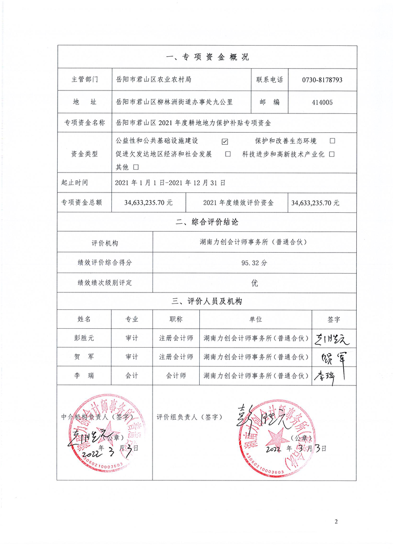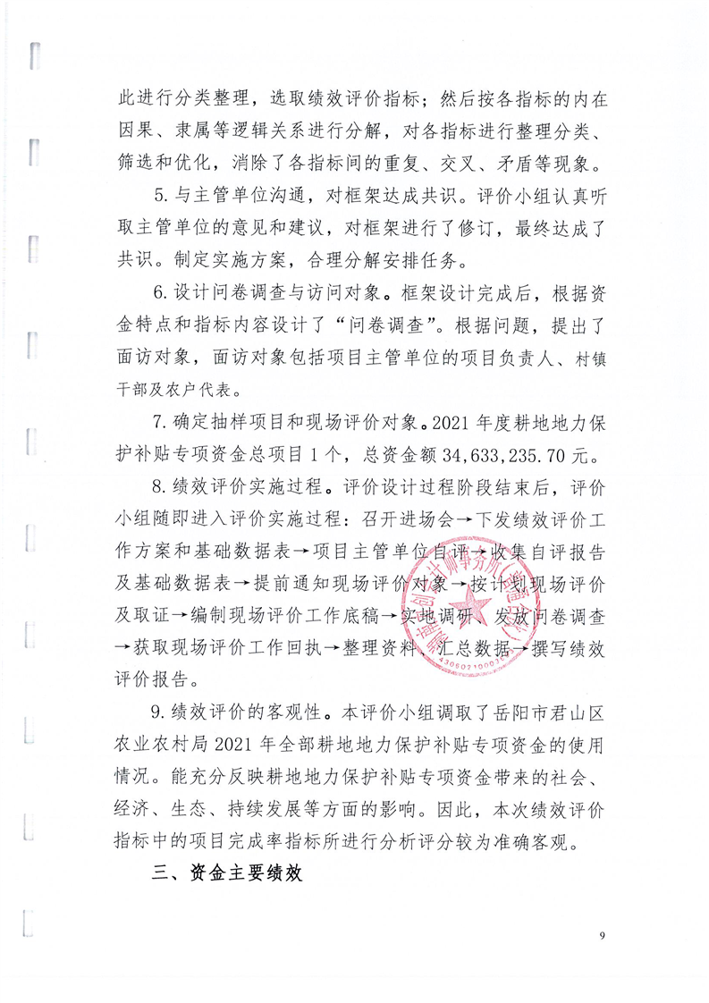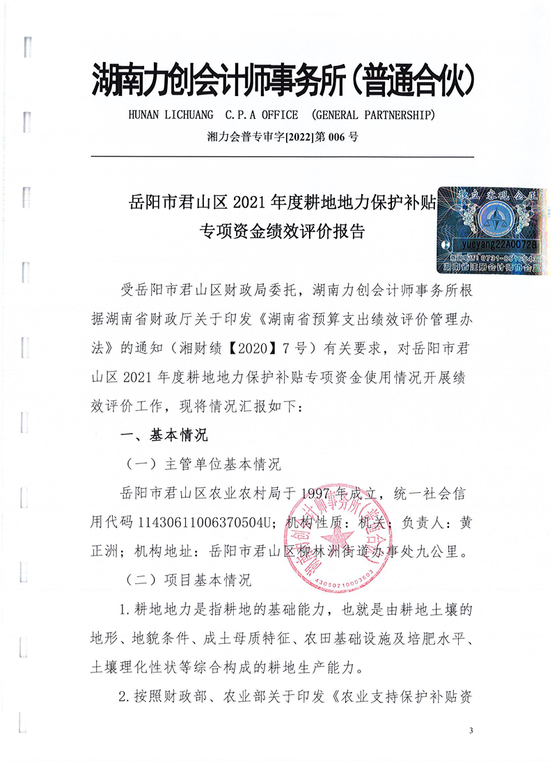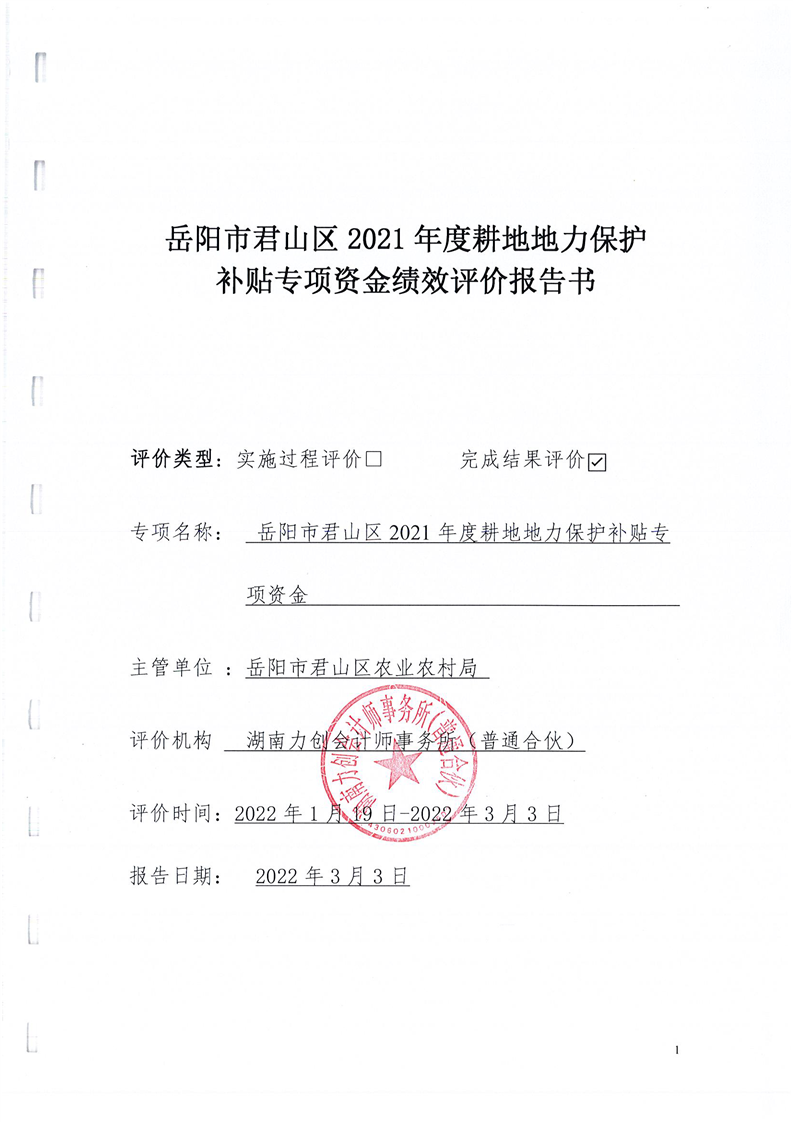 岳阳市君山区2021年度耕地地力保护补贴专项资金绩效评价报告书