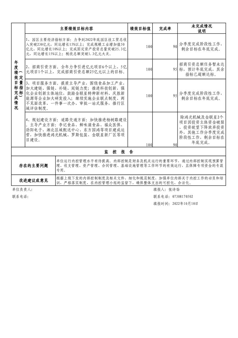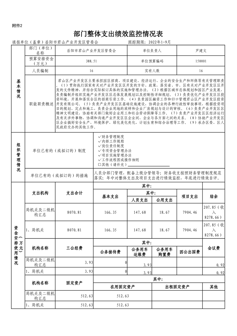 君山产业开发区管委会2022年度部门整体支出绩效监控情况表