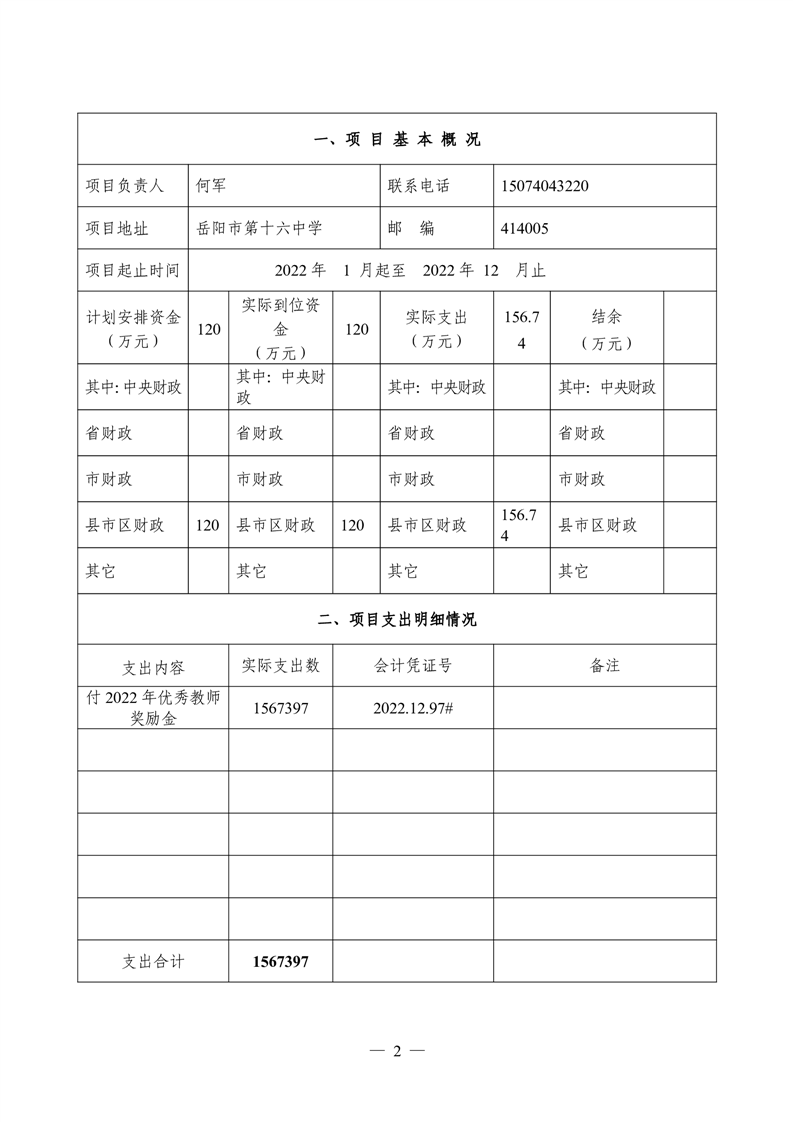 2022年度岳阳市第十六中学优秀教师奖励金项目绩效评价自评报告