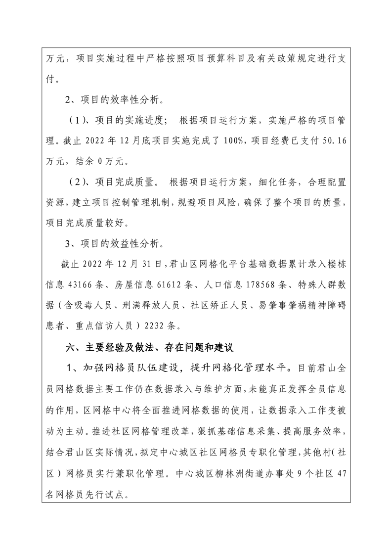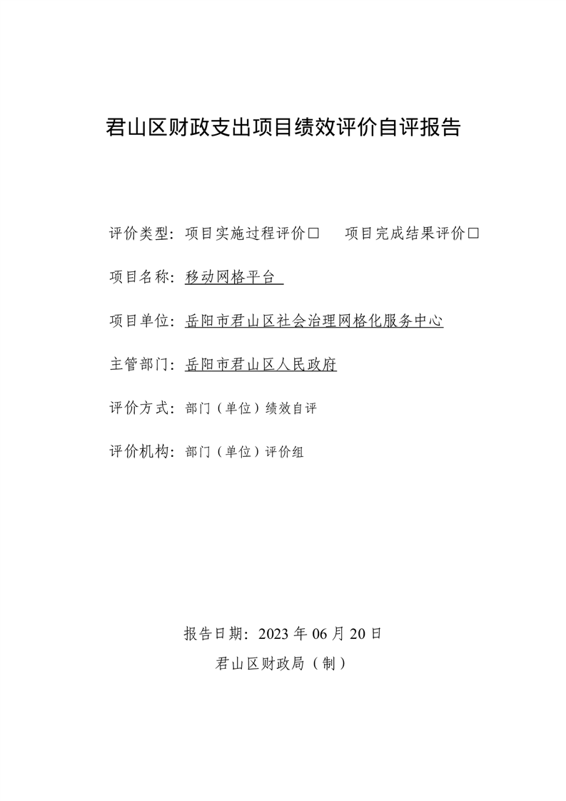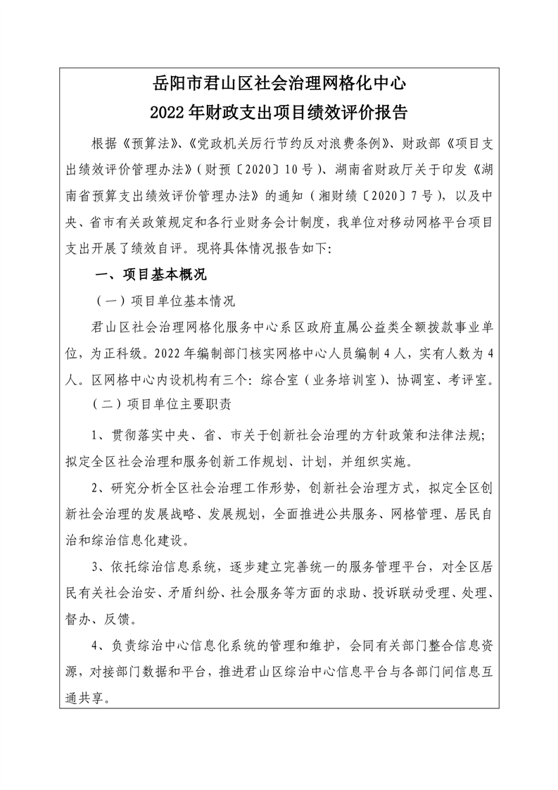 2022年度君山区社会治理网格化服务中心移动网格平台项目绩效评价自评报告
