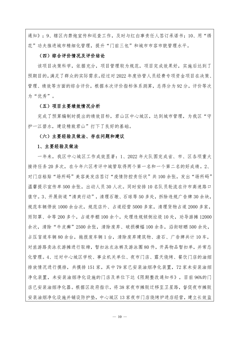 2022年度城管综合行政执法大队协管人员经费项目绩效评价自评报告