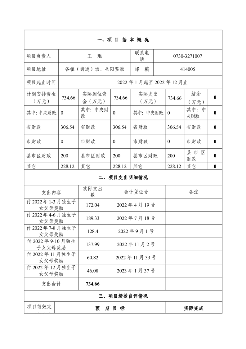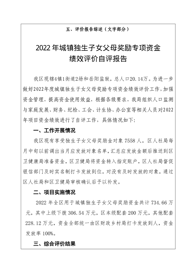 2022年度计生奖励扶助(城镇独生子女父母奖励)项目绩效评价自评报告