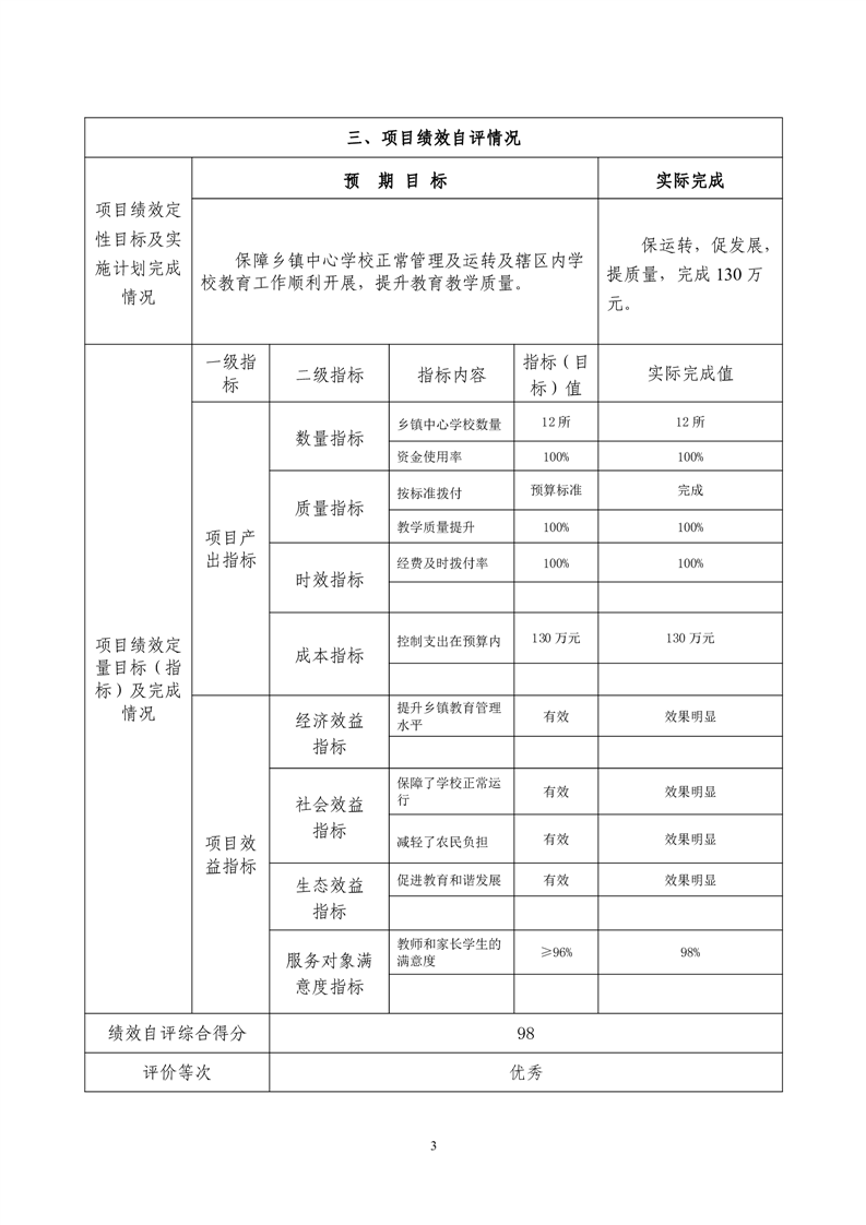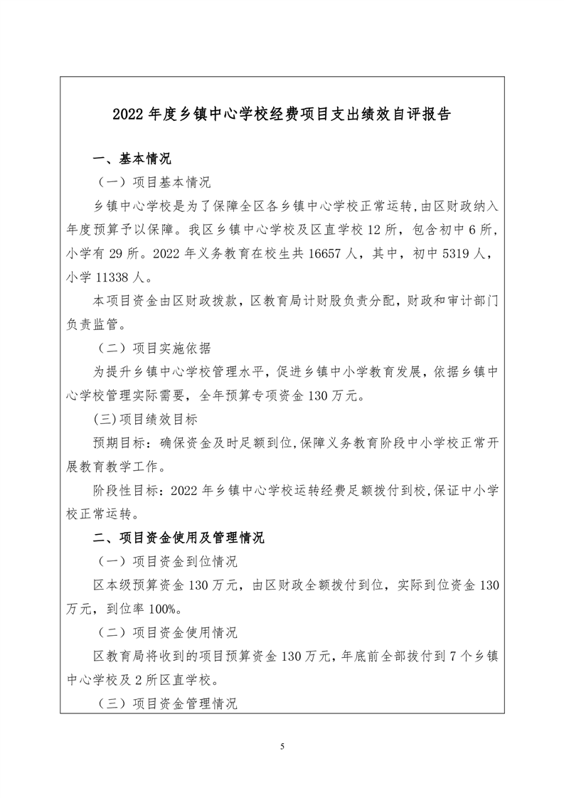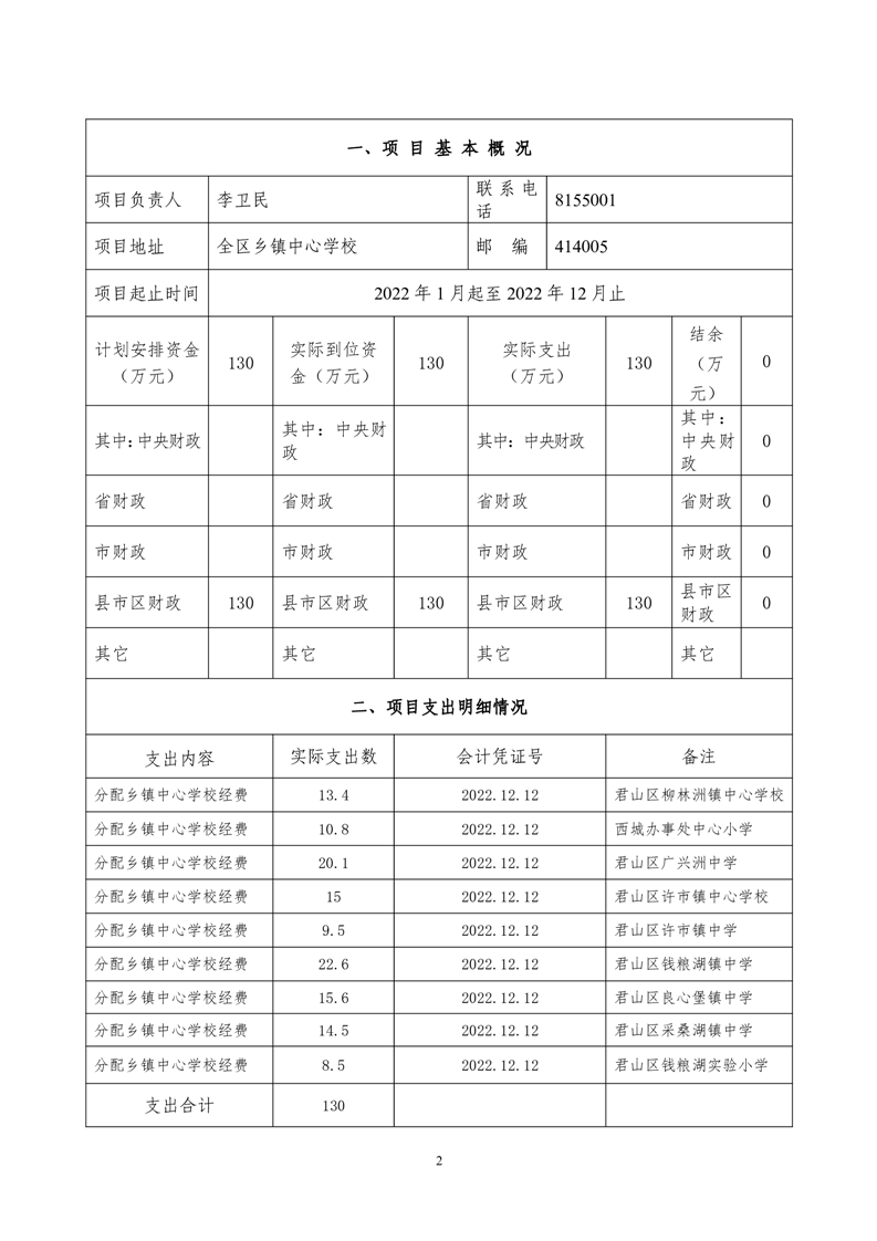 2022年度君山区教育局乡镇中心学校经费项目绩效评价自评报告