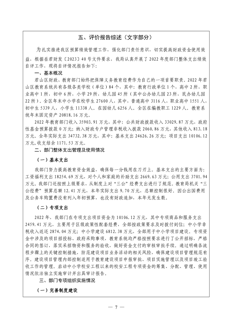 2022年度君山区教育局整体支出绩效自评报告