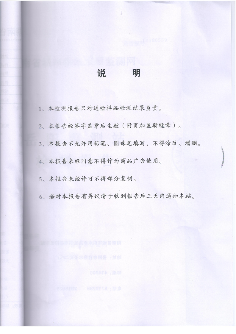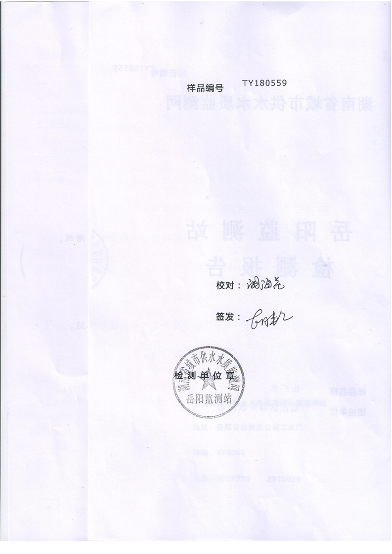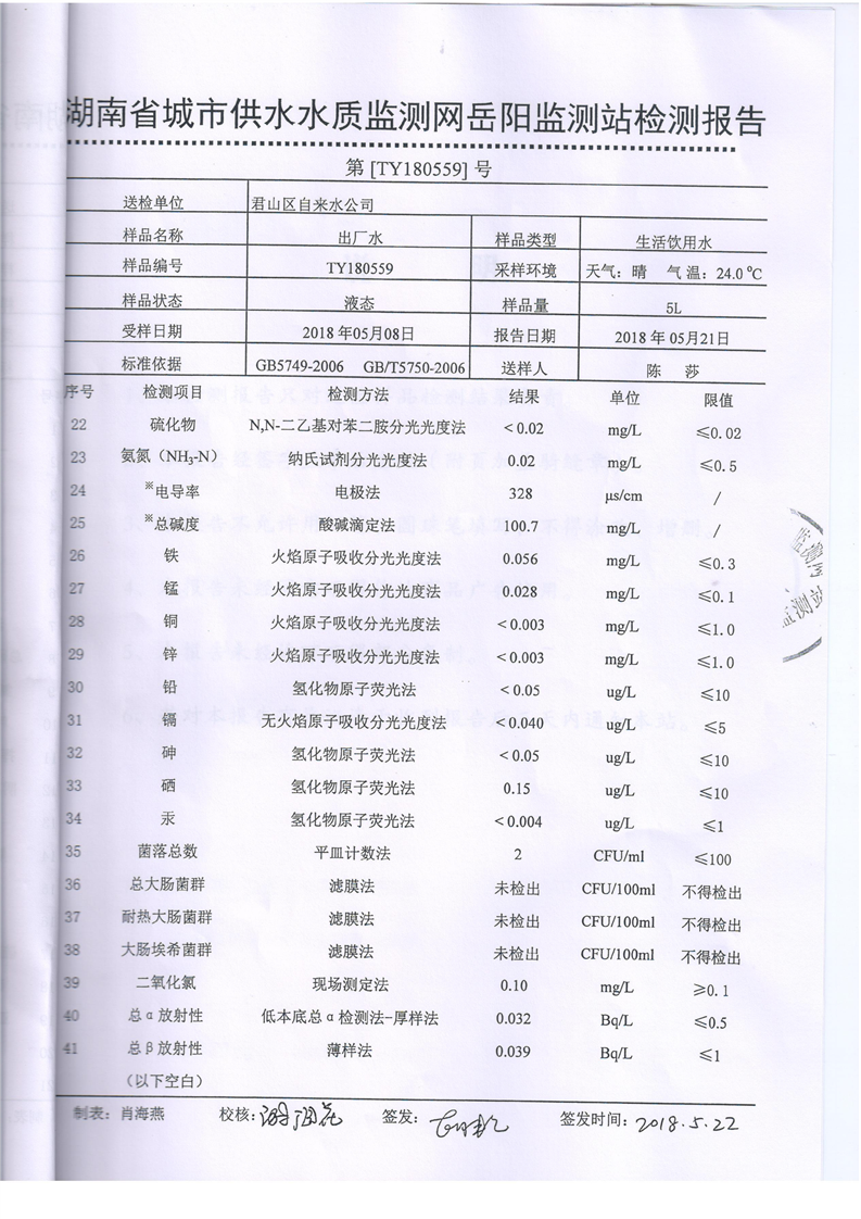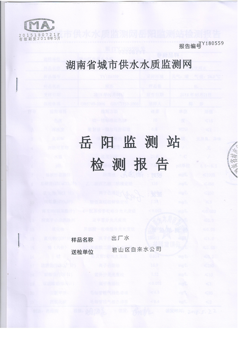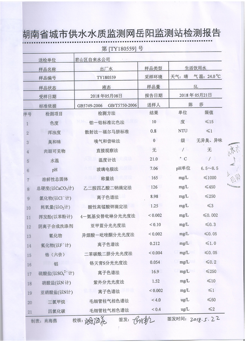君山区自来水公司2018年5月水质监测结果