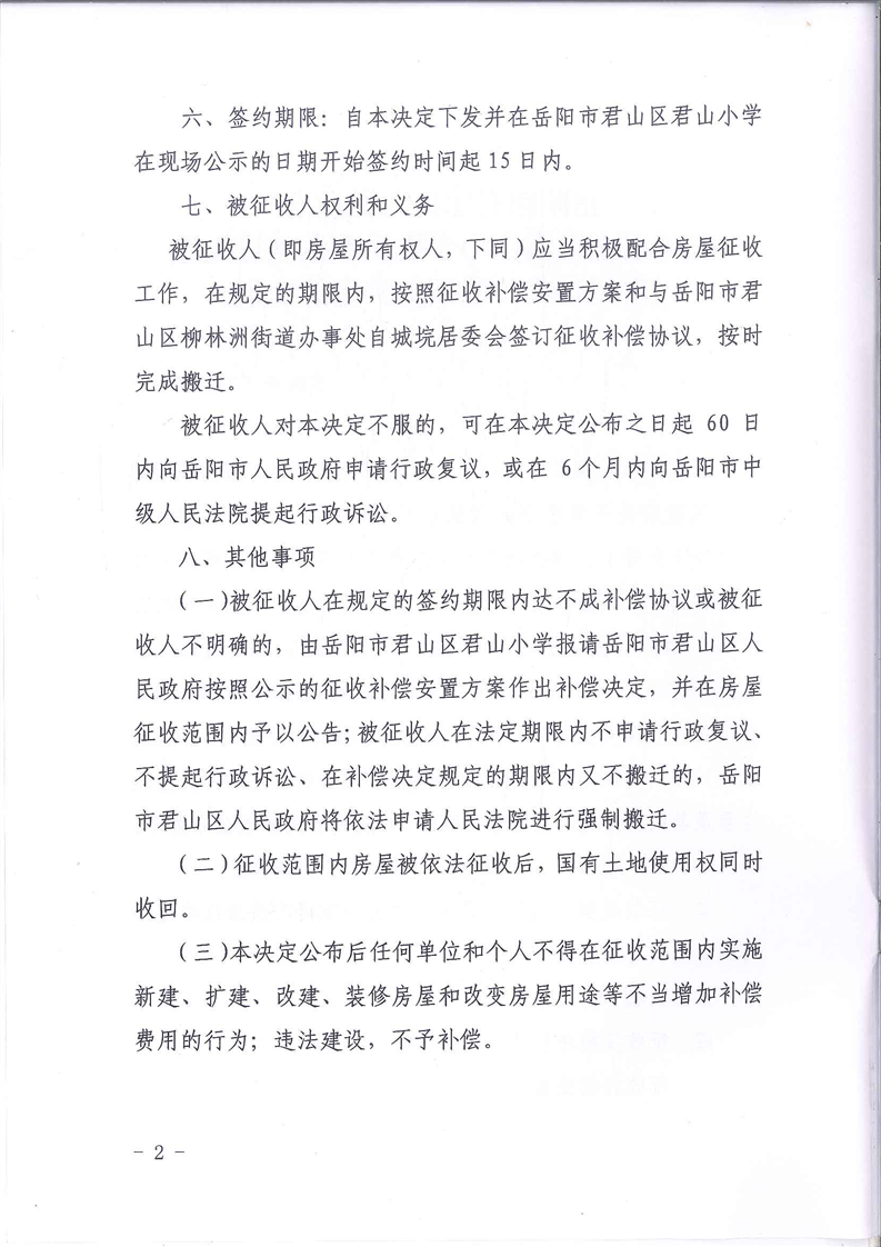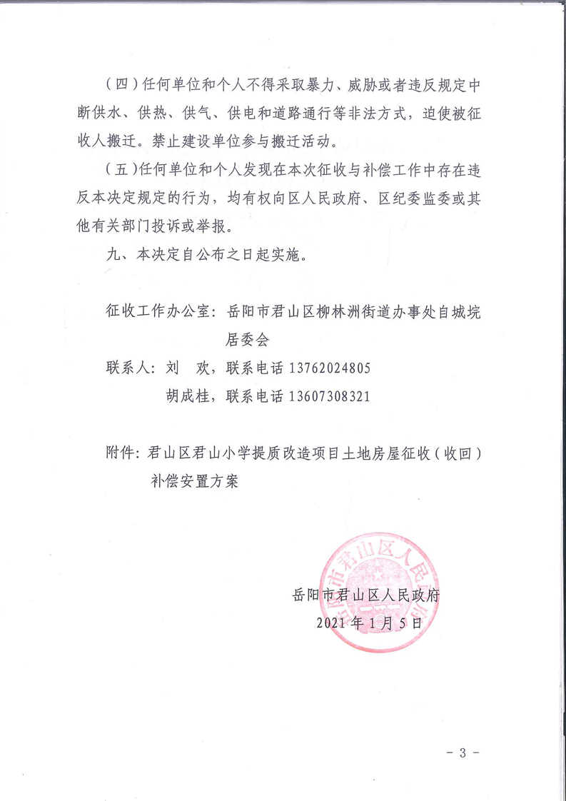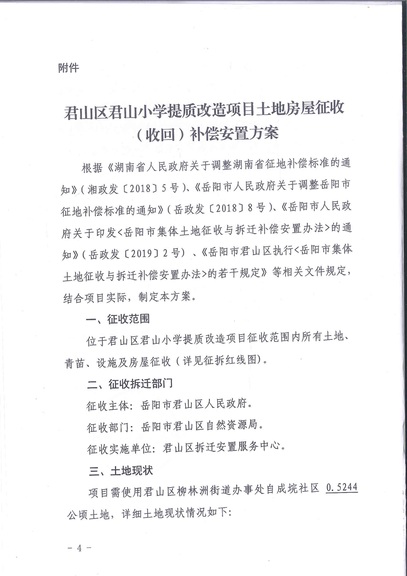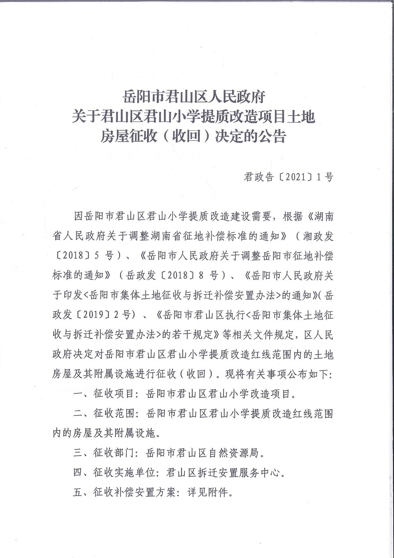 岳阳市君山区人民政府关于君山区君山小学提质改造项目土地房屋征收(收回)决定的公告