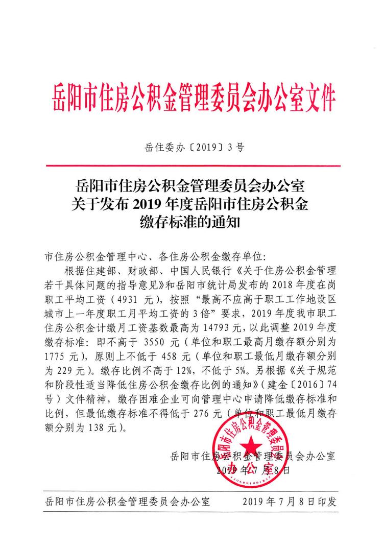 关于发布2019年度岳阳市住房公积金缴存标准的通知