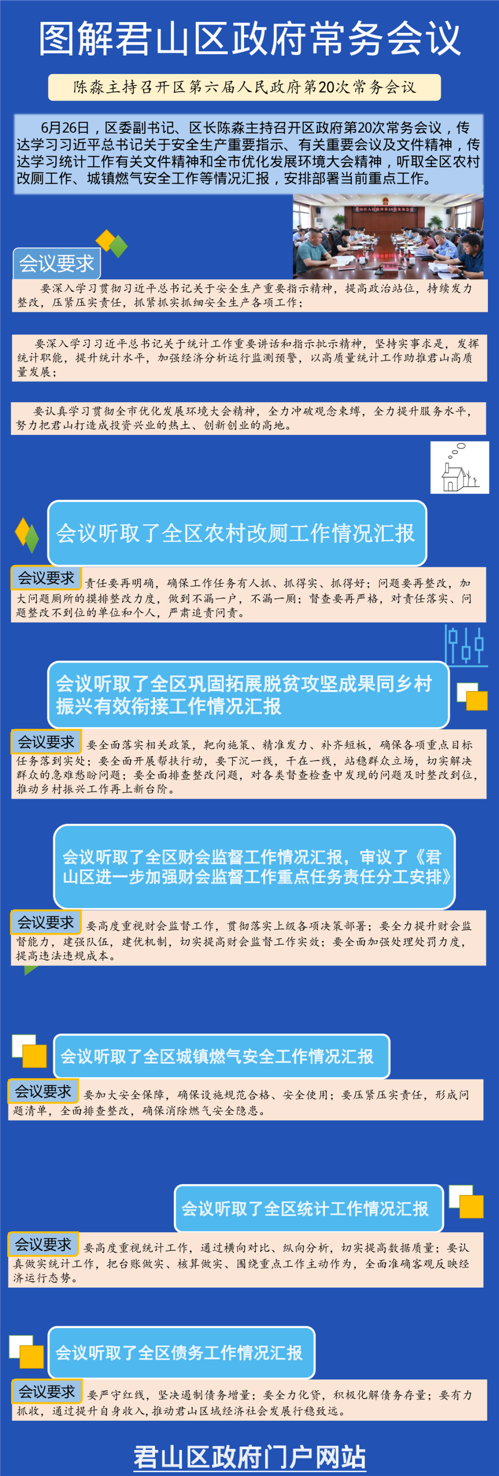 会议要求,要深入学习贯彻习近平总书记关于安全生产重要指示精神,提高政治站位,持续发力整改,压紧压实责任,抓紧抓实抓细安全生产各项工作;要深入学习习近平总书记关于统计工作重要讲话和指示批示精神,坚持实事求是,发挥统计职能,提升统计水平,加强经济分析运行监测预警,以高质量统计工作助推君山高质量发展;要认真学习贯彻全市优化发展环境大会精神,全力冲破观念束缚,全力提升服务水平,努力把君山打造成投资兴业的热土、创新创业的高地。
