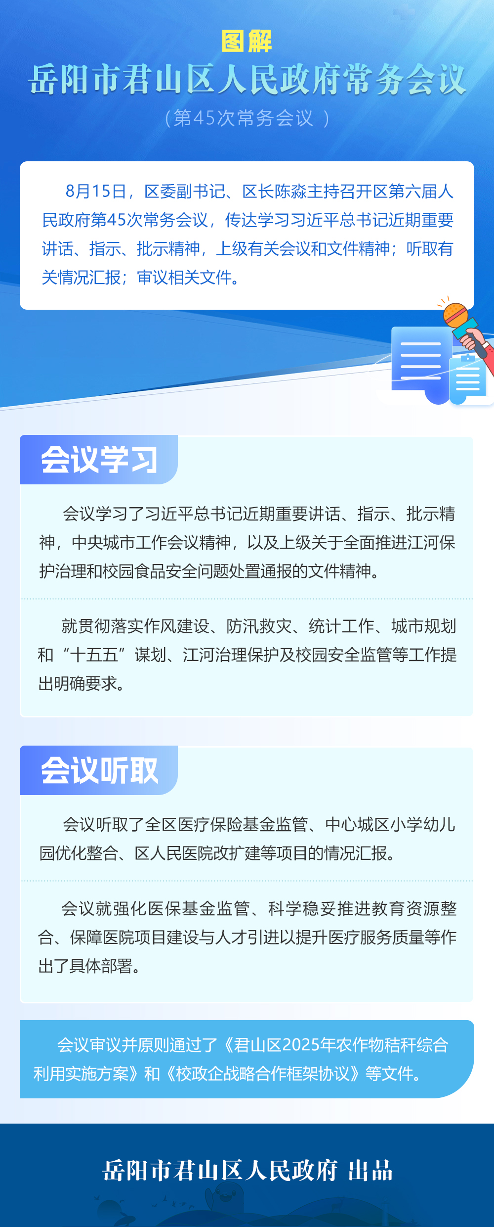 会议审议并原则通过了《君山区2025年农作物秸秆综合利用实施方案》《校政企战略合作框架协议》等文件。