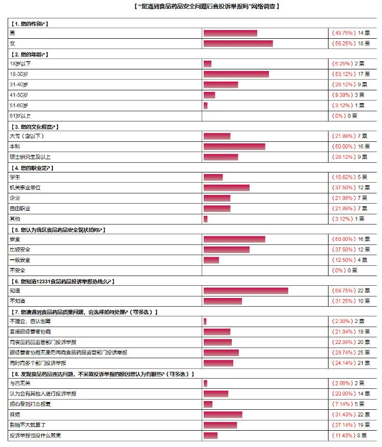 为更好地了解广大人民群众遇到食品药品安全问题后的处理情况,以及对我区食品药品投诉举报工作的了解情况,开展本次网络调查。 此表仅做收集信息使用,采取不记名填写方式,不涉及隐私,请放心填写。