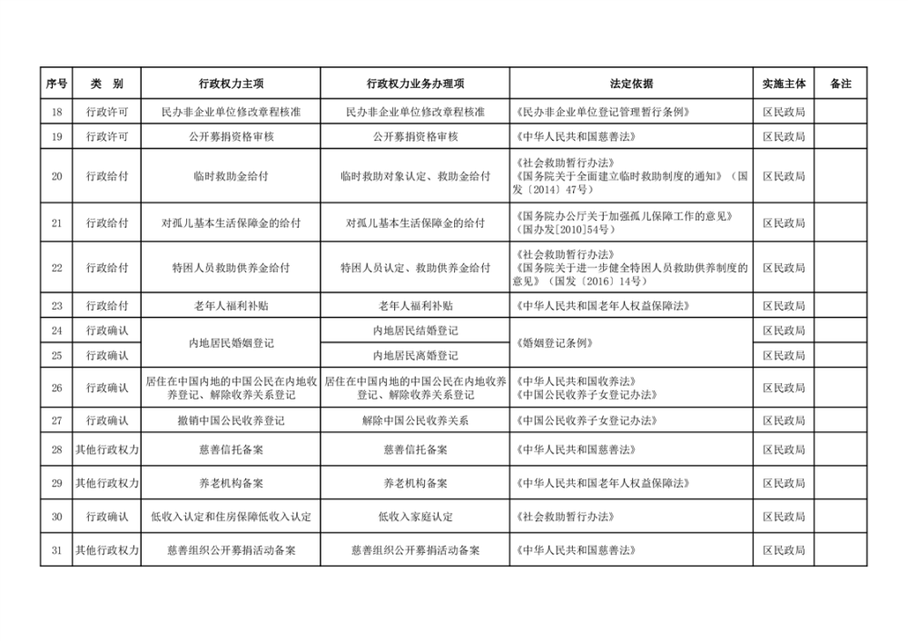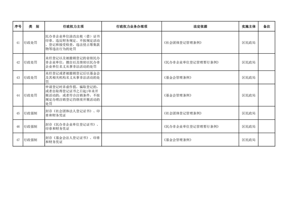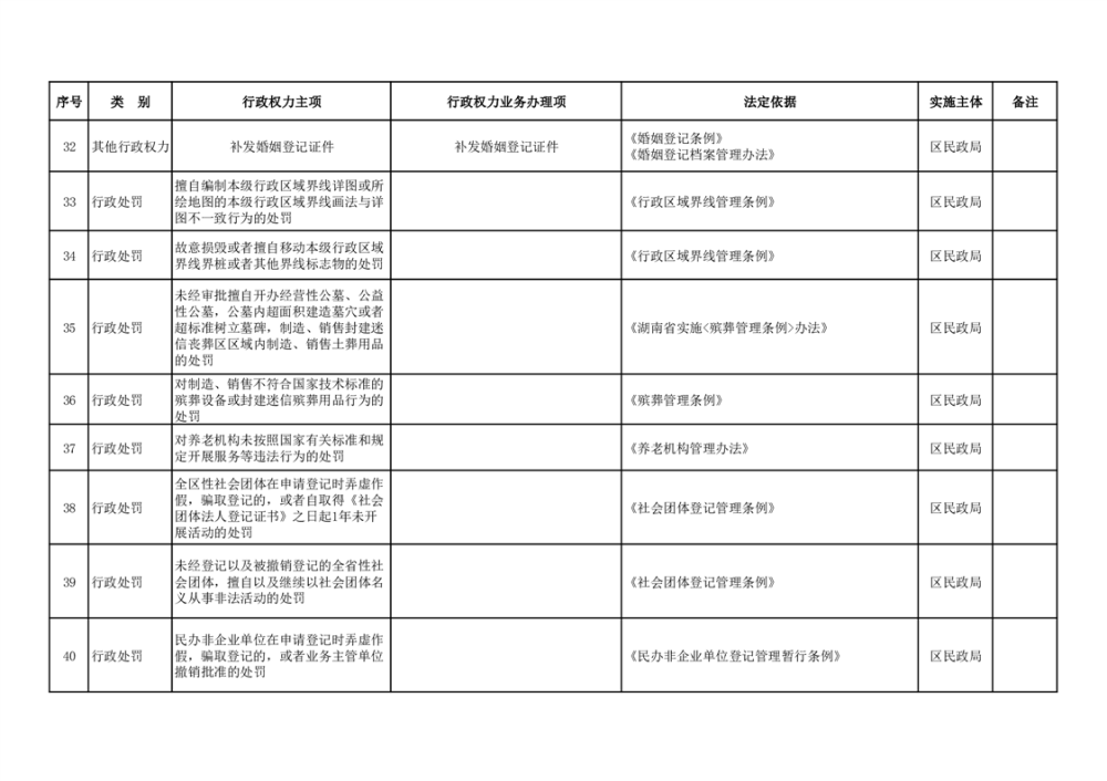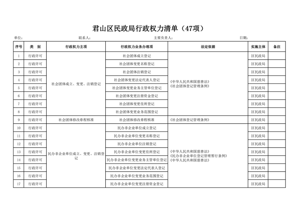 君山区民政局行政权力清单(47项)