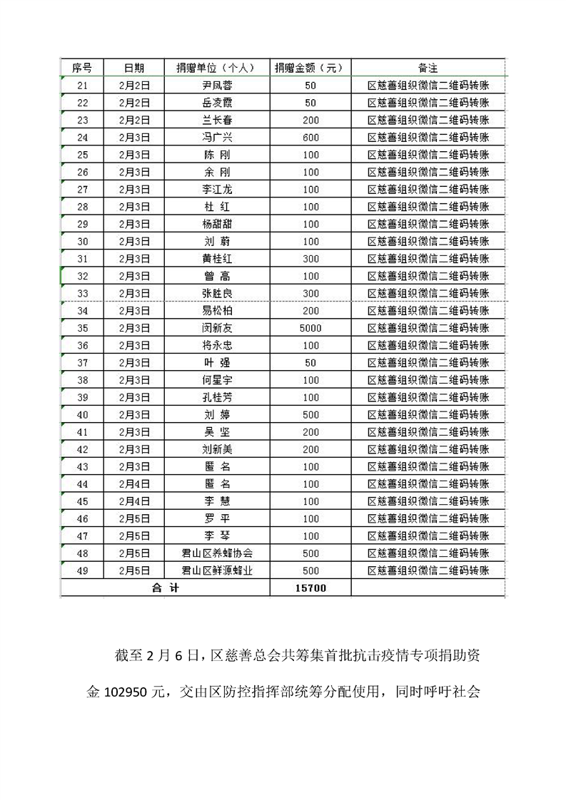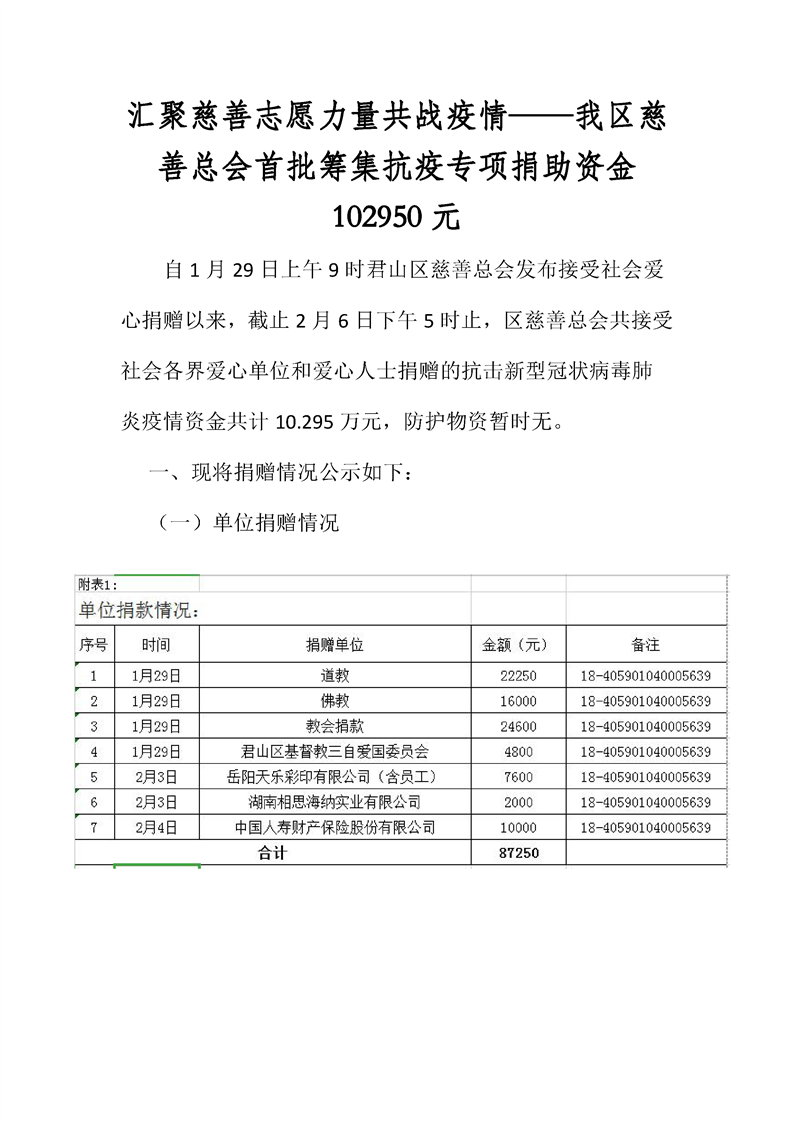 君山区慈善总会接收社会捐赠情况公示(第一期)