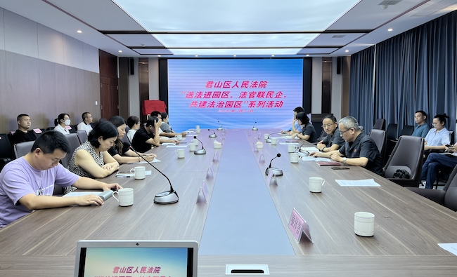 7月14日,湖南岳阳市君山区人民法院党组书记、院长柳春龙,审委会专职委员黄天赤一行到君山区产业园区,开展“送法进园区、法官联民企、共建法治园区”活动。