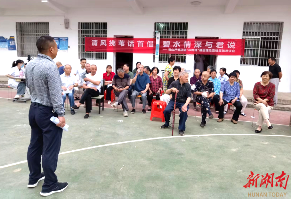 “习近平生态文明思想是我们把绿水青山变为金山银山的金钥匙……”6月2日,在君山芦苇总场二洲管理站居民大院一场面对面的“与君说”基层理论宣讲屋场恳谈会正在举行。