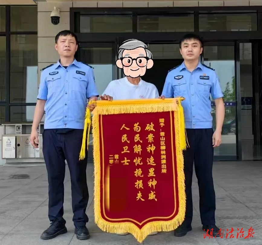 湖南法治报讯(通讯员 刘松)8月6日,岳阳市君山区柳林洲街道居民周先生专程来到岳阳市公安局君山分局柳林洲派出所,将一面印有“破案神速显神威 为民解忧挽损失”的锦旗送到办案民警手中,对公安机关迅速侦破其店铺被盗案件、及时挽回经济损失、有力维护辖区良好经商环境表示衷心感谢。