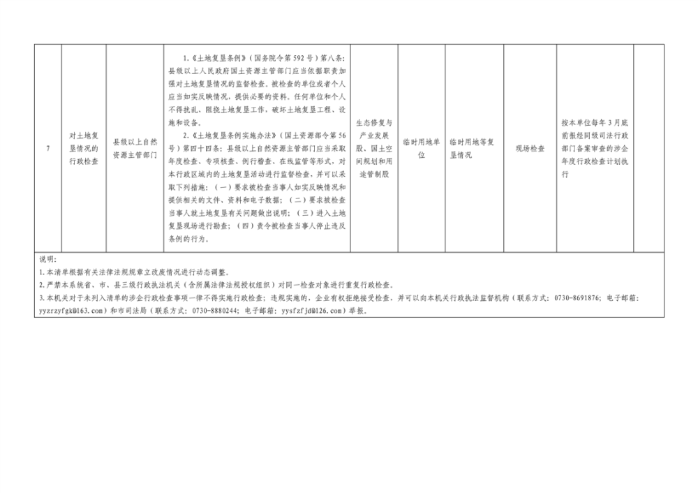 君山区自然资源局涉企行政检查事项清单