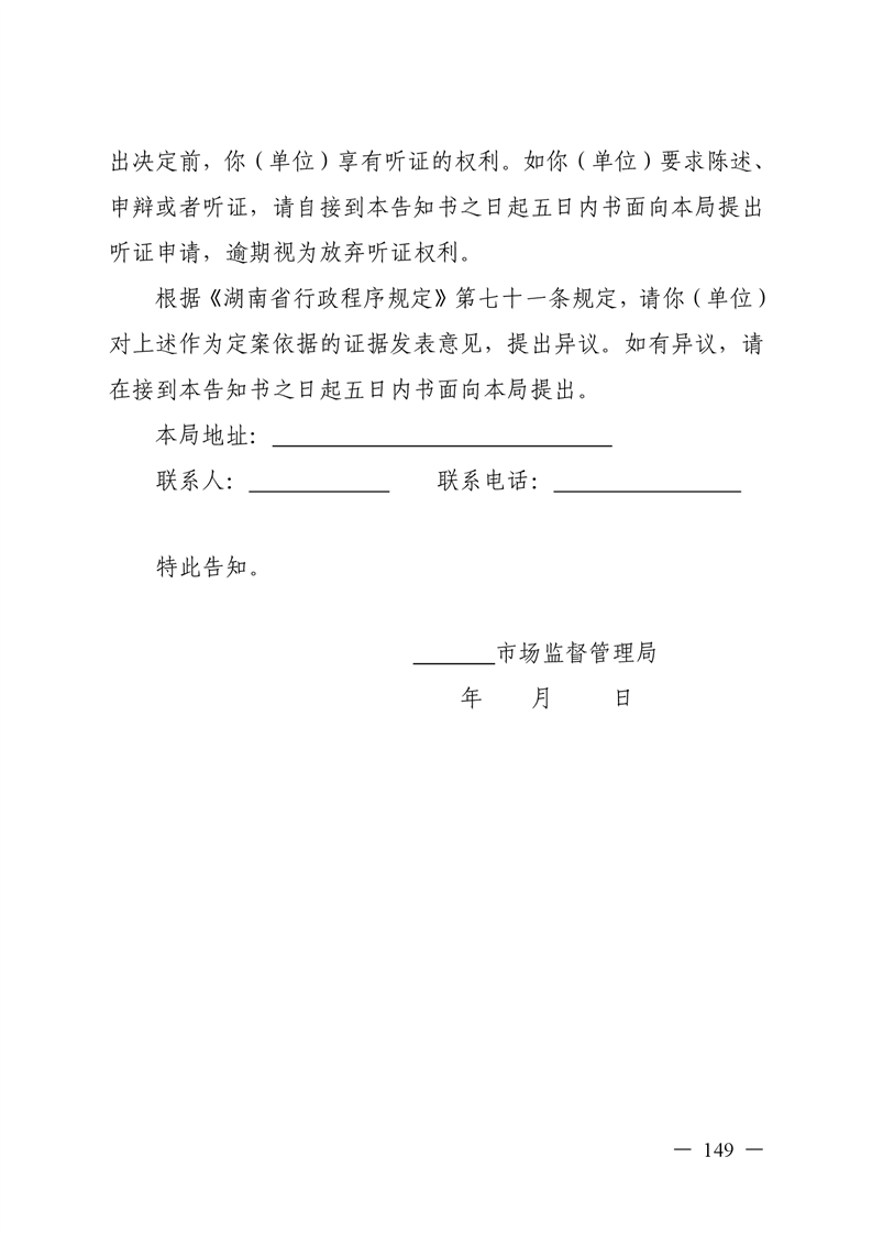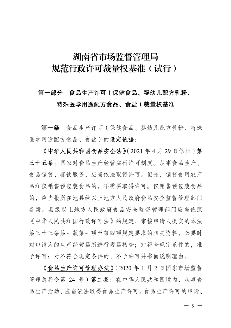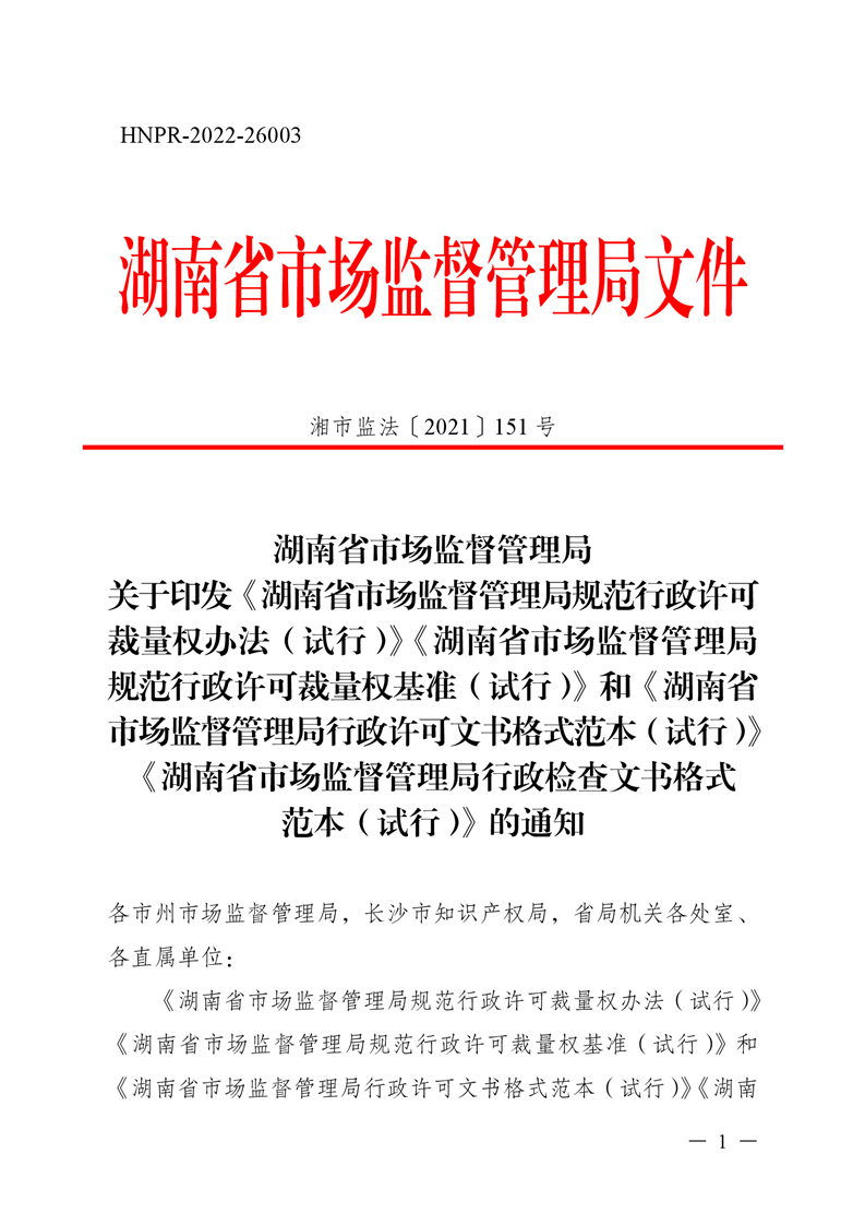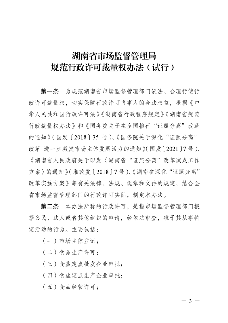 《湖南省市场监督管理局规范行政许可 裁量权办法(试行)》《湖南省市场监督管理局 规范行政许可裁量权基准(试行)》和《湖南省 市场监督管理局行政许可文书格式范本(试行)》 《湖南省市场监督管理局行政检查文书格式 范本(试行)》
