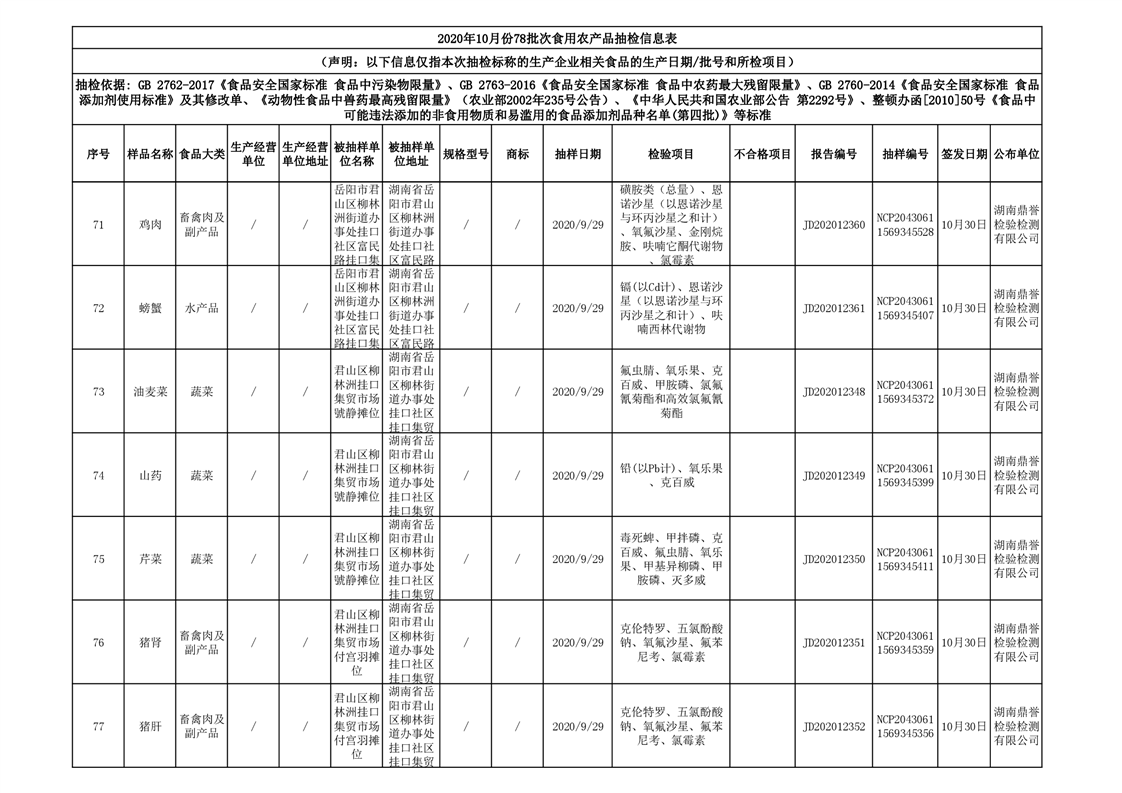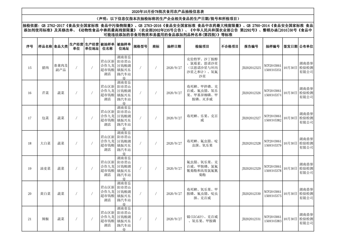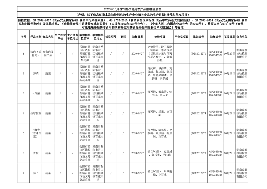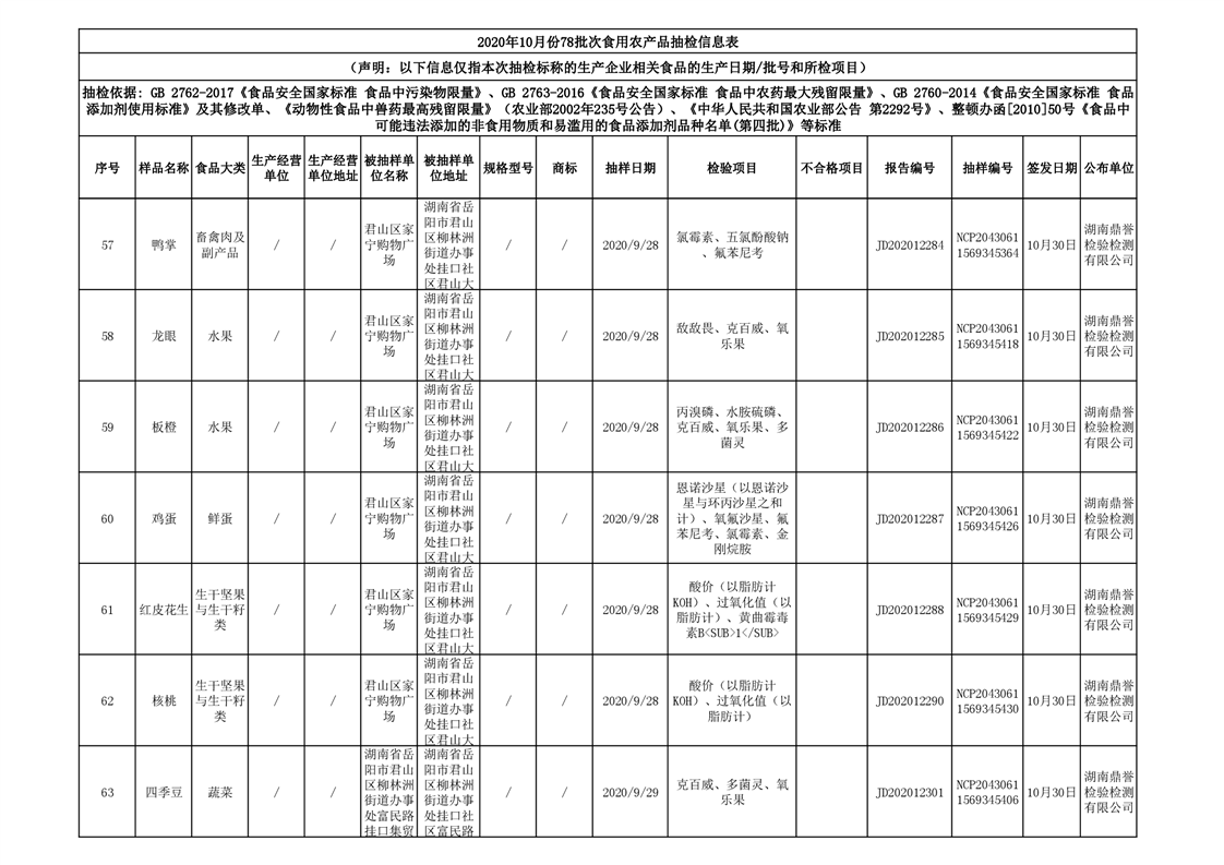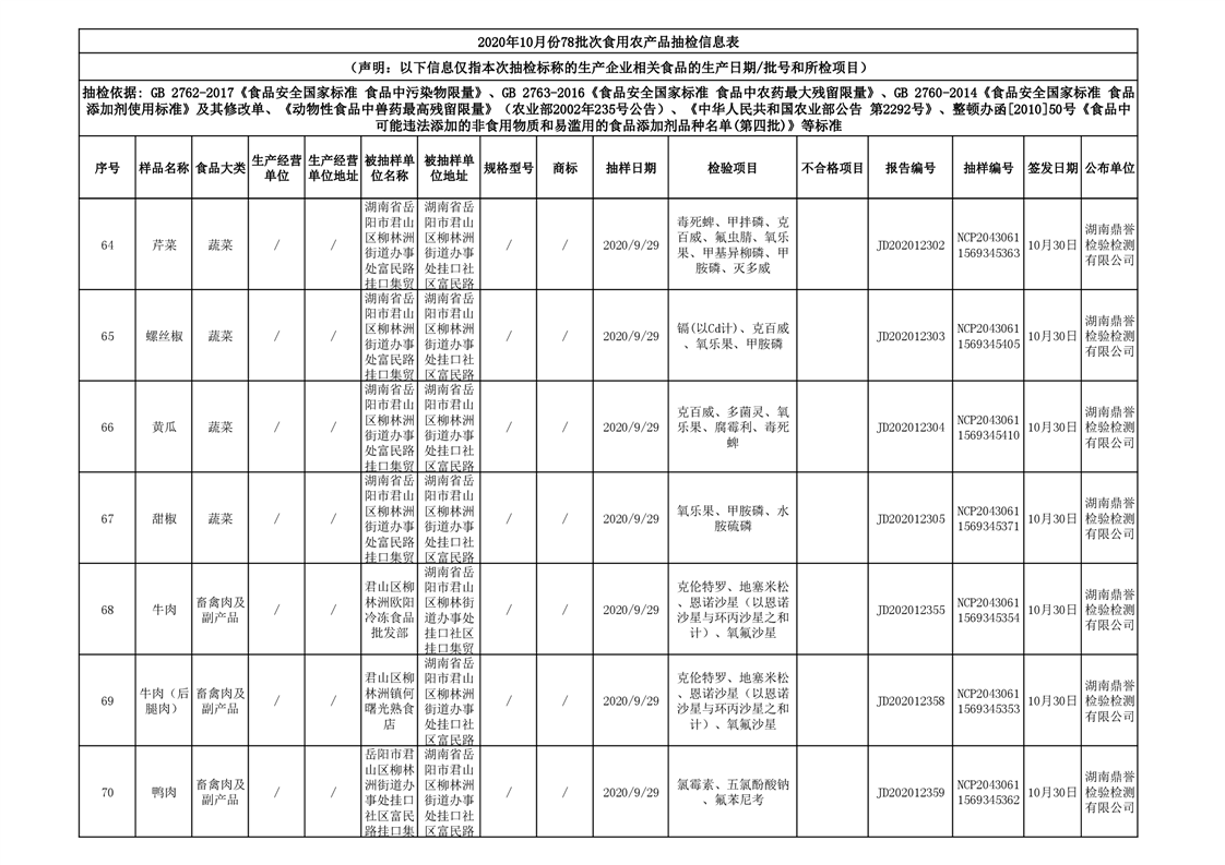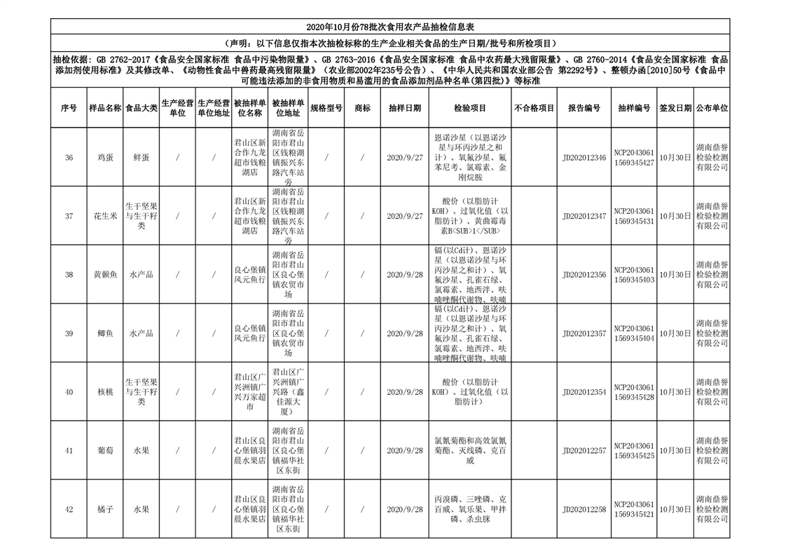 2020年10月份君山区食用农产品、普通食品抽检信息公示(共140批次)