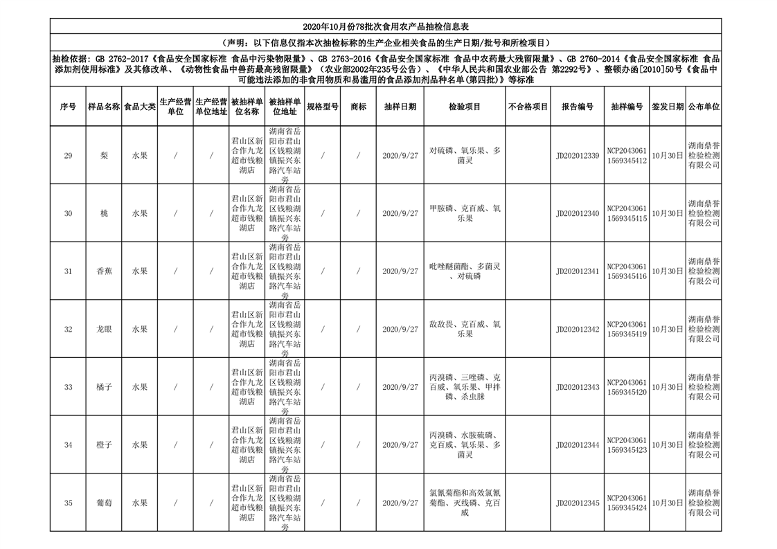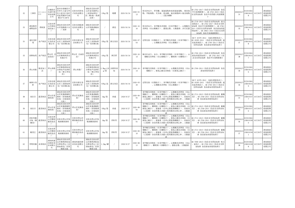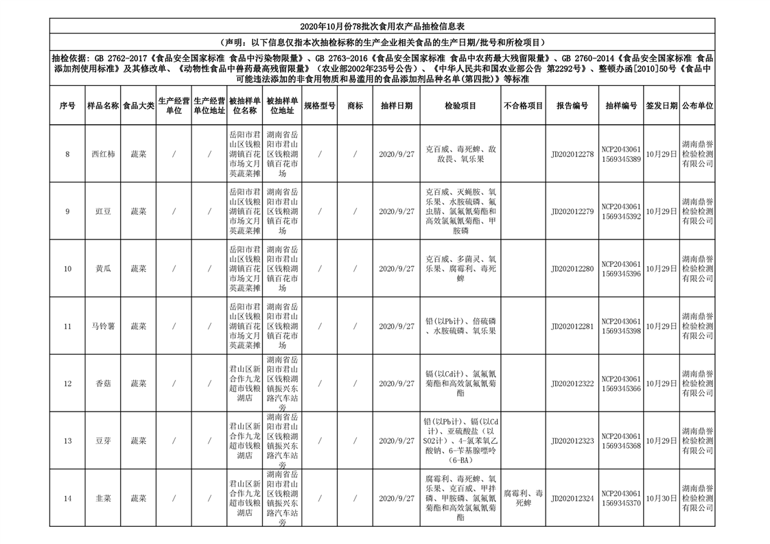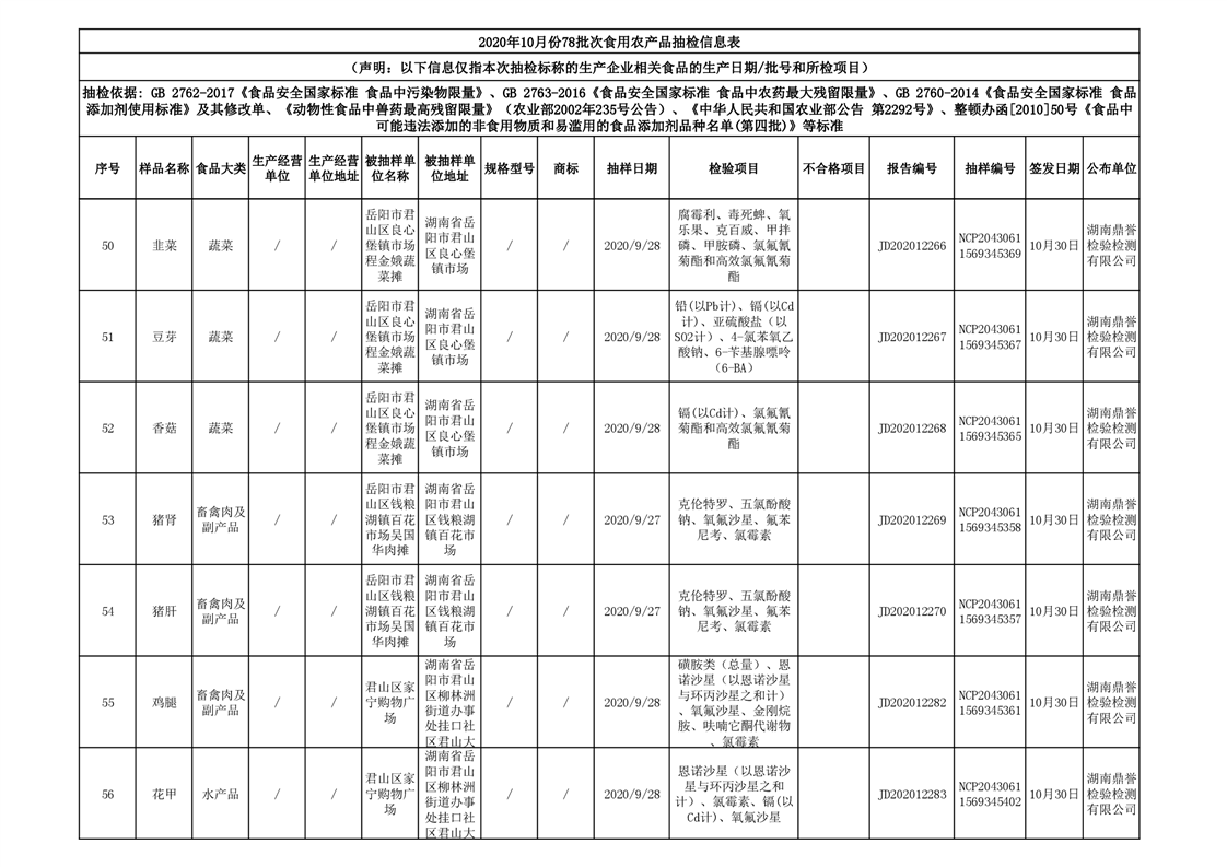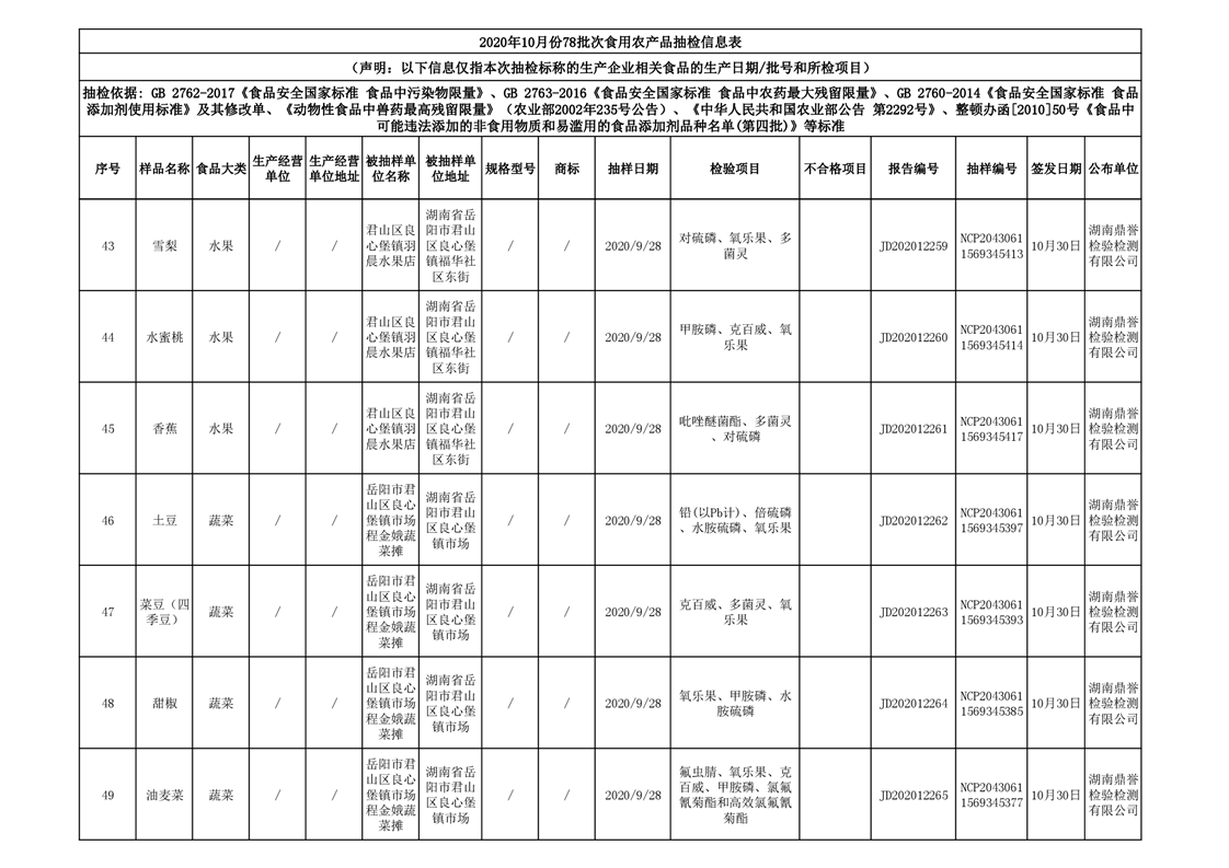 2020年10月份君山区食用农产品、普通食品抽检信息公示(共140批次)