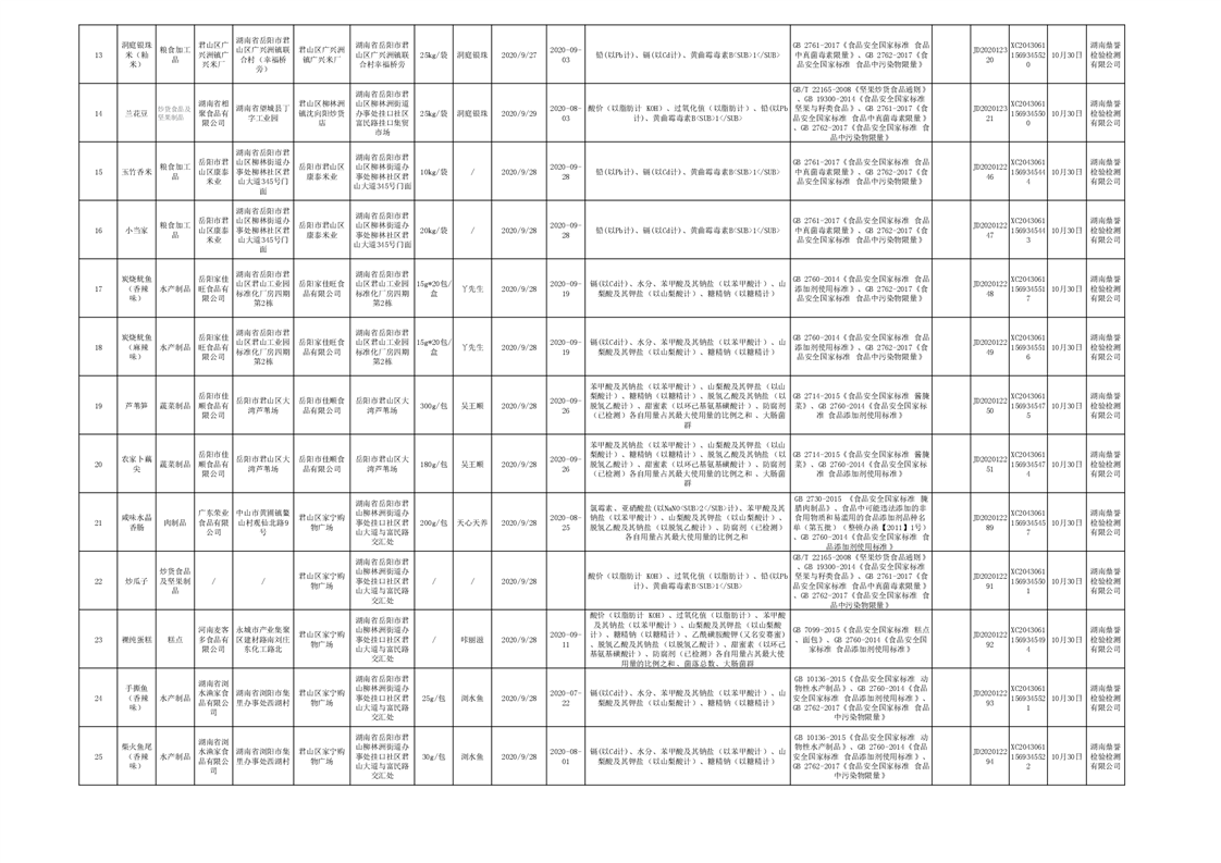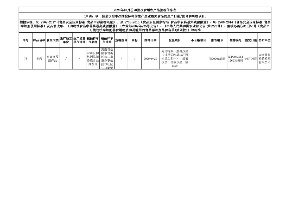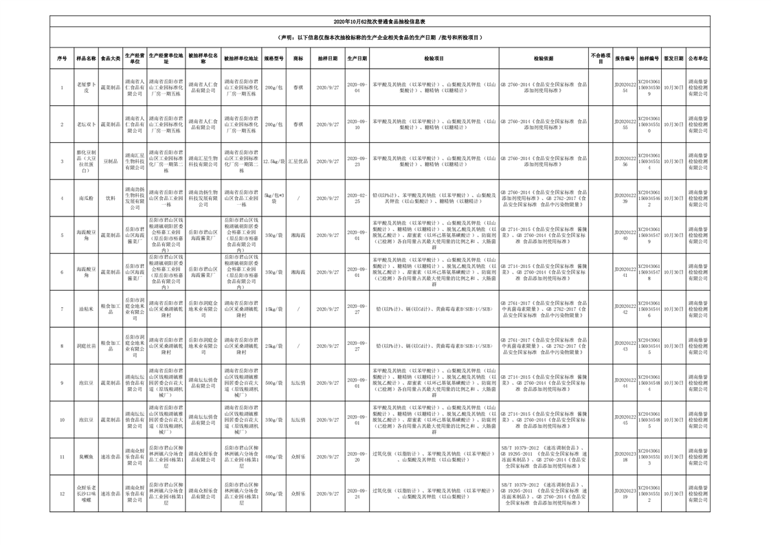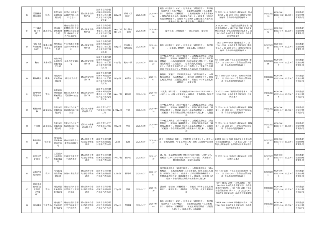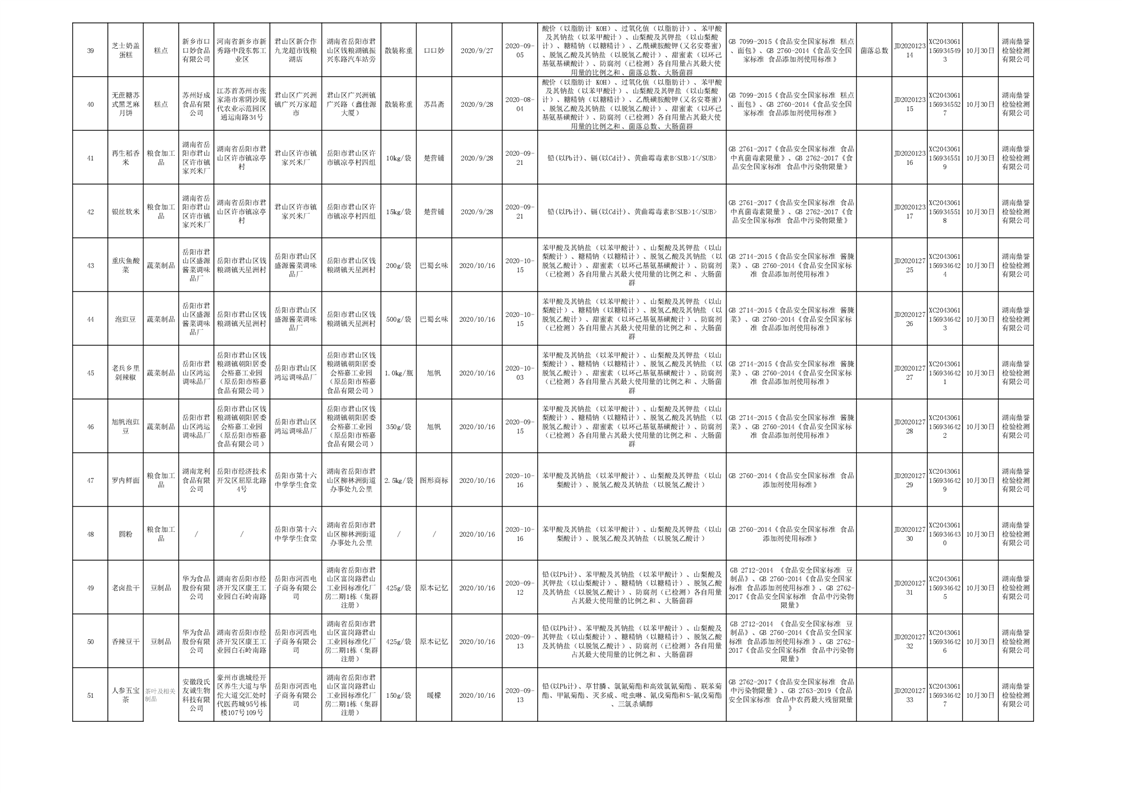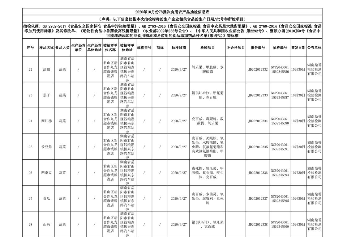 2020年10月份君山区食用农产品、普通食品抽检信息公示(共140批次)