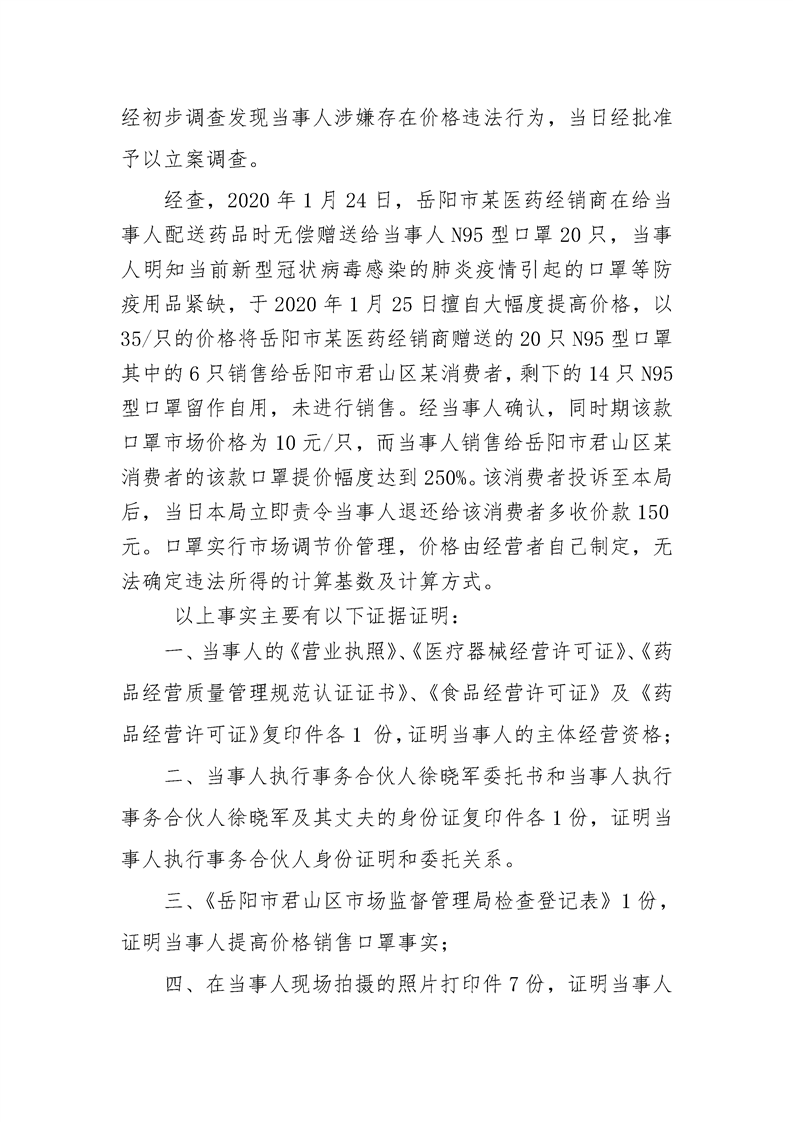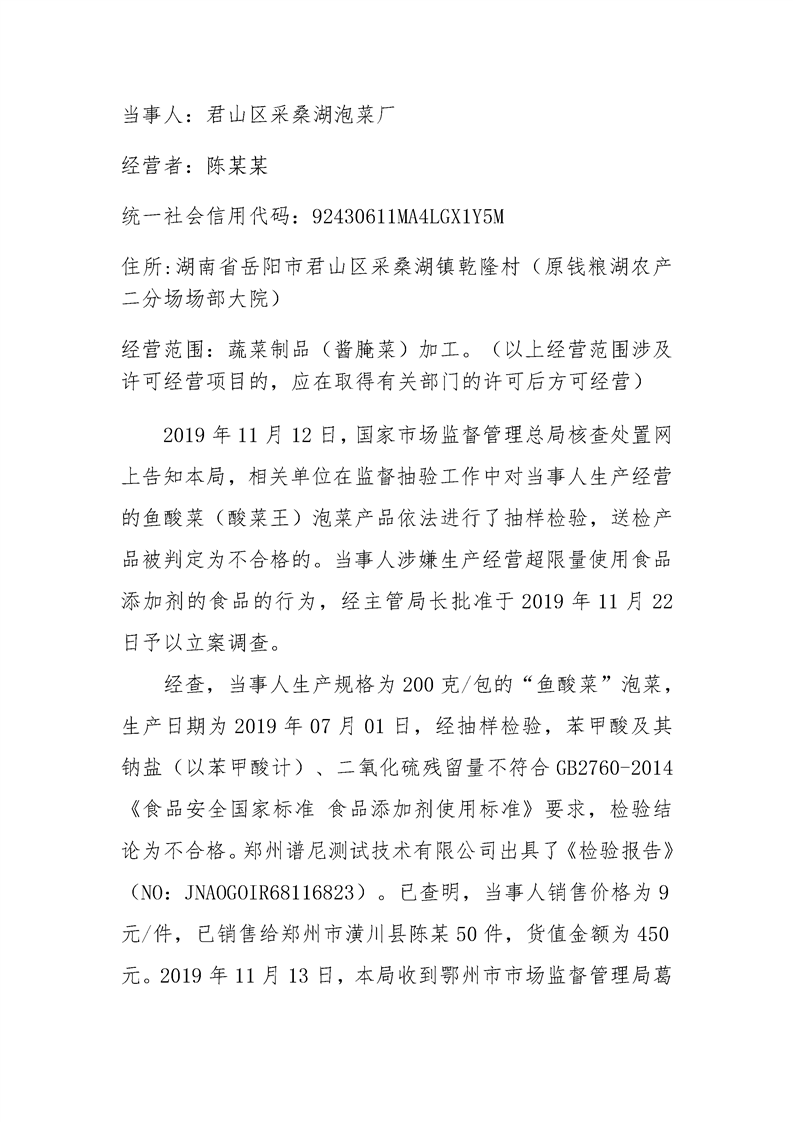 2020年4月君山区市场监督管理局行政处罚信息公开表及行政处罚决定书